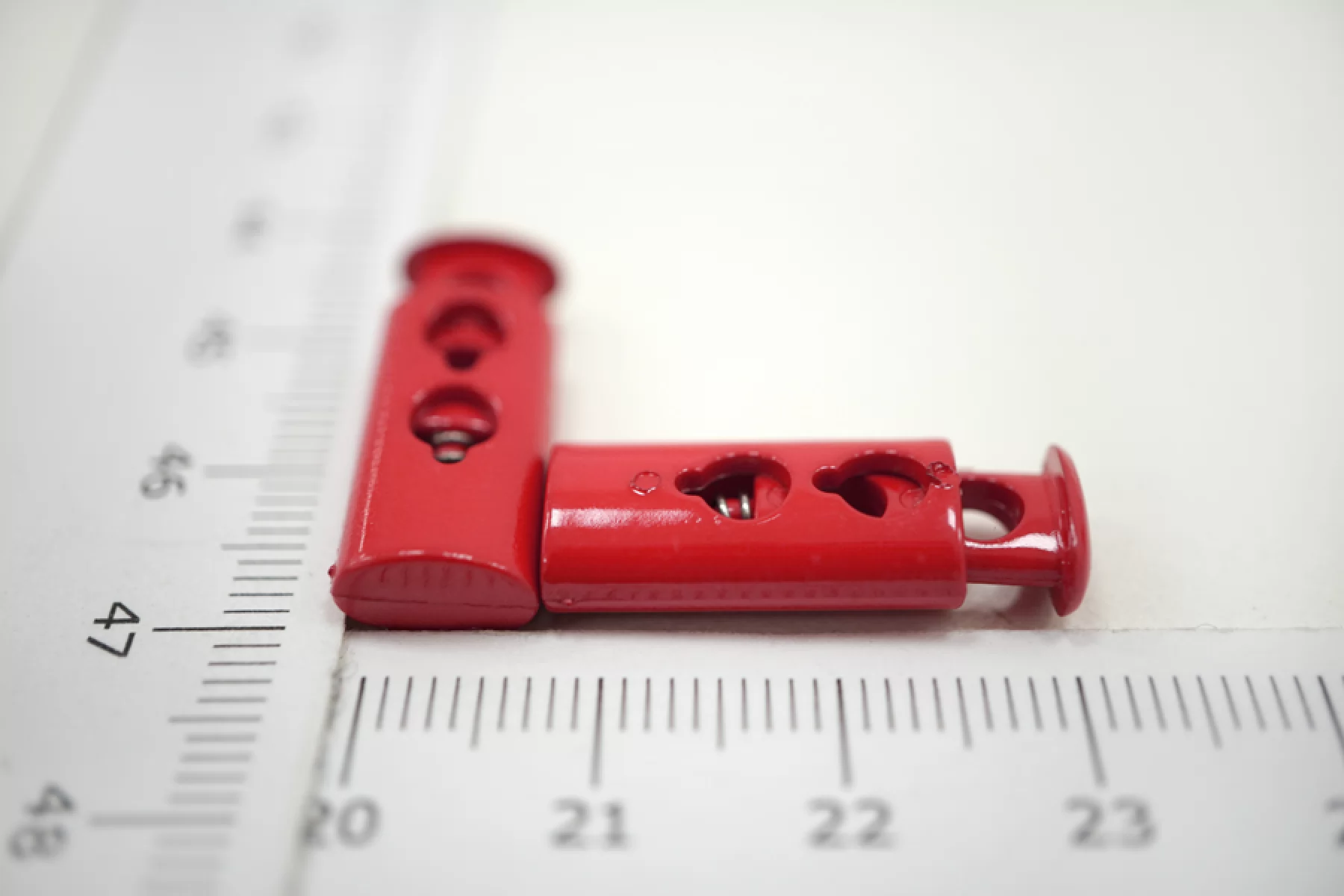 Фиксатор для шнурка. Пластиковый, глянцевый, цвет розово-красный, цилиндрической формы. Размер 23 мм х 0,9 мм.