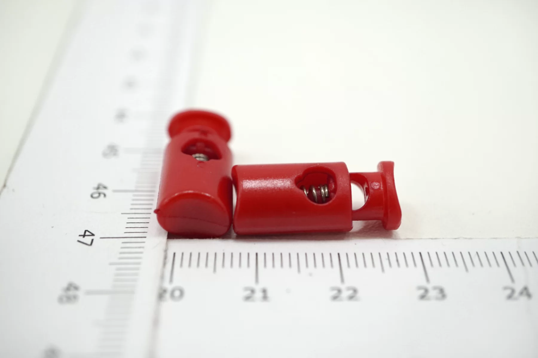 Фиксатор для шнурка. Пластиковый, цвет красный, цилиндрической формы. Размер 20 мм х 0,9 мм.