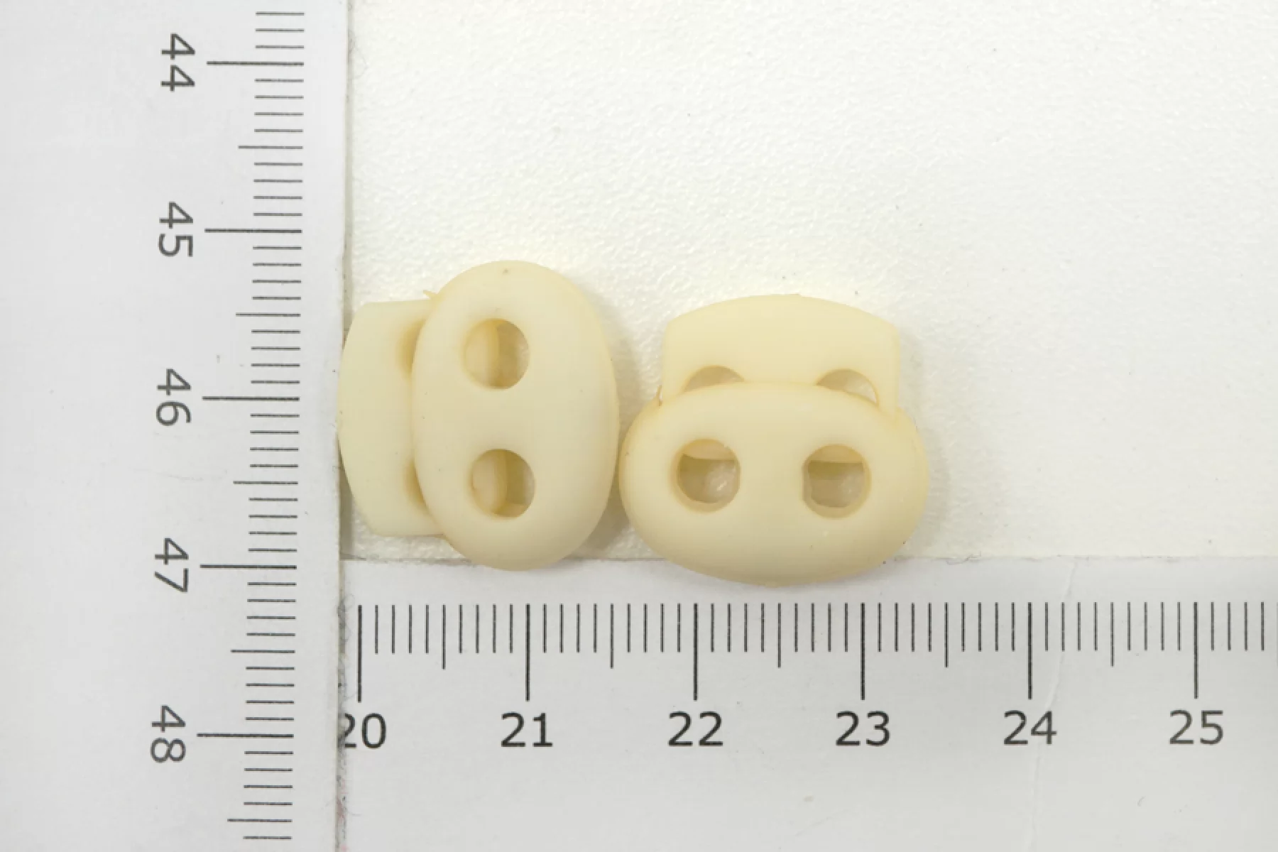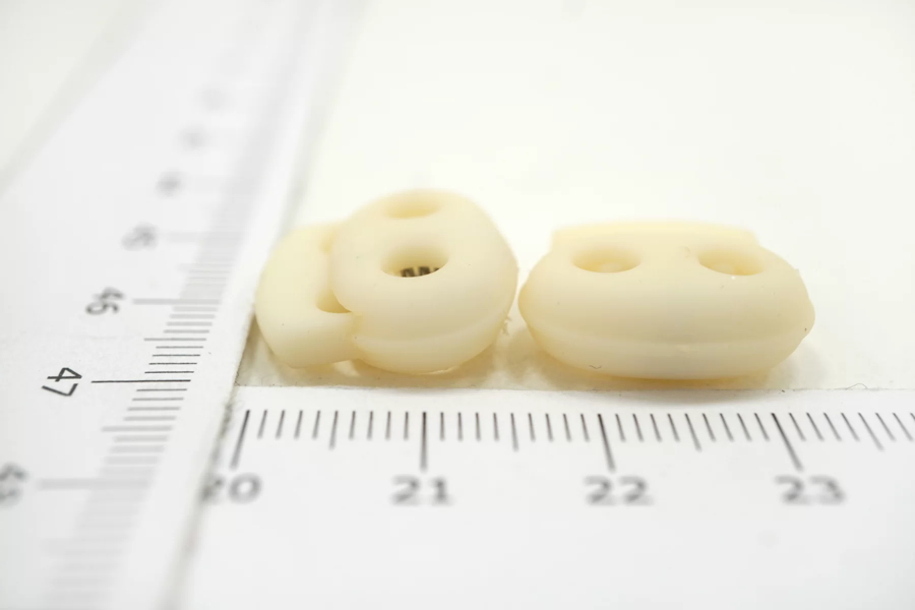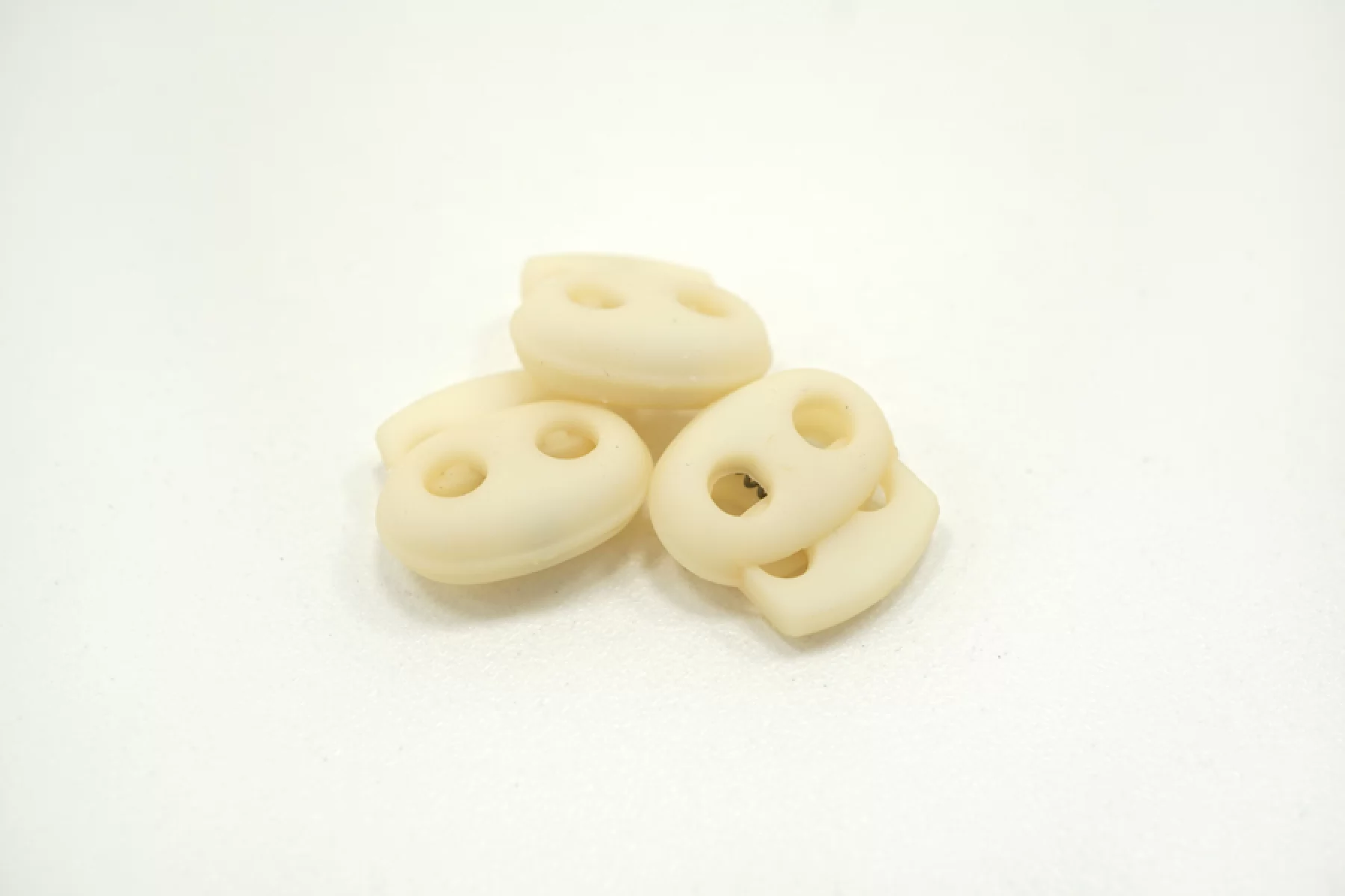 Фиксатор для шнурка. Пластиковый, прорезиненный, цвет - молочный, овальной формы, с двумя отверстиями. Размер 18 мм х 17 мм.