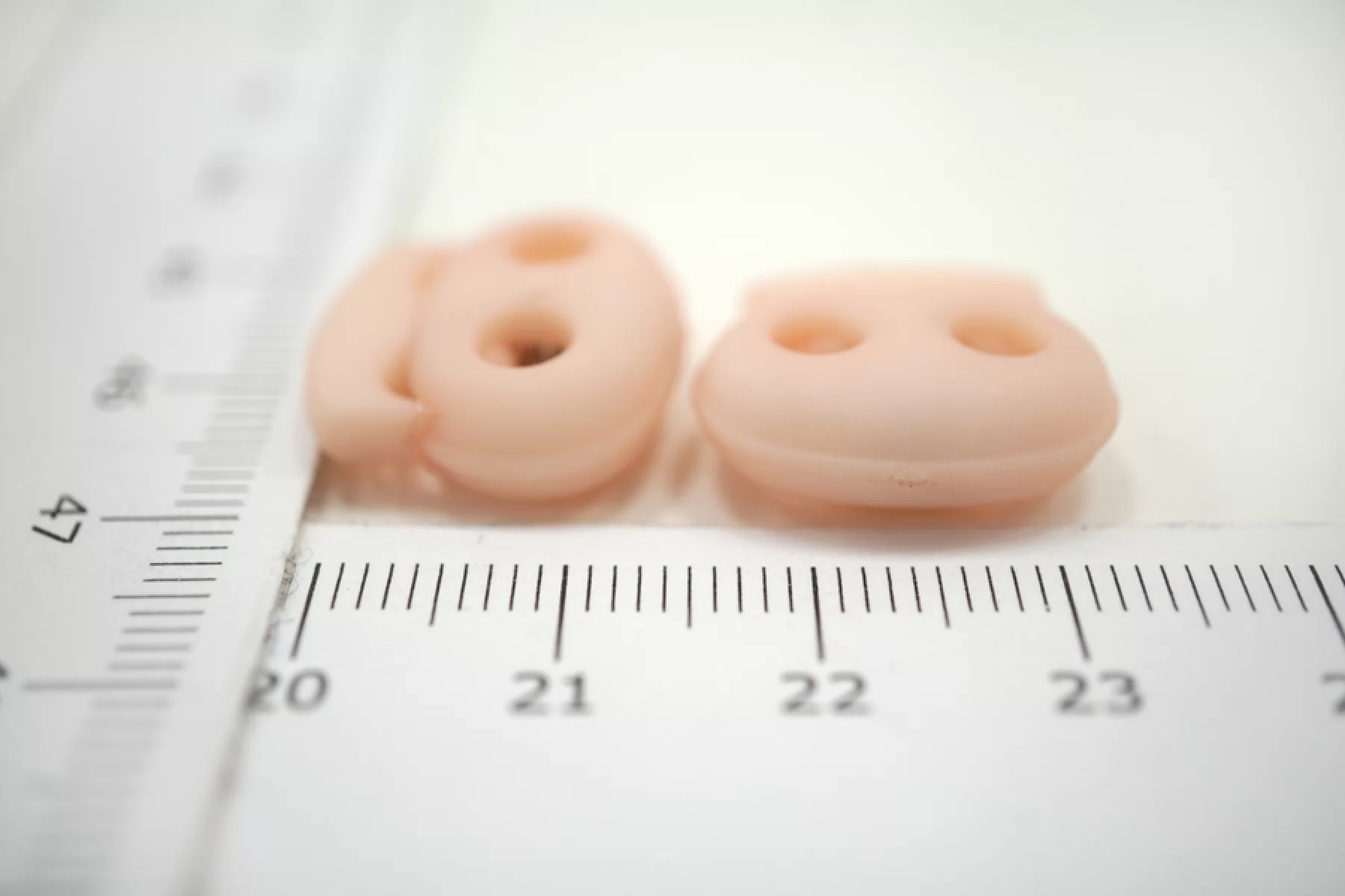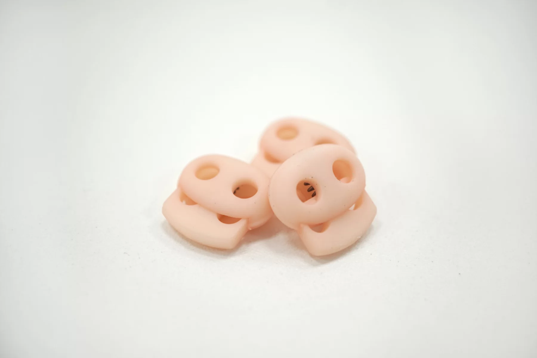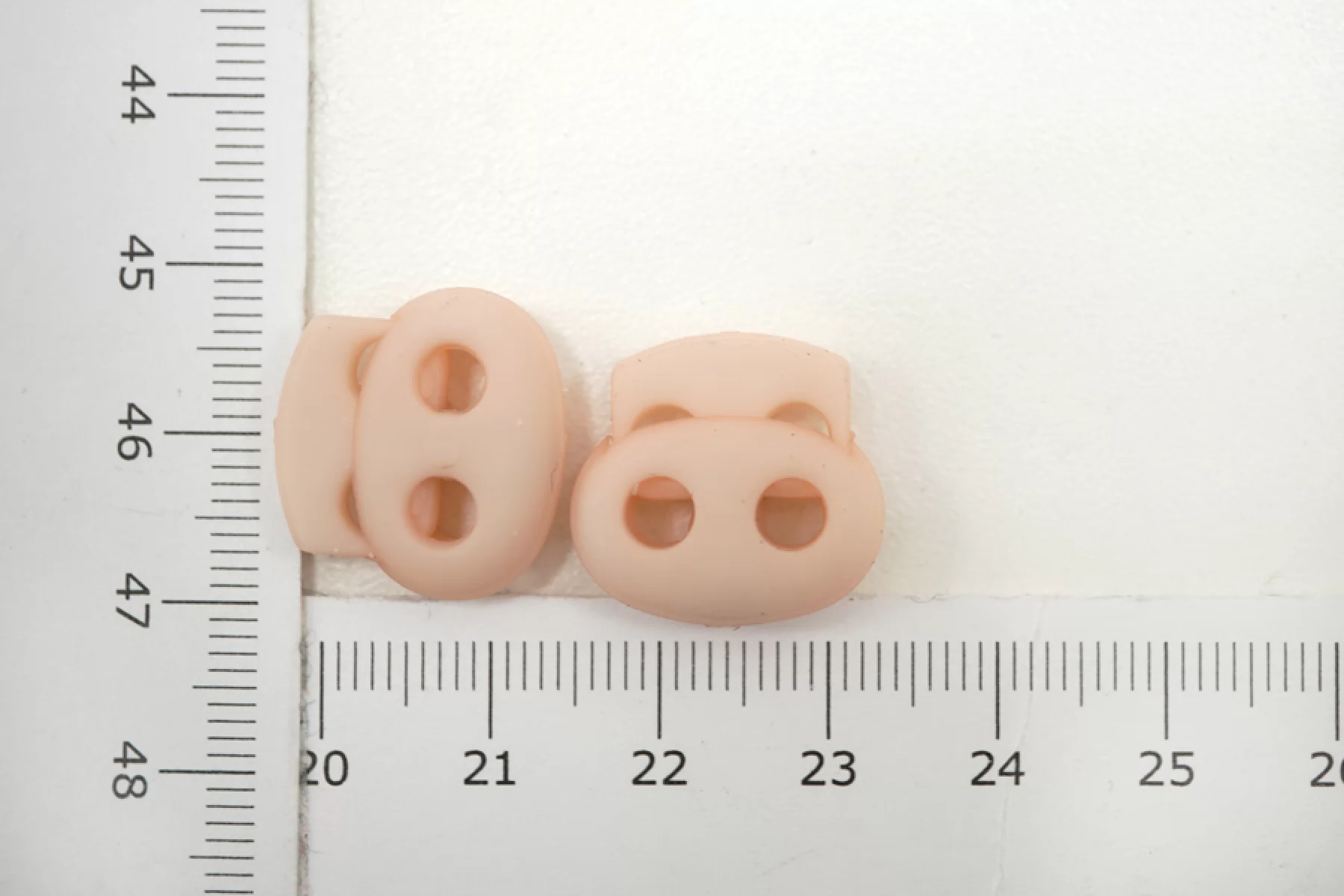 Фиксатор для шнурка. Пластиковый, прорезиненный, цвет - нежно-розовый, овальной формы, с двумя отверстиями. Размер 18 мм х 16 мм.