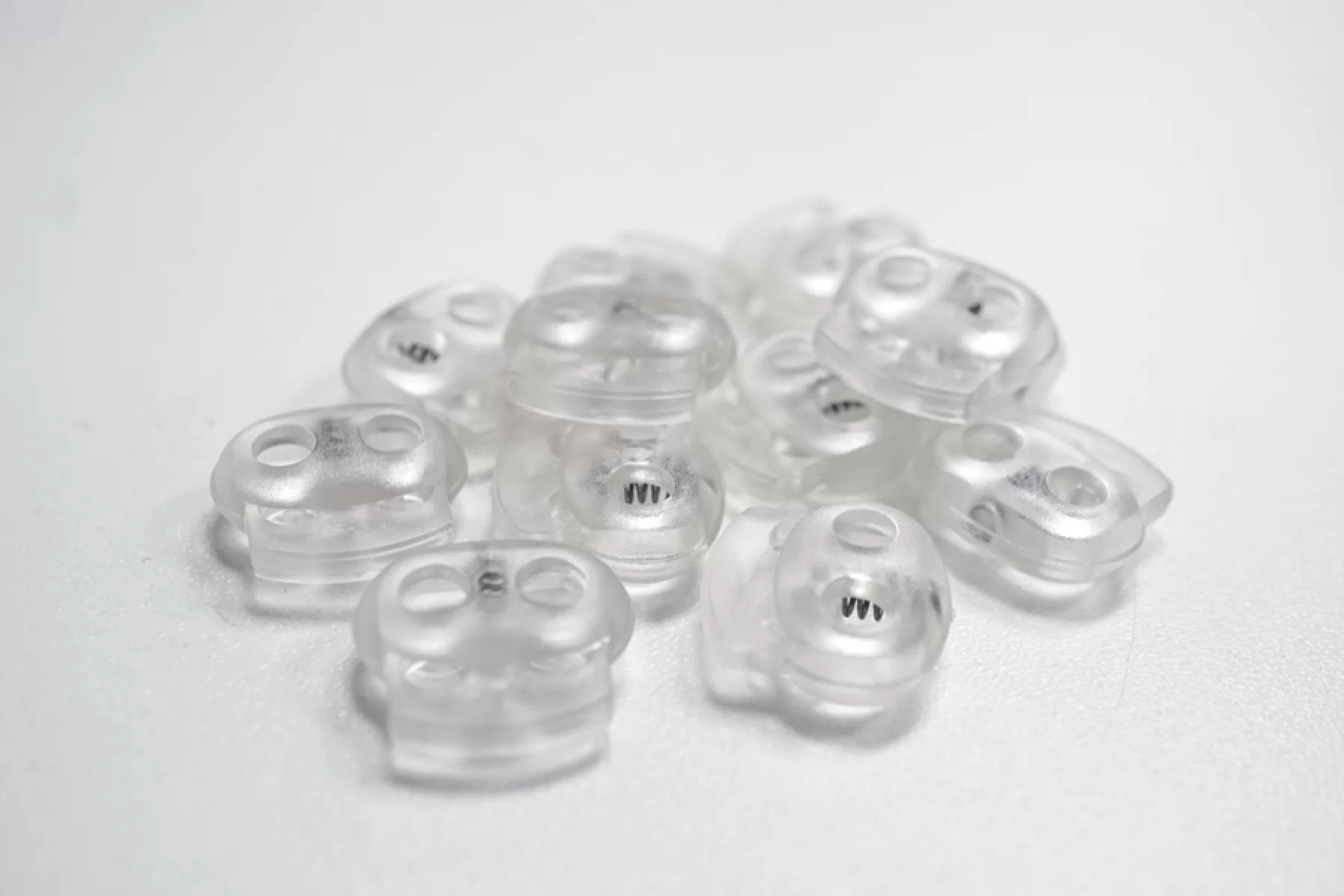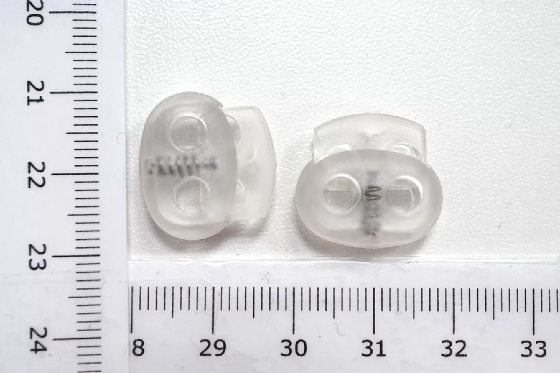 Фиксатор для шнурка. Пластиковый, прозрачный, цилиндрической формы, с двумя отверстиями. Размер 18 мм х 20 мм.