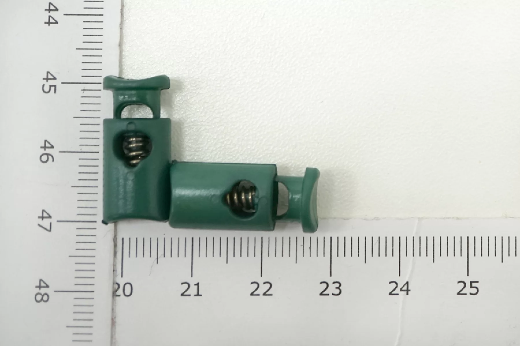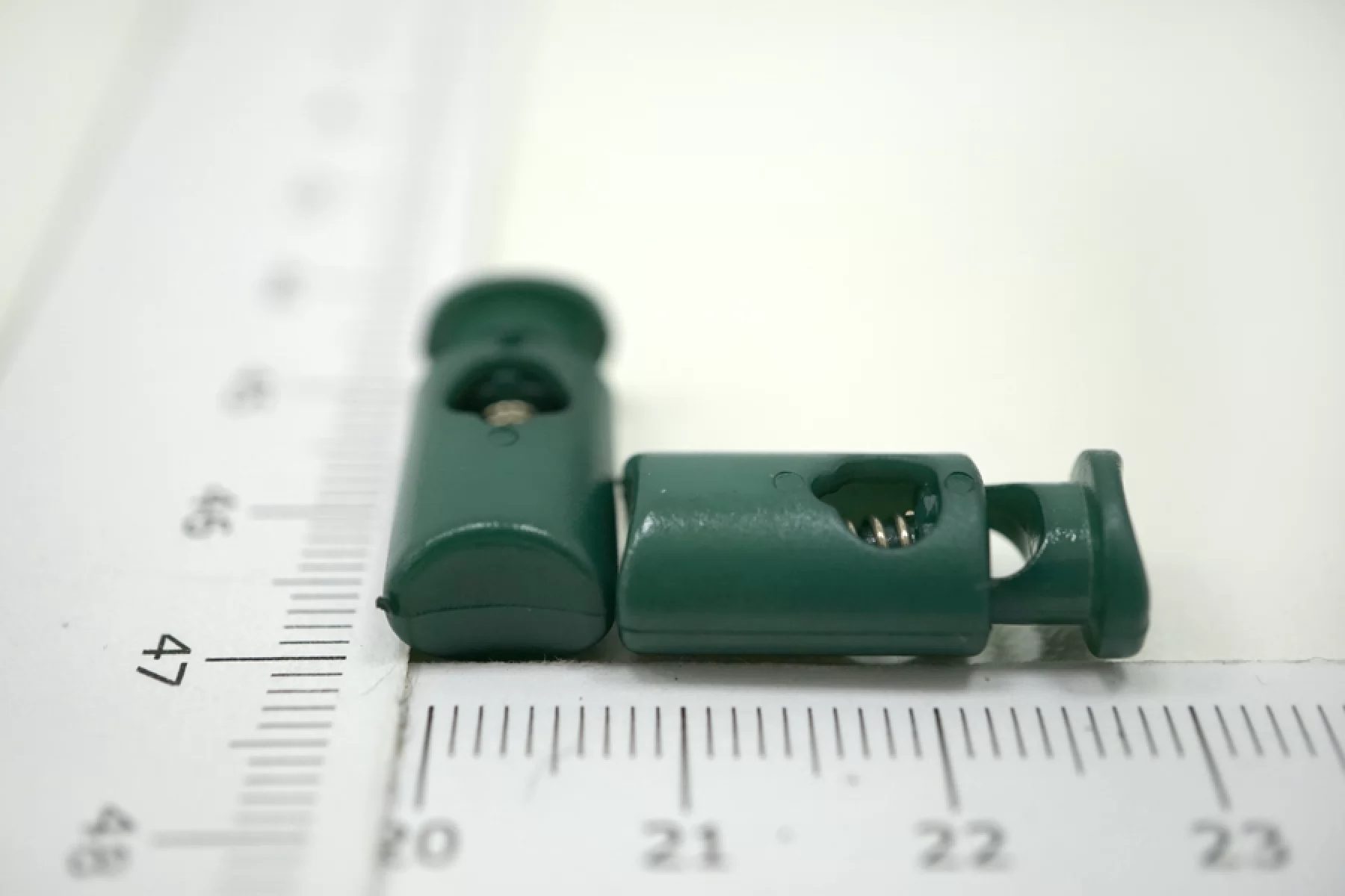 Фиксатор для шнурка. Пластиковый, темно-зеленый, цилиндрической формы. Размер 20 мм х 0,9 мм.