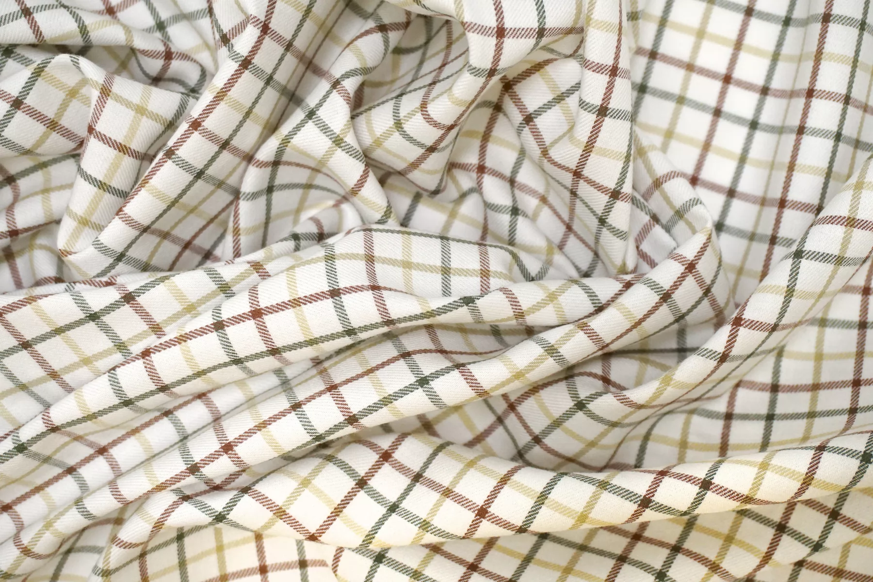 Прекрасный фланелевый рубашечный белый хлопок от фабрики Cotonificio Albini с узором - клеткой, нити коричневого и зелёного цвета. Ткань чуть ворсистая с лицевой стороны. Мягкая, приятная, пластичная, не толстая. Не тянется. Немного мнется, немного просвечивает силуэт в один слой. Шьем уютные и очень комфортные платья, брюки, теплые рубашки, юбки. Учитывайте усадку.
