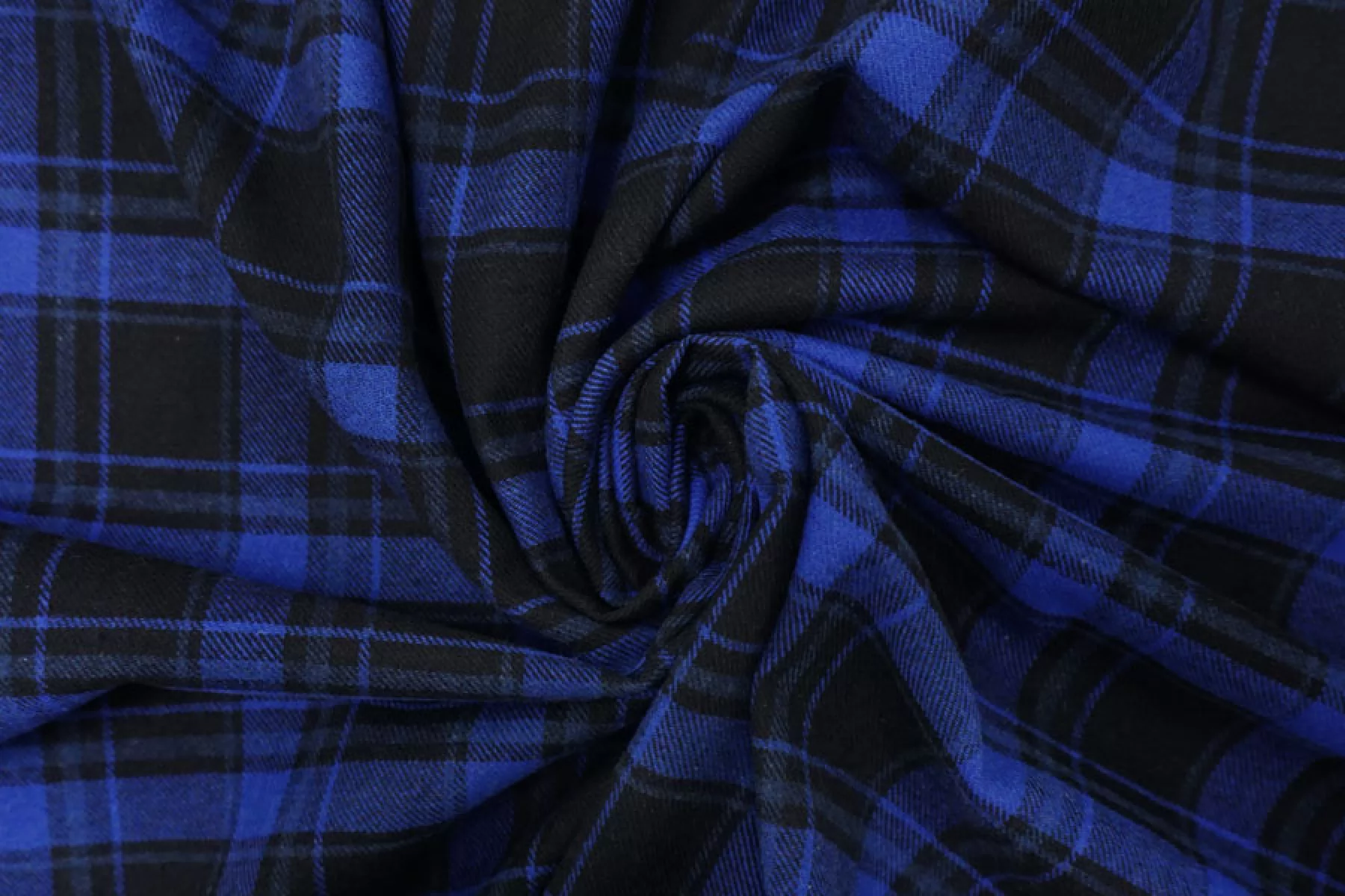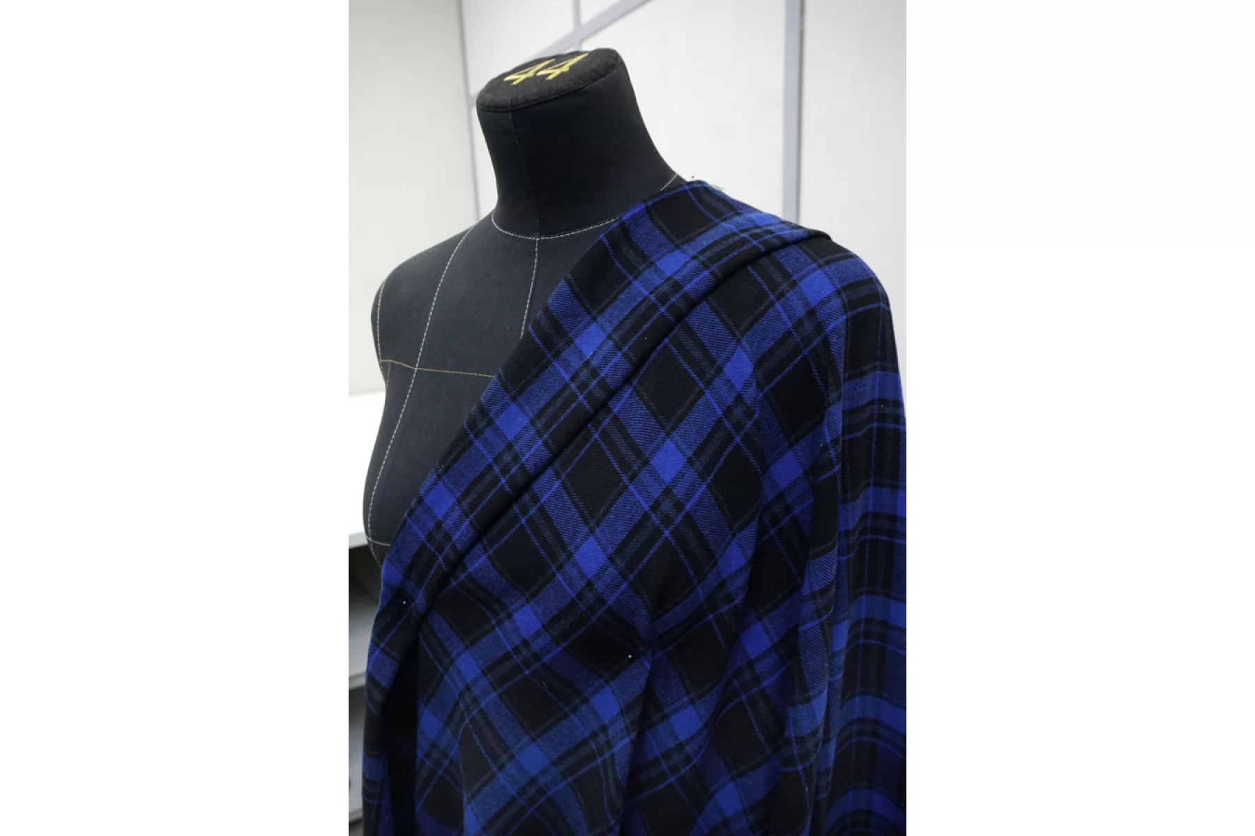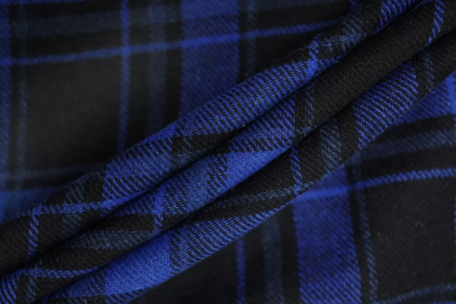 Фланель из хлопка и полиэстера, с небольшой добавкой шерсти. Плотность костюмно-плательная Узор-клетка, нити чёрного и синего цвета Тактильно приятная, суховатая, не колется. Не тянется и не просвечивает. Достаточно плотненькая. Не мнется. Пластичная. Хорошо драпируется и немного держит форму. Шьем костюмы мягкой формы, платья, юбки или теплые рубашки. Подойдет как в мужской, так и женский гардероб. Уход деликатный.