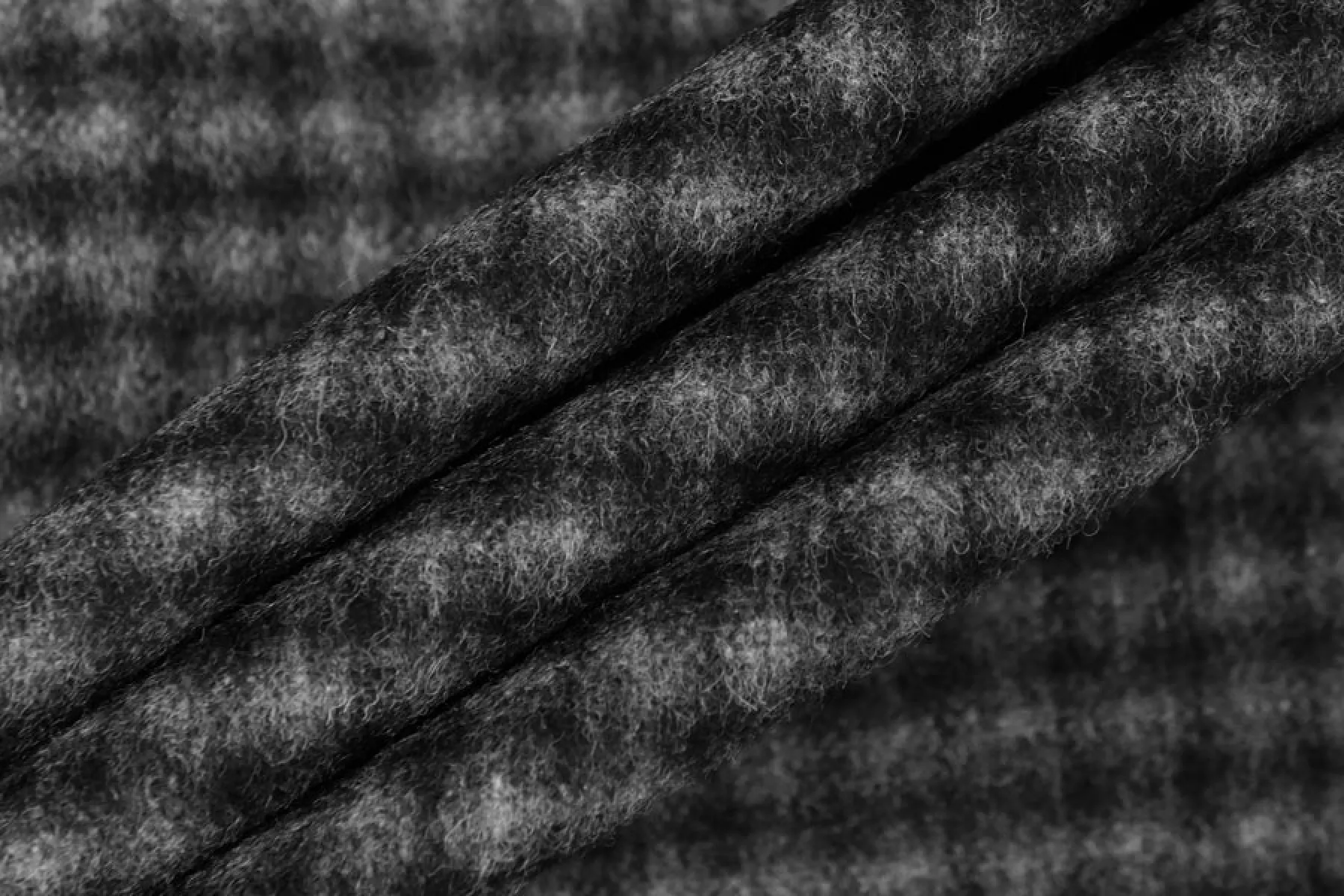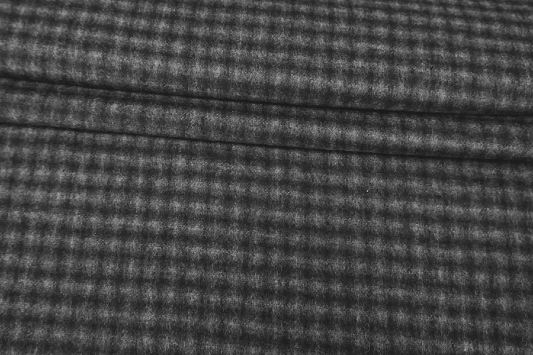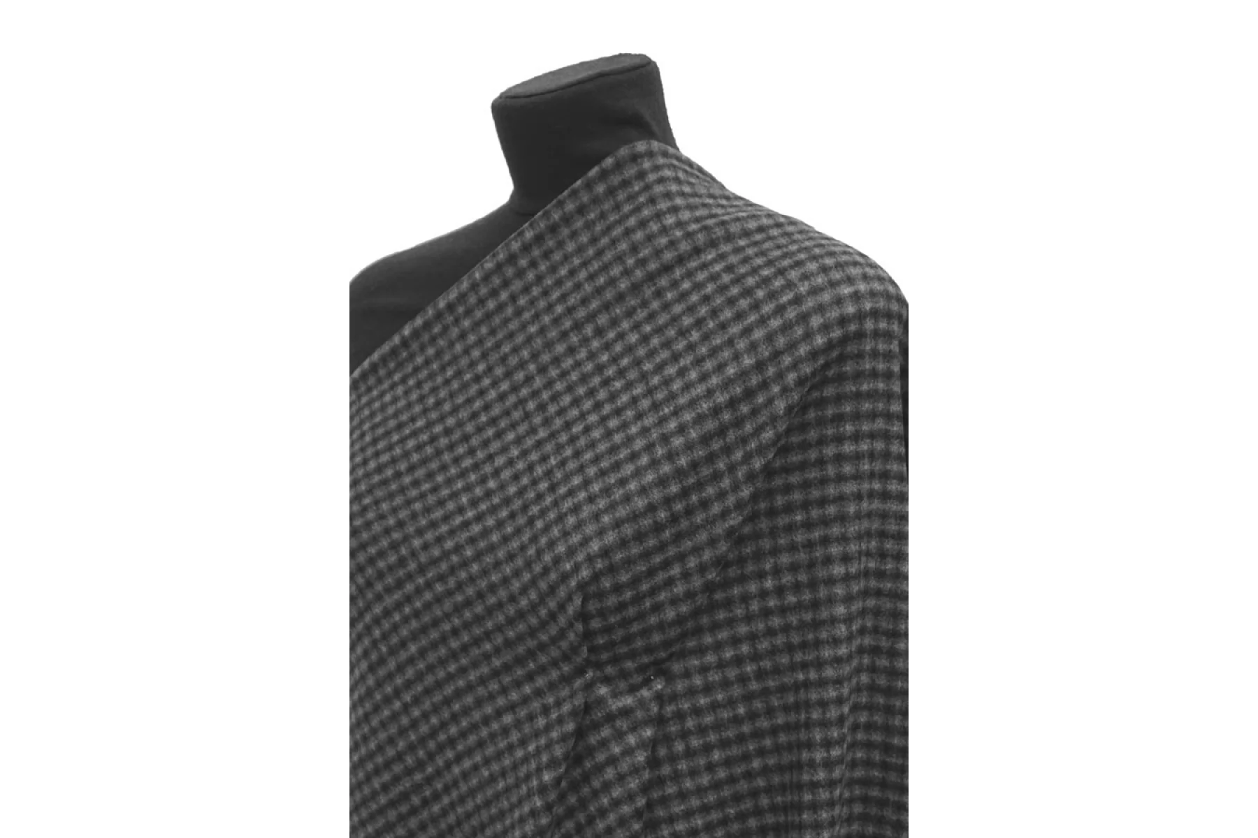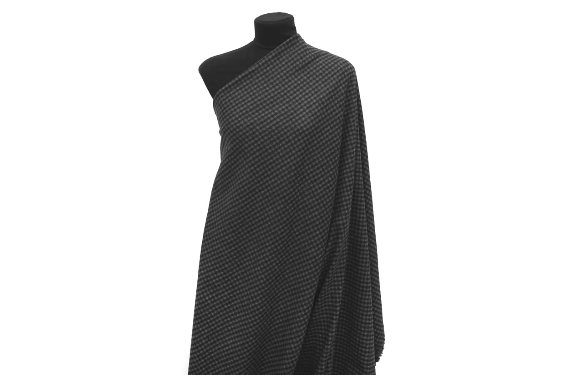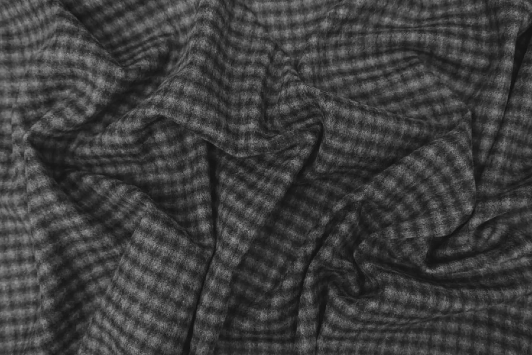 Костюмная шерстяная фланель серого цвета в мелкую клетку. Тактильно приятная, очень мягкая, немного суховатая, немножко колется. Лицевая сторона с коротким направленным ворсом. Немножко растягивается и чуть-чуть просвечивает силуэт. Не мнется. Обладает легким лоском. Пластичная. Хорошо драпируется и держит форму. Шьем костюмы или теплые рубашки. Уход деликатный.