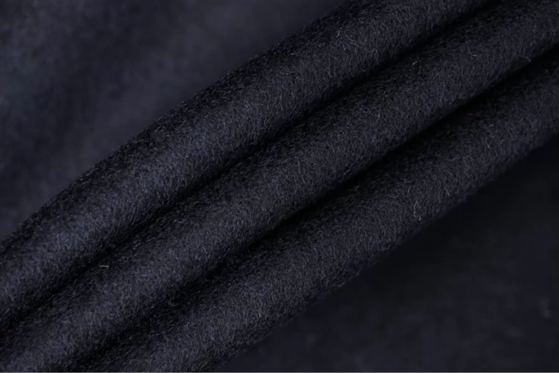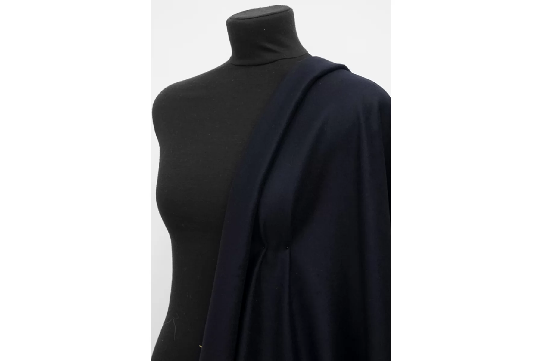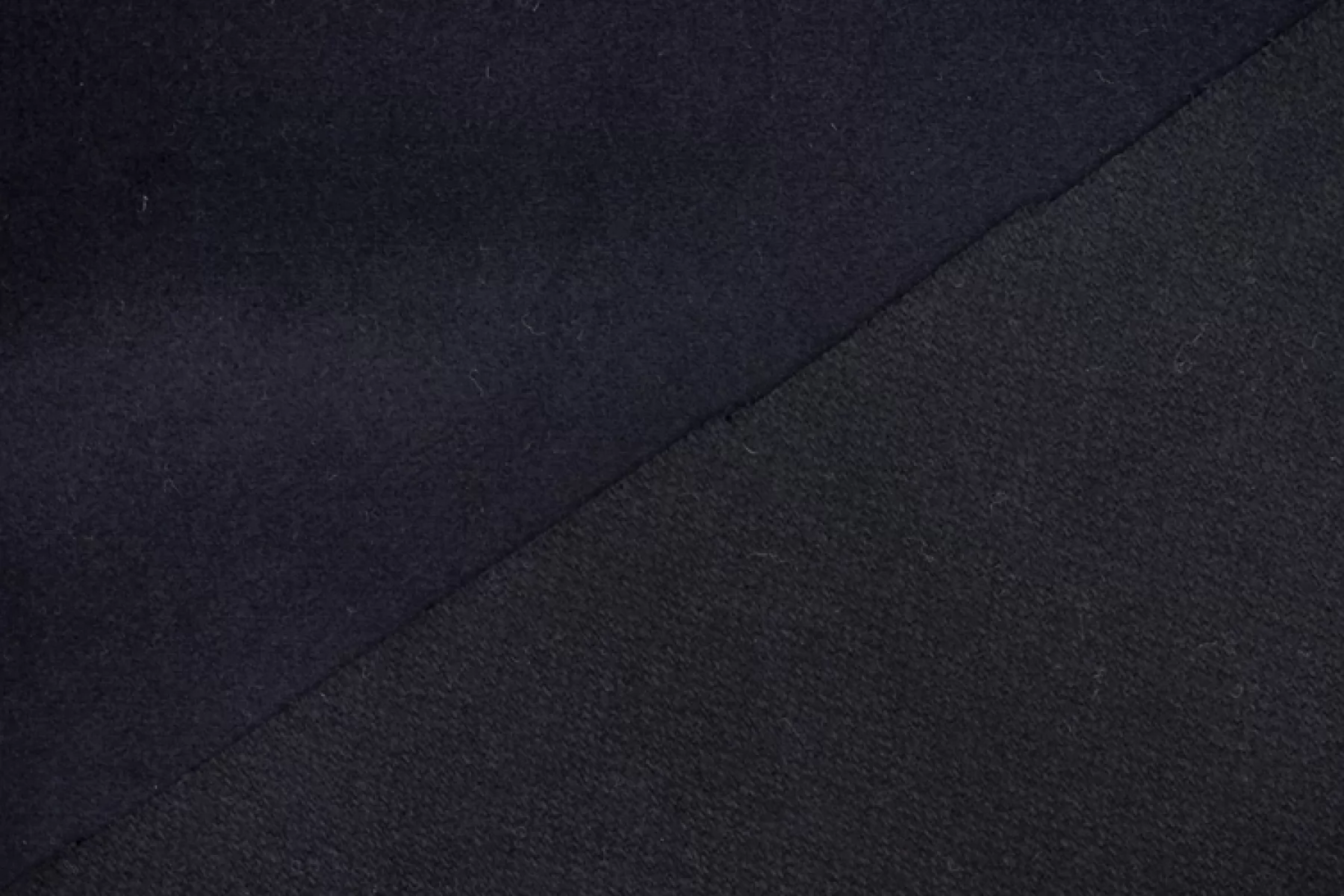 Очень классная костюмно-пальтовая шерстяная фланель в иссиня-черном оттенке и обратная сторона материала черного оттенка. Тактильно очень приятная, суховатая, но практически не колется. Лицевая сторона мягкая, обладает красивым лоском и легким, направленным и прижатым, ворсом. Не тянется и не просвечивает. Слегка мнется, но восстанавливается. Пластичная. Хорошо драпируется и неплохо держит форму. Отлично подойдет на пальтовые варианты, теплые костюмы, жакеты или теплые рубашки. Уход деликатный.