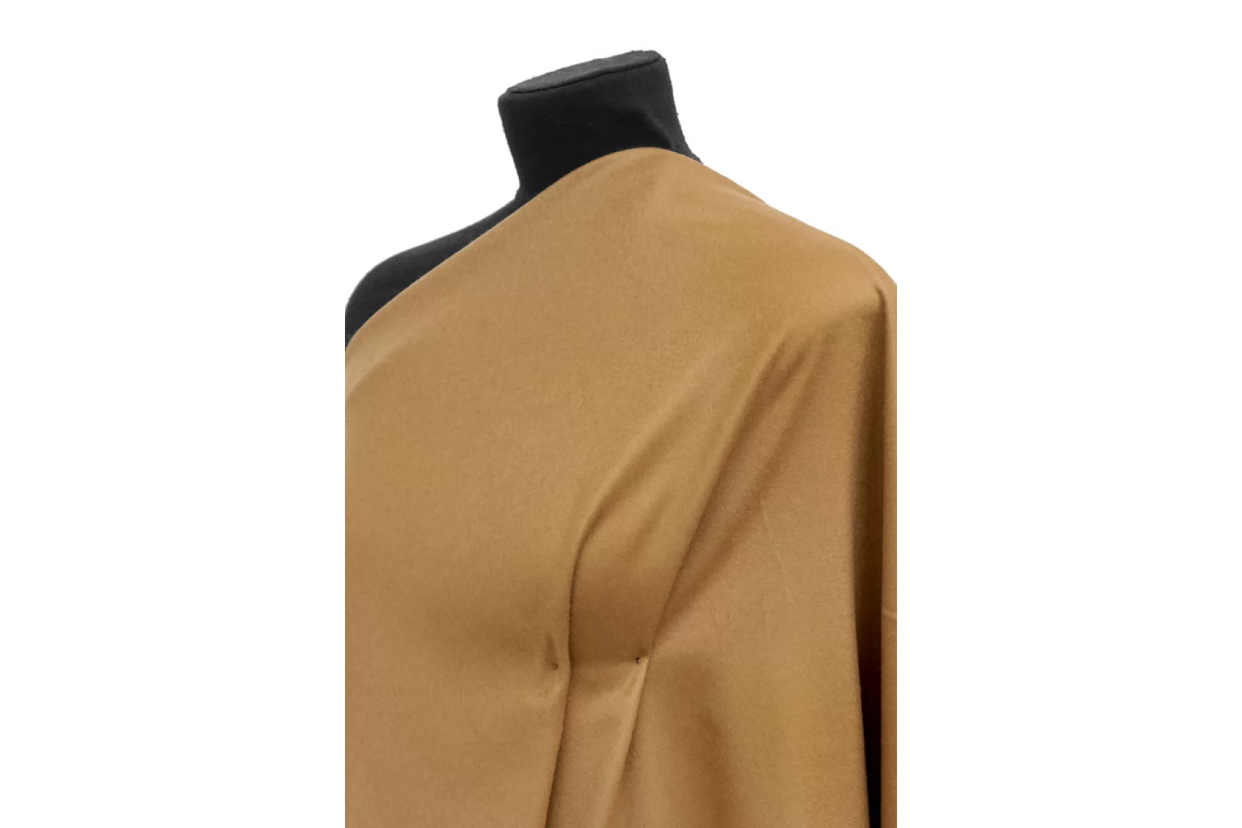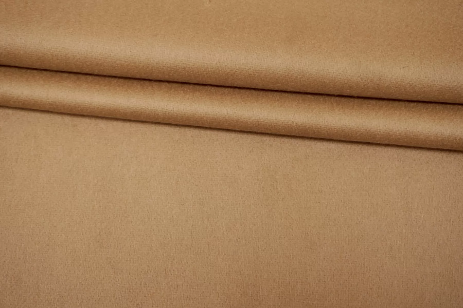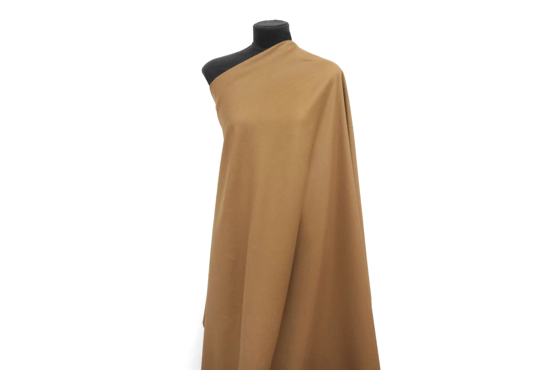 Костюмно-плательная шерстяная фланель качества virgin оттенка кэмел, одна сторона ворсовая. Тактильно приятная, очень мягкая, немного суховатая, не колется. Не тянется и не просвечивает. Достаточно плотненькая. Немного мнется. Обладает легким лоском. Пластичная. Хорошо драпируется и держит форму. Шьем костюмы или теплые рубашки. Уход деликатный.