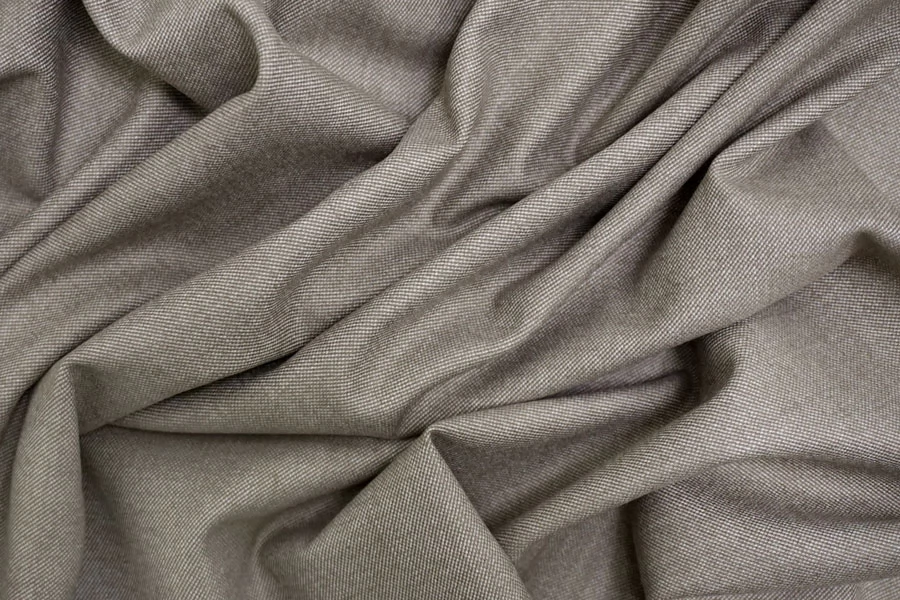 Костюмно-плательная фланель поливискозная от бренда Max Mara, нити светло-серого и кофейно-бежевого цвета. Пластичная, мягкая и приятная тактильно. Не мнется. Не просвечивает. Хорошо пружинит за счет эластана. Поливискоза отличается хорошей износостойкостью и прочностью. Уход деликатный. Шьем платья, тёплые рубашки или шорты, брюки, костюмы мягкой формы.