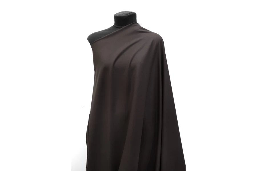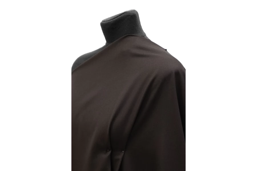 Костюмно-плательная фланель поливискозная от бренда Max Mara, тёмно-коричневого цвета. Пластичная, мягкая и приятная тактильно. Не мнется. Не просвечивает. Хорошо пружинит за счет эластана. Поливискоза отличается хорошей износостойкостью и прочностью. Уход деликатный. Шьем платья, тёплые рубашки или шорты, брюки, костюмы мягкой формы.