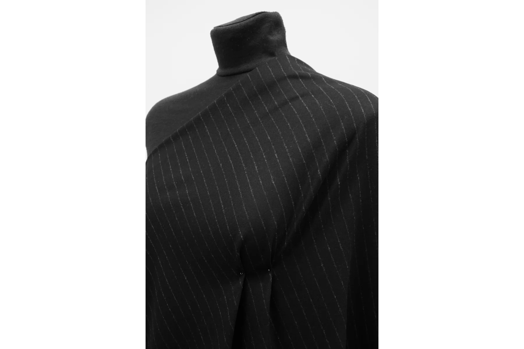 Прекрасная фланель из шерсти качества virgin чёрного цвета в тонкую серую полоску (расположена вдоль кроки). Тактильно очень приятная, мягкая, не колется. Слегка просвечивает насквозь в один слой, в изделии заметно не будет. Немного тянется и практически не мнется. Пластичная. Хорошо драпируется и умеренно держит форму. Шьем костюмы, мягкие жакеты, платья, юбки или теплые рубашки. Подойдет как в мужской, так и женский гардероб. Уход деликатный.