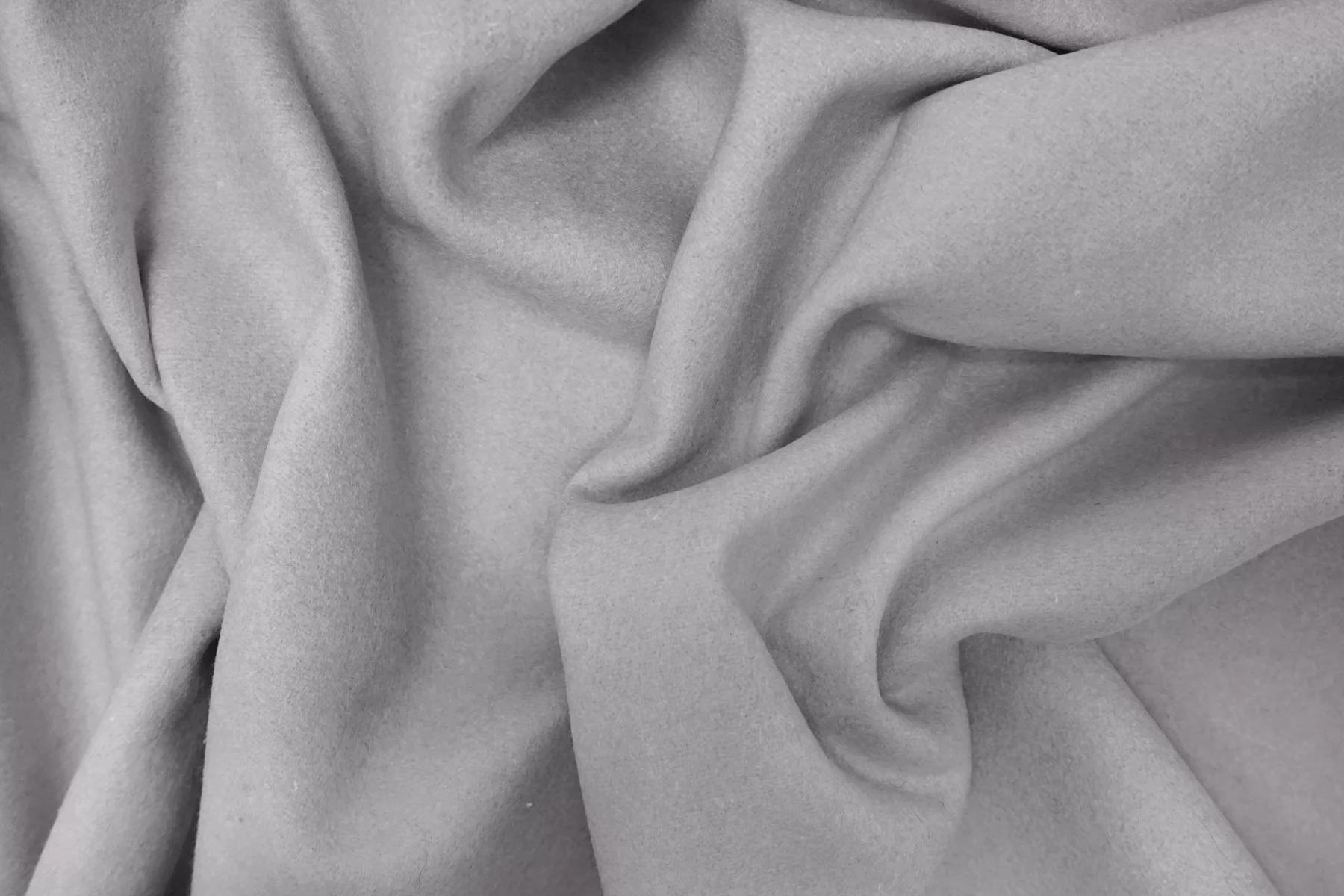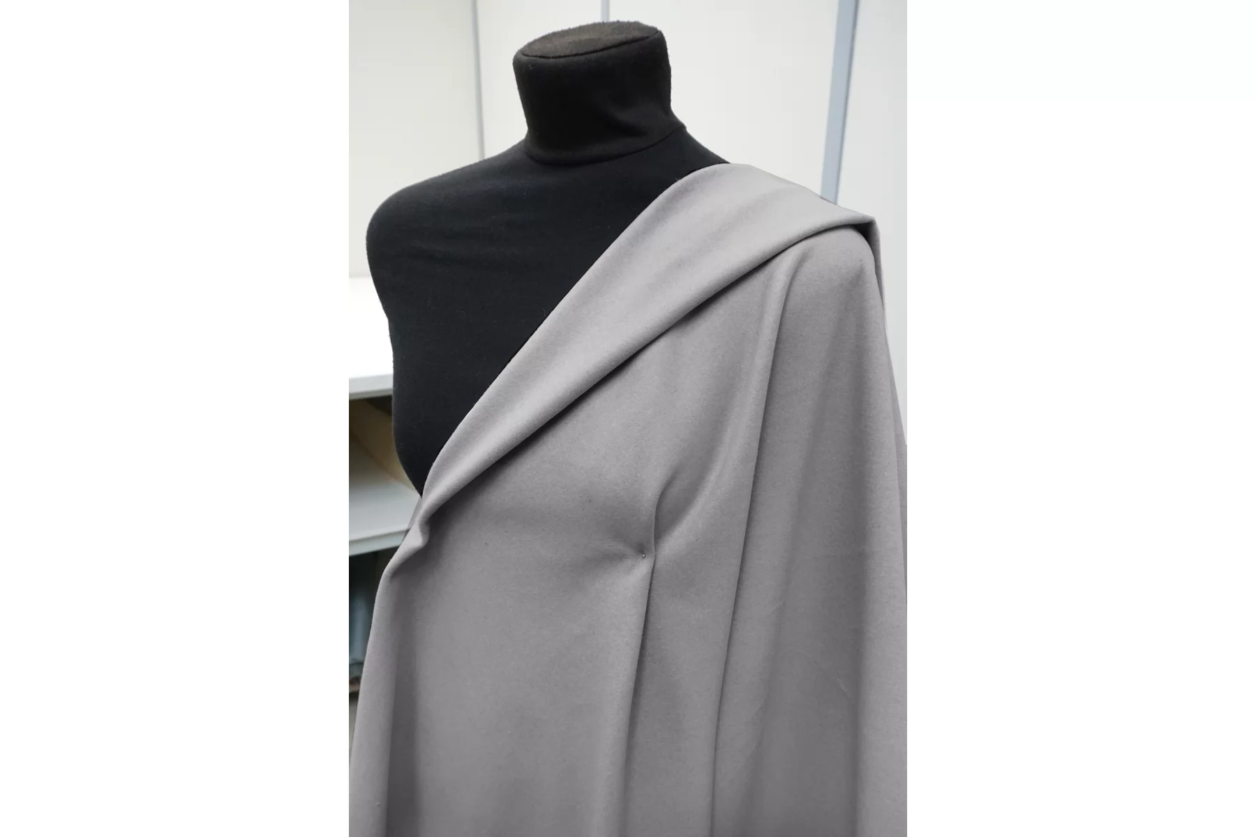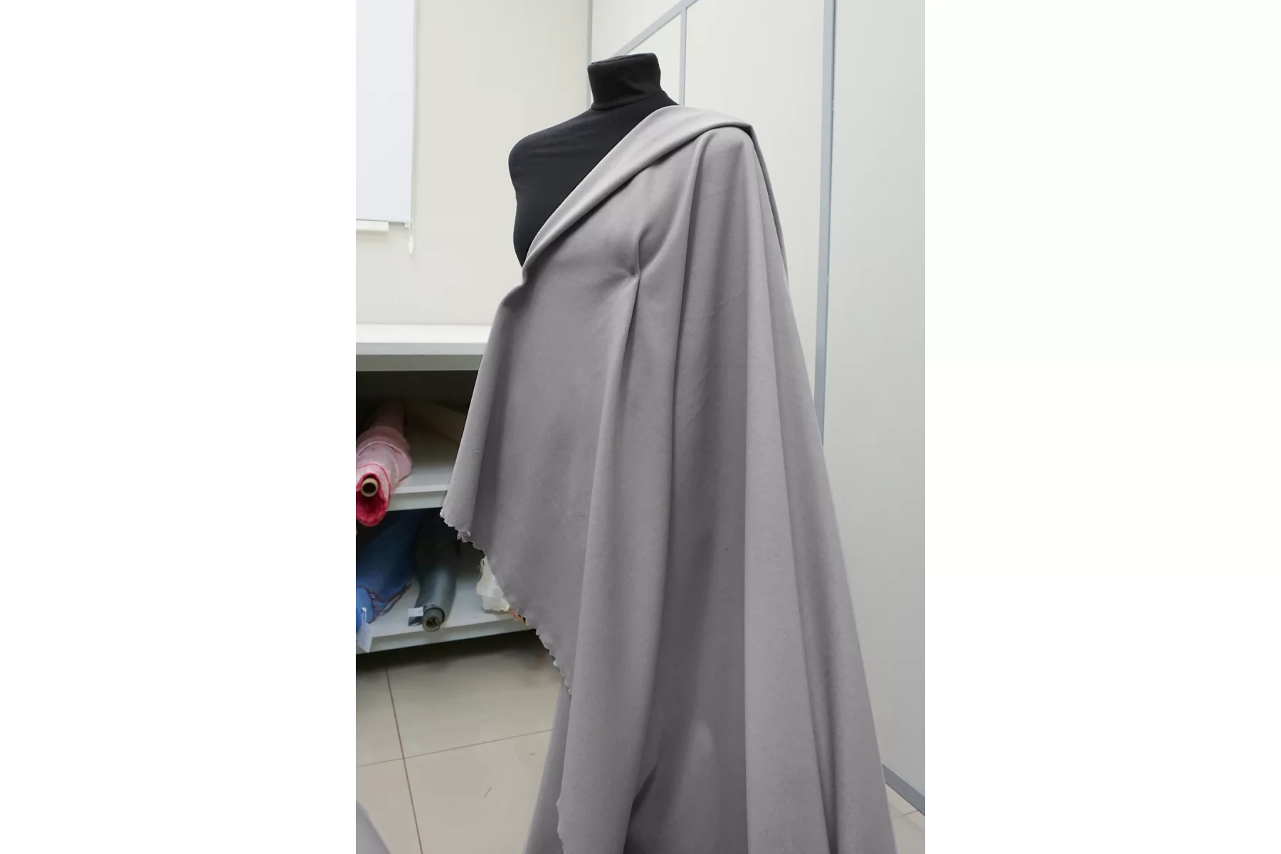Очень классная костюмная шерстяная фланель светлого серого цвета с лёгким розовато-сиреневатым подтоном. Тактильно очень приятная, мягкая, слегка суховатая, немного колется. Примерно 1 мм толщиной. С легким ворсом с двух сторон. Не тянется и не просвечивает. Не мнется. Пластичная. Хорошо драпируется и неплохо держит форму. Отлично подойдет на теплые костюмы, жакеты или теплые рубашки. Уход деликатный.