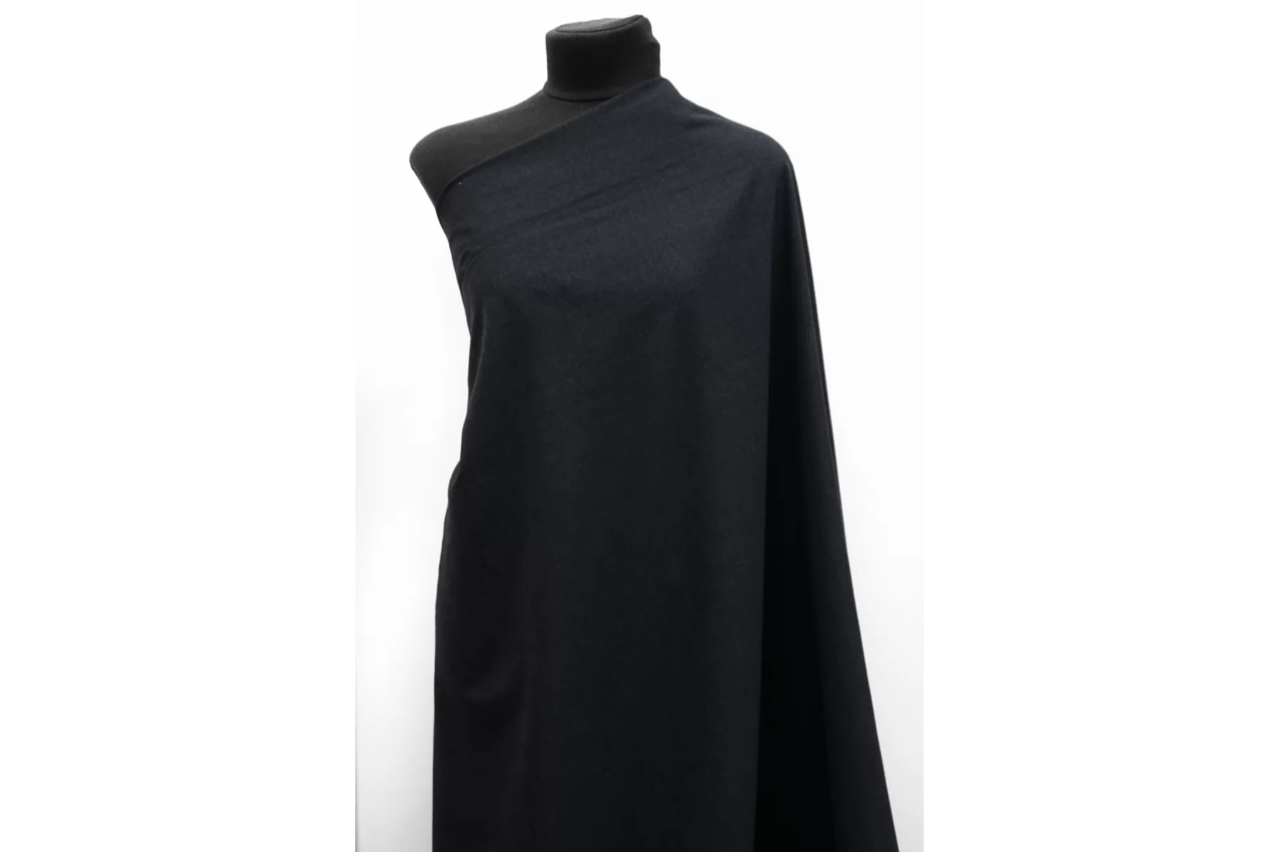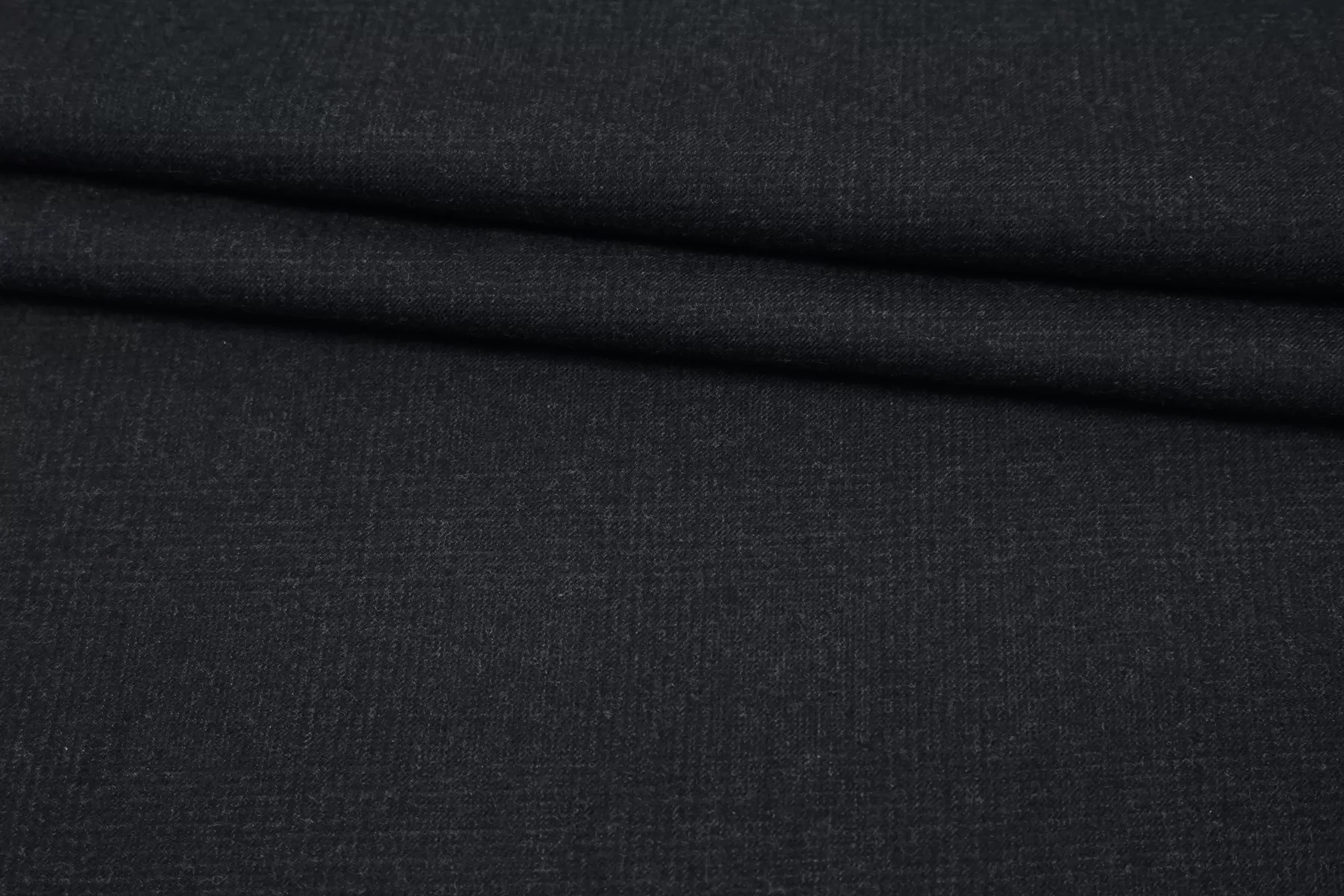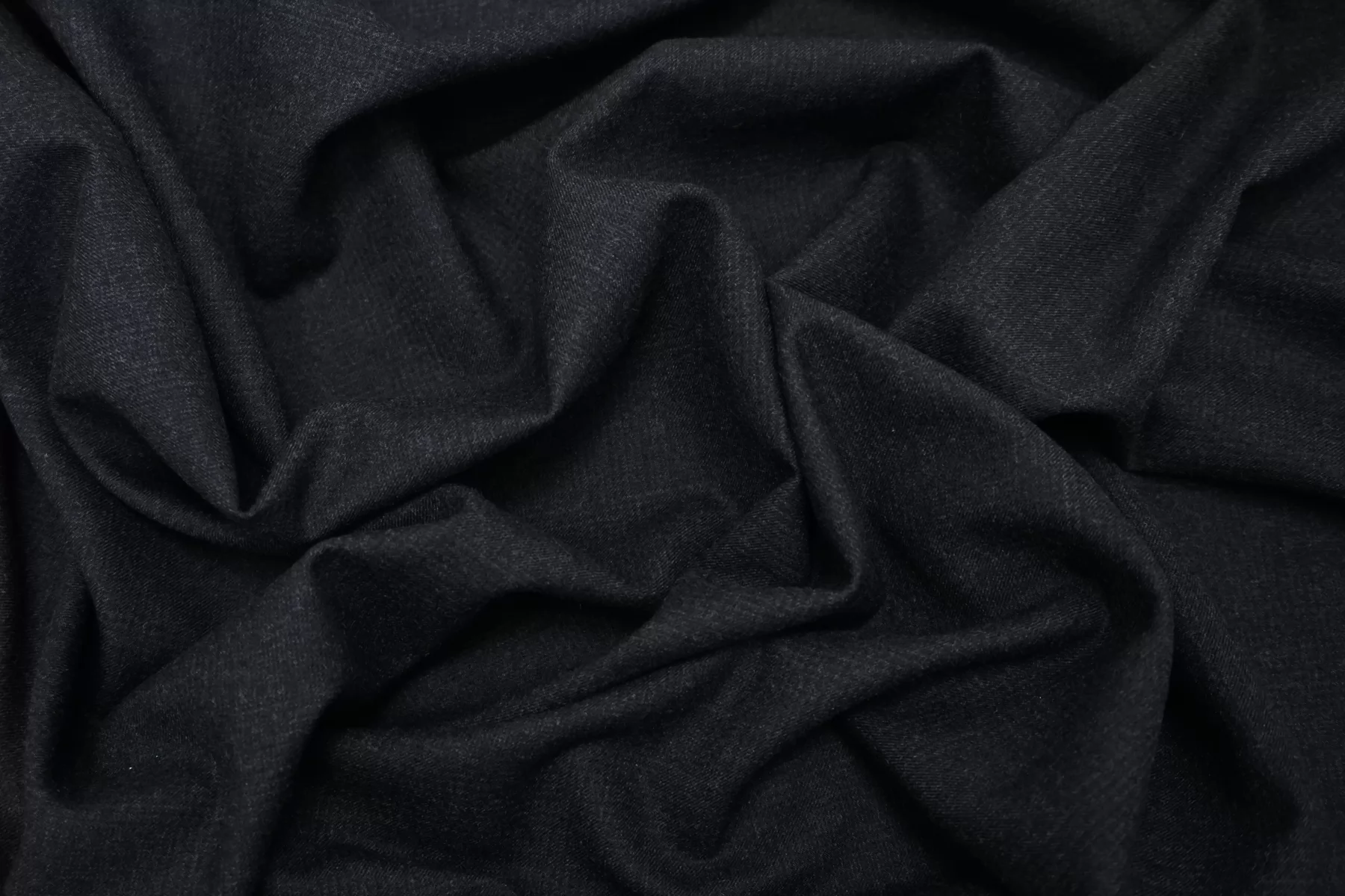 Костюмная шерстяная фланель с еле заметным узором-клеткой, нити чёрного и тёмного серого цвета, создаётся очень лёгкий синеватый подтон. Тактильно приятная, мягкая, немного суховатая, немного колется. Не тянется и не просвечивает. Достаточно плотненькая. Не мнется. Пластичная. Хорошо драпируется и умеренно держит форму. Шьем костюмы, жакеты, юбки или теплые рубашки. Подойдет как в мужской, так и женский гардероб. Уход деликатный.