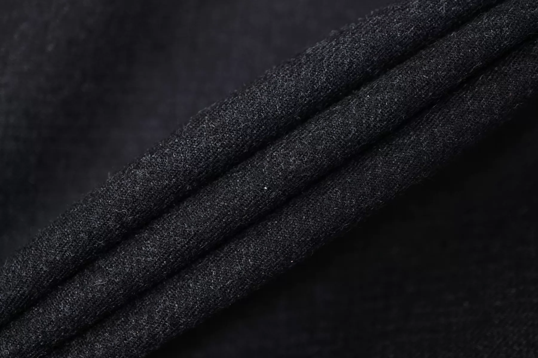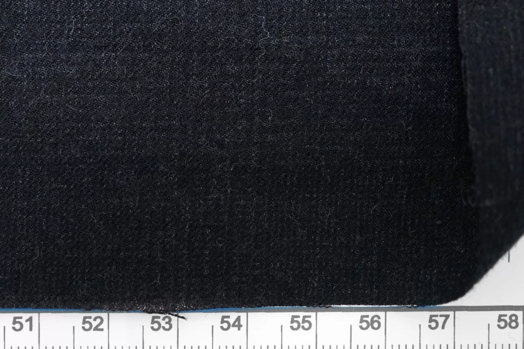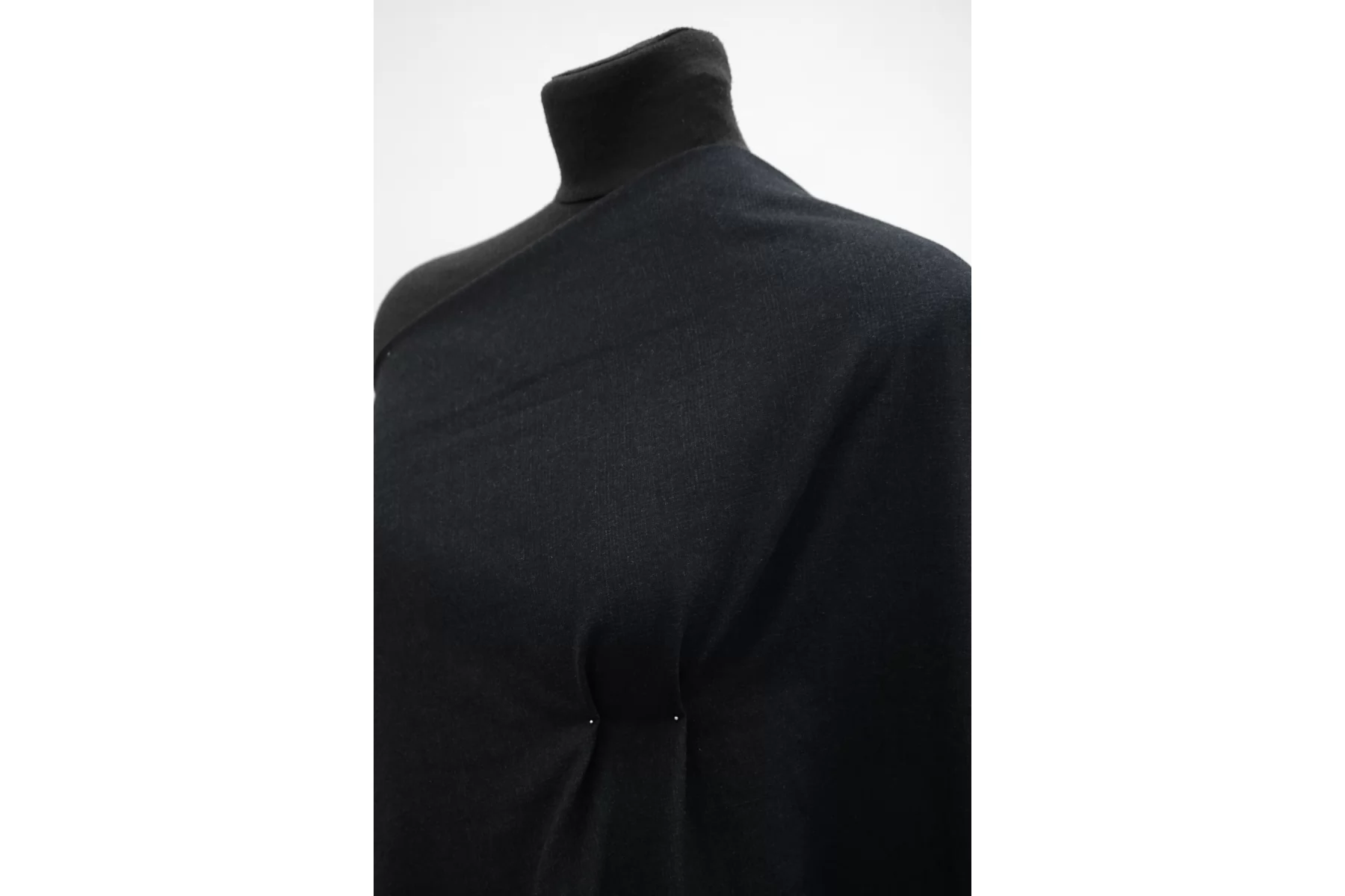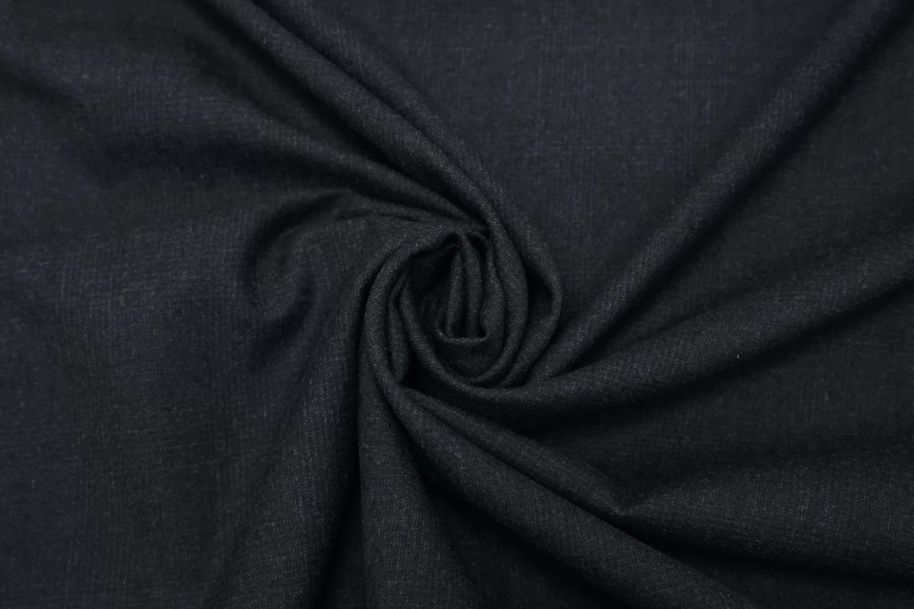 Костюмная шерстяная фланель с еле заметным узором-клеткой, нити чёрного и тёмного серого цвета, создаётся очень лёгкий синеватый подтон. Тактильно приятная, мягкая, немного суховатая, немного колется. Не тянется и не просвечивает. Достаточно плотненькая. Не мнется. Пластичная. Хорошо драпируется и умеренно держит форму. Шьем костюмы, жакеты, юбки или теплые рубашки. Подойдет как в мужской, так и женский гардероб. Уход деликатный.
