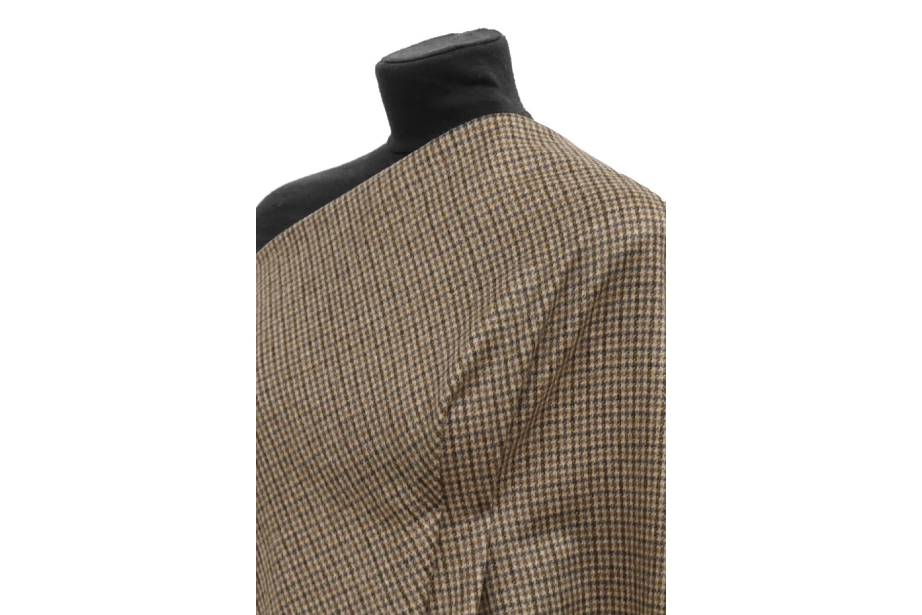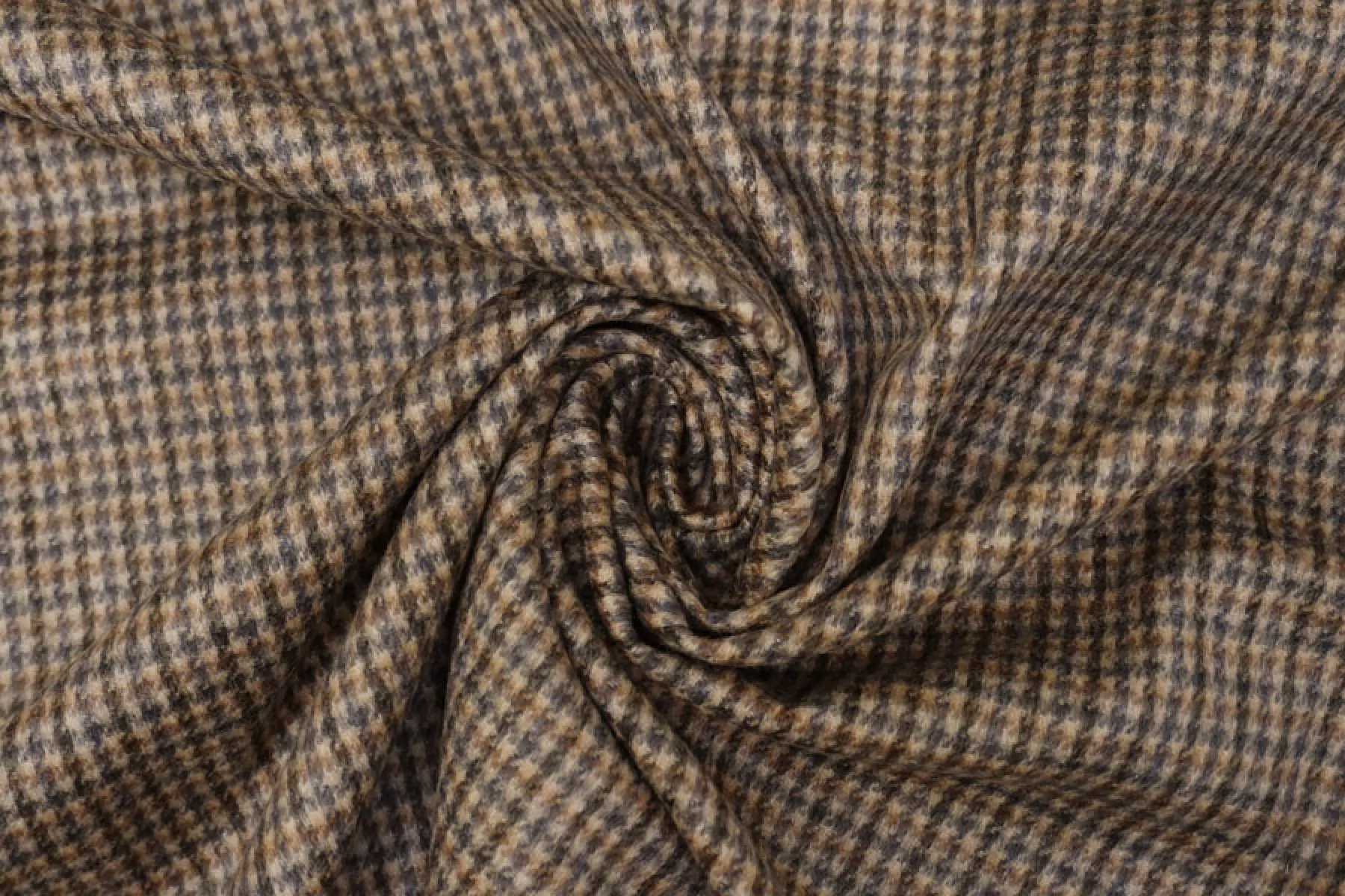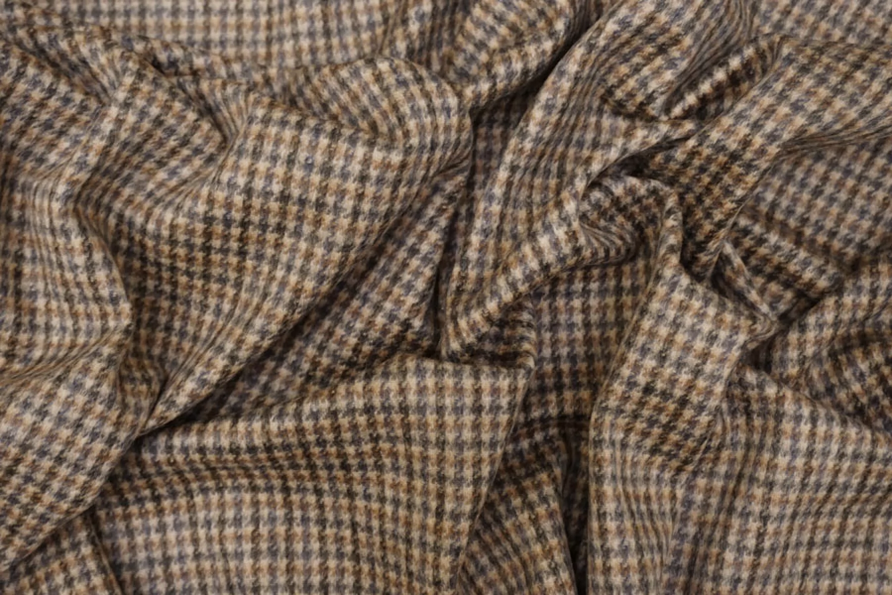 Костюмная шерстяная фланель диагонального плетения светло-коричневого оттенка в мелкую клетку, лицевая сторона с коротким направленным ворсом. Тактильно приятная, мягкая, немного суховатая, не колется. Не тянется и не просвечивает. Достаточно плотненькая. Не мнется. Обладает легким лоском. Пластичная. Хорошо драпируется и держит форму. Шьем костюмы, жакеты, юбки или теплые рубашки. Подойдет как в мужской, так и женский гардероб. Уход деликатный.