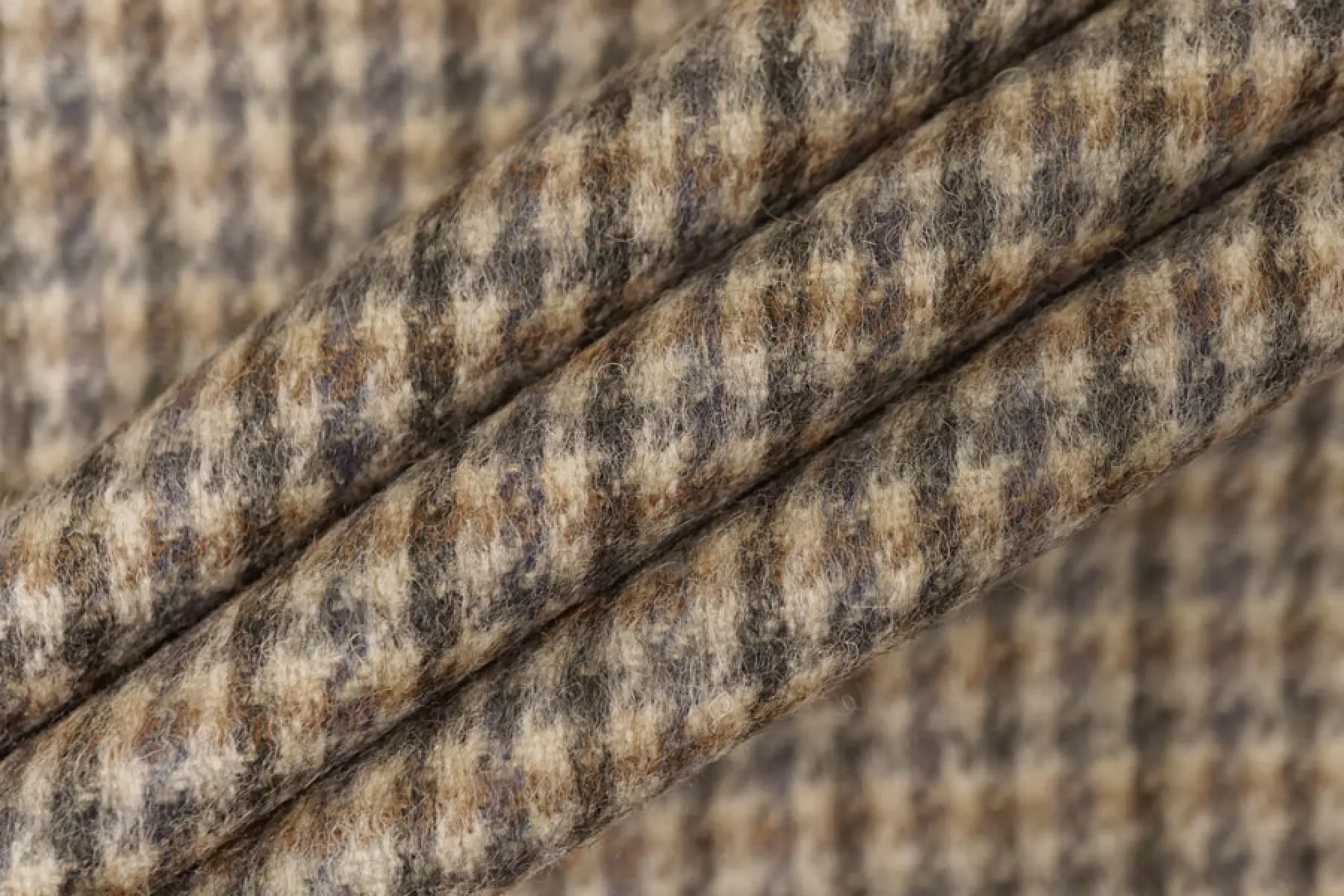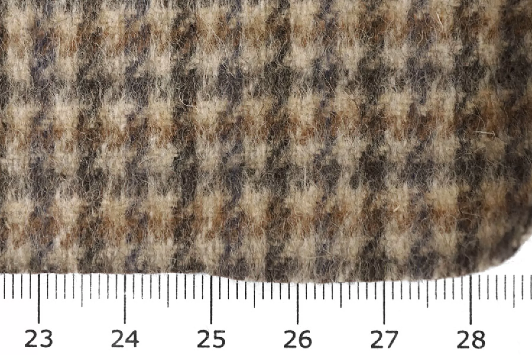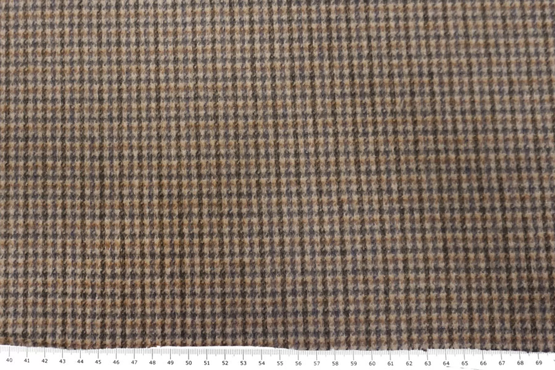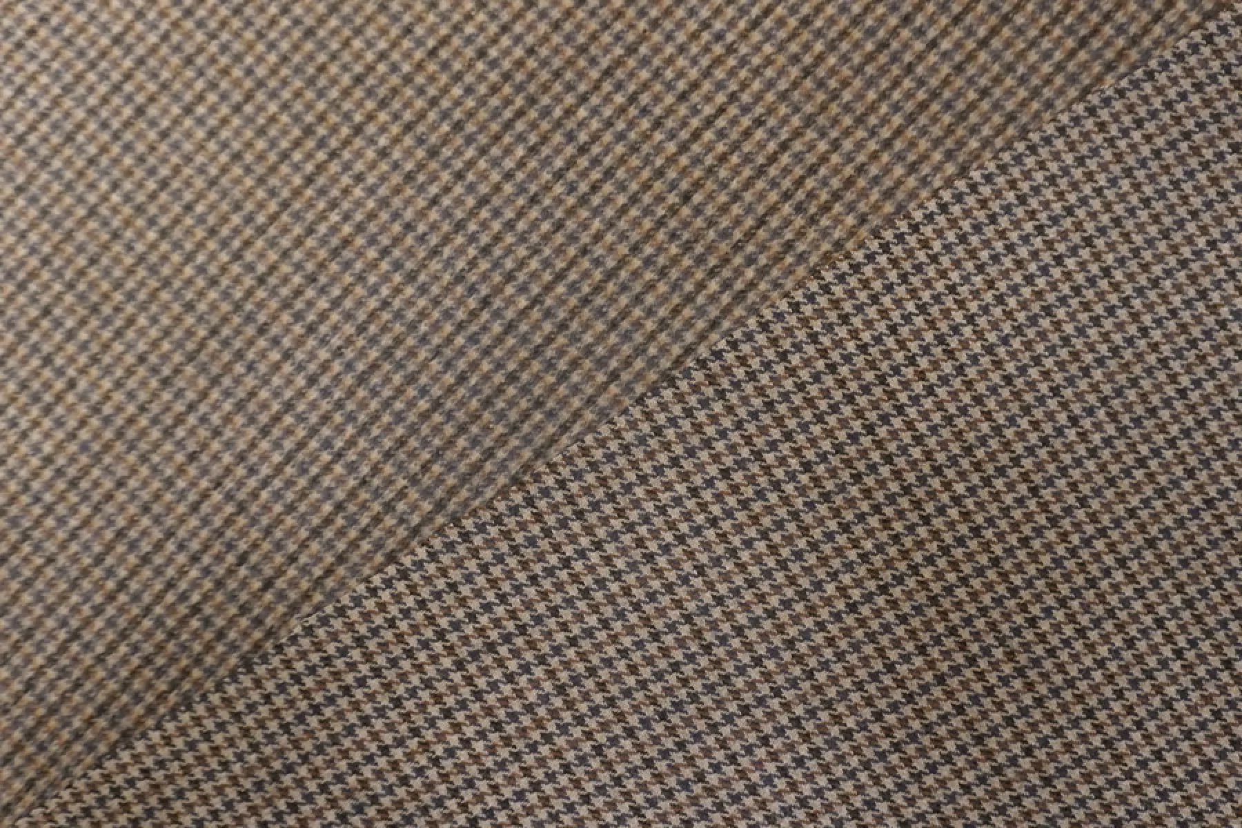 Костюмная шерстяная фланель диагонального плетения светло-коричневого оттенка в мелкую клетку, лицевая сторона с коротким направленным ворсом. Тактильно приятная, мягкая, немного суховатая, не колется. Не тянется и не просвечивает. Достаточно плотненькая. Не мнется. Обладает легким лоском. Пластичная. Хорошо драпируется и держит форму. Шьем костюмы, жакеты, юбки или теплые рубашки. Подойдет как в мужской, так и женский гардероб. Уход деликатный.