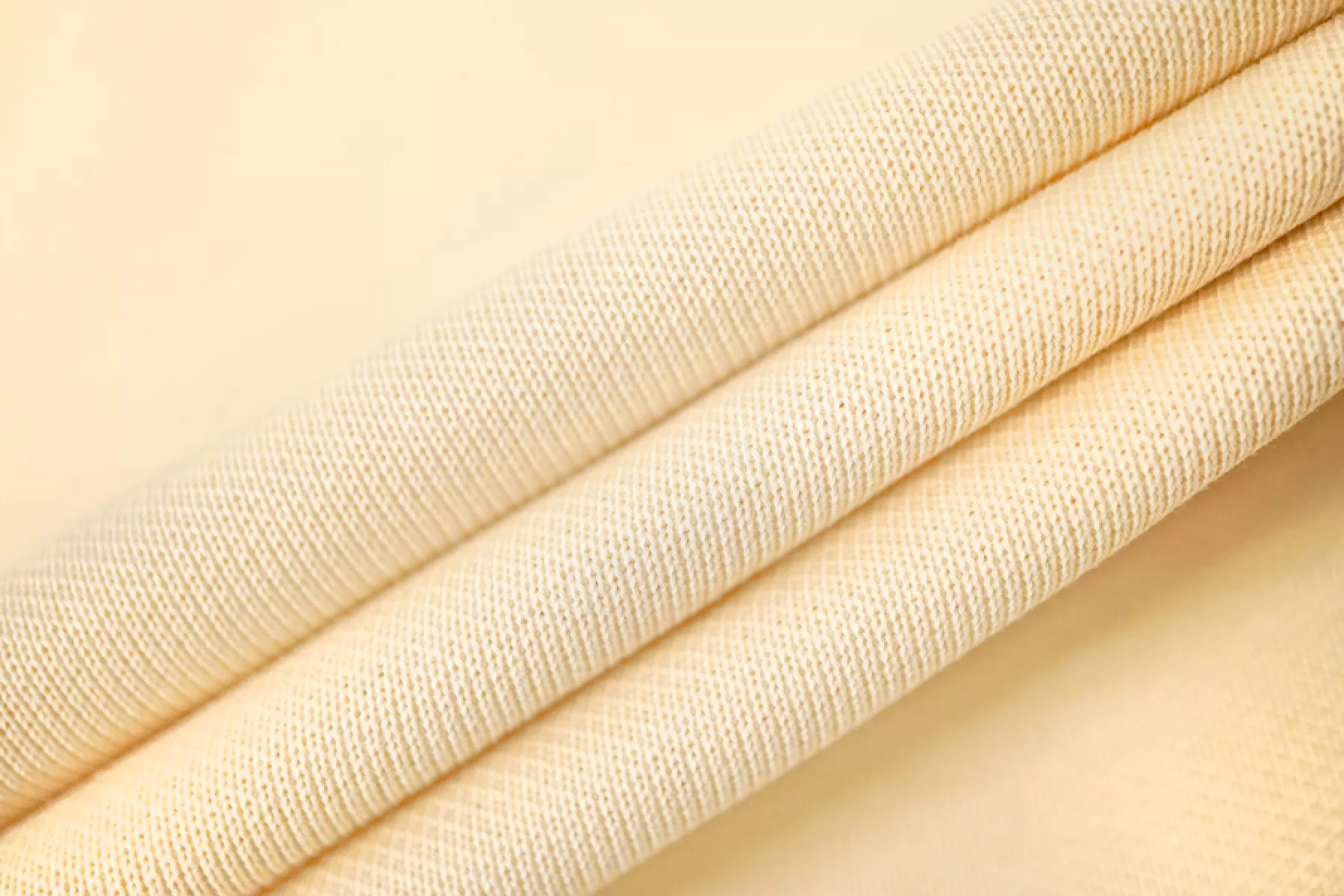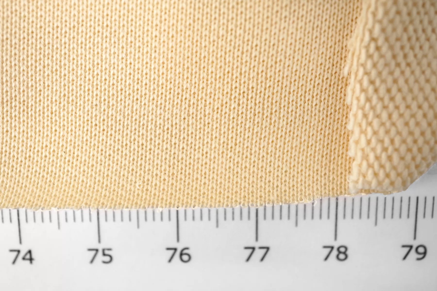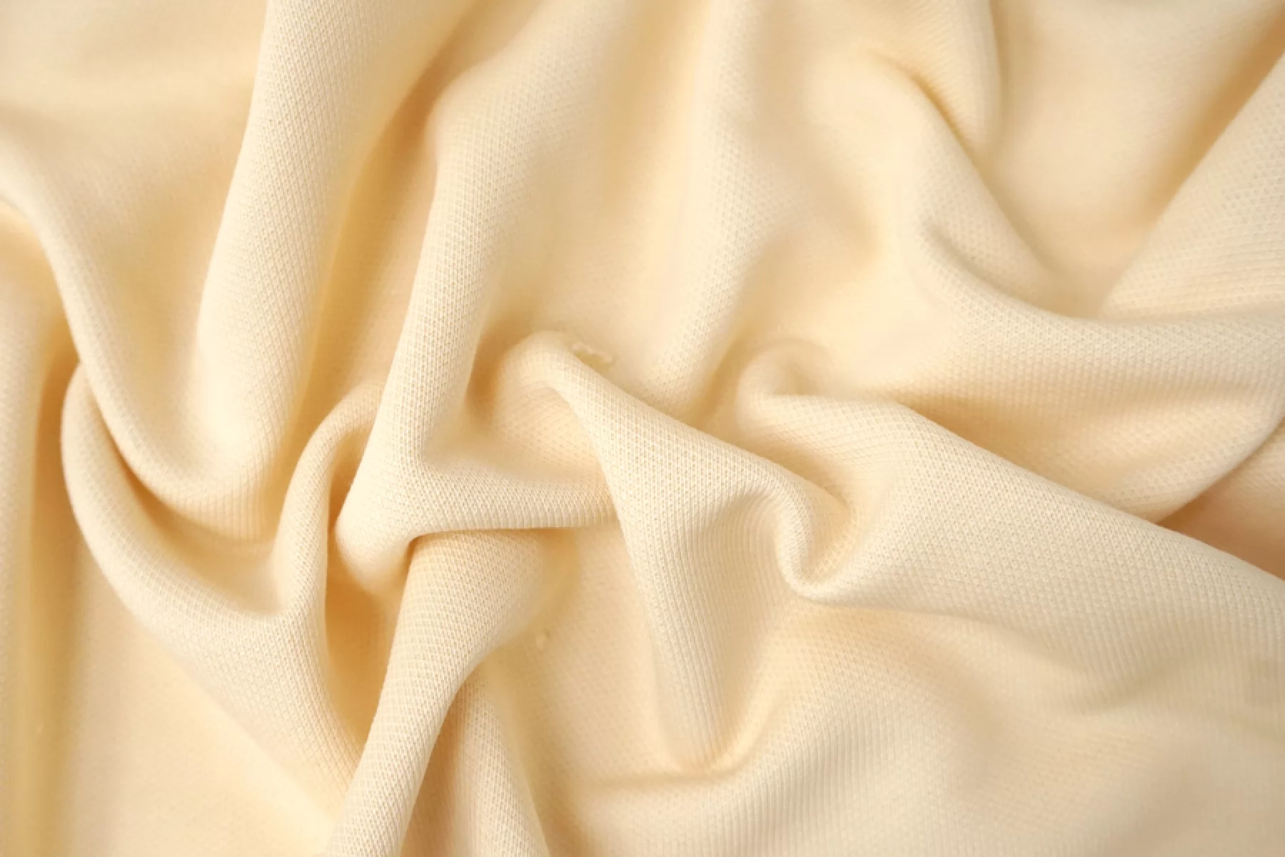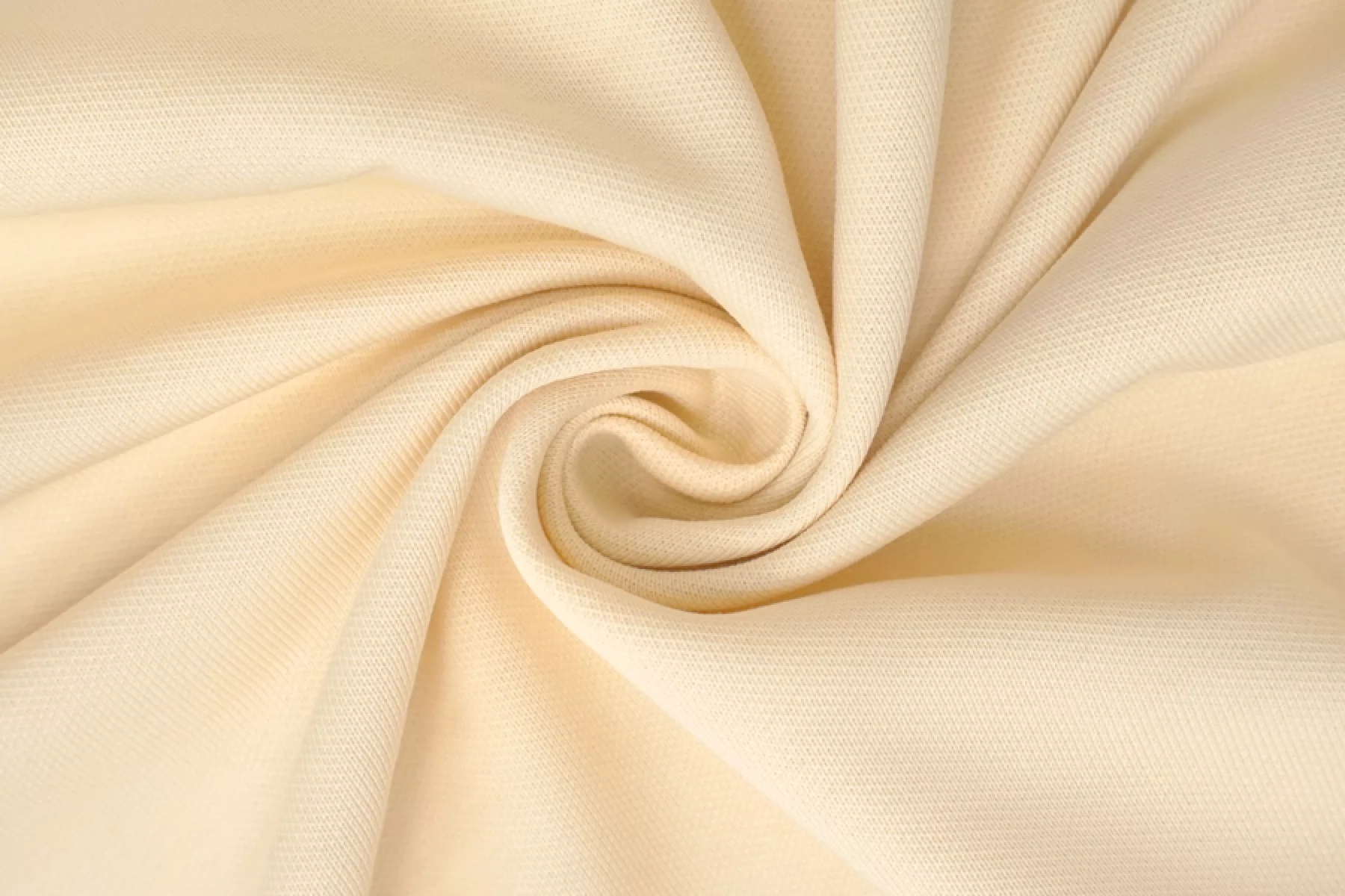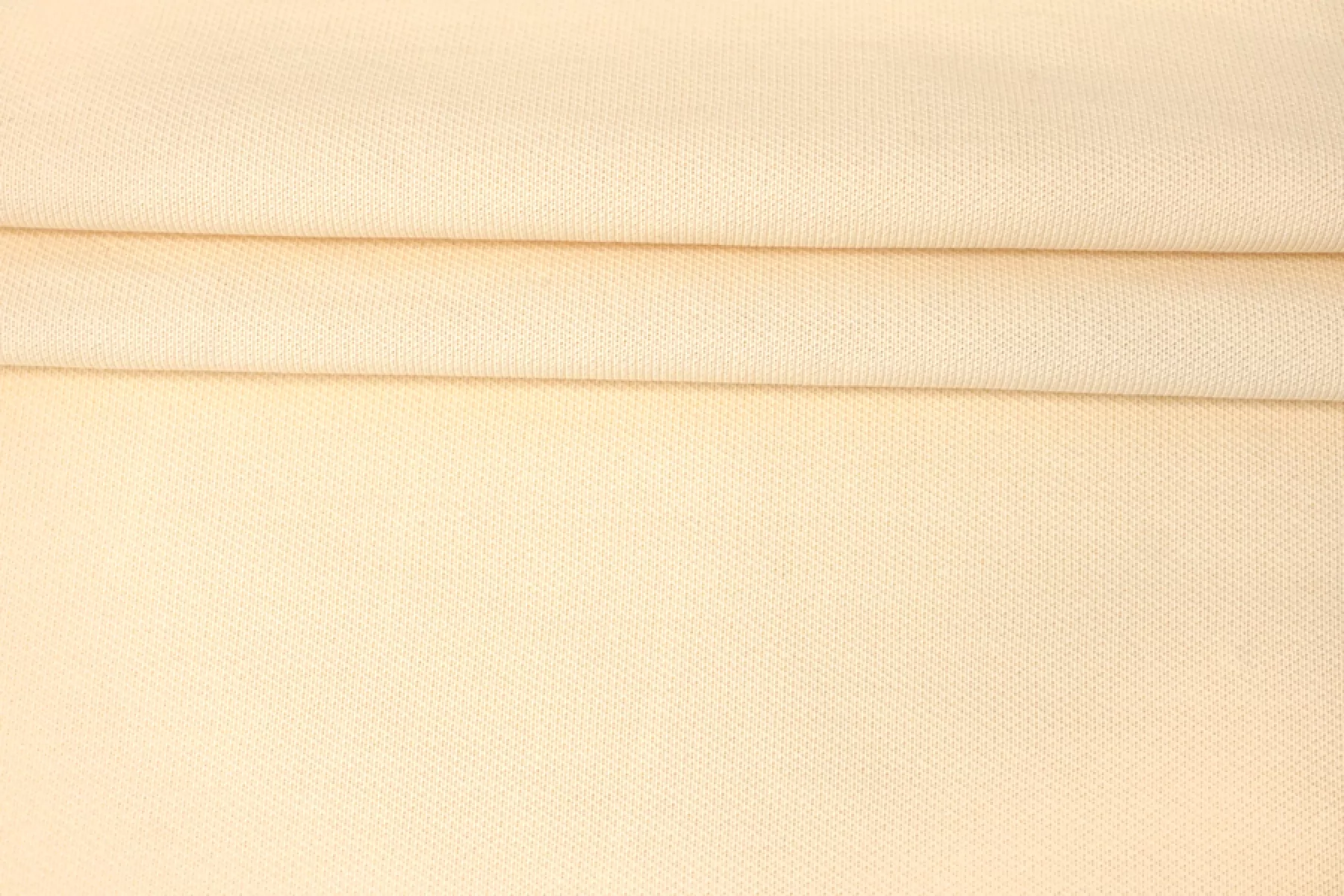 Тонкий, но плотненький трикотаж-футер из хлопка 2-х нитка красивого кремово-бежевого оттенка. Тактильно приятный. Совсем слабо заметен силуэт на просвет. Красив в пластике. Немного тянется за счет плетения. Неплохо держит форму. Слегка мнется. Подойдет для пошива футболки, лонгслива, легкой кофты, домашней одежды (шорт, футболок, легких штанов), детской одежды, платья-майки или платья-футболки. У материала очень хорошая ширина.