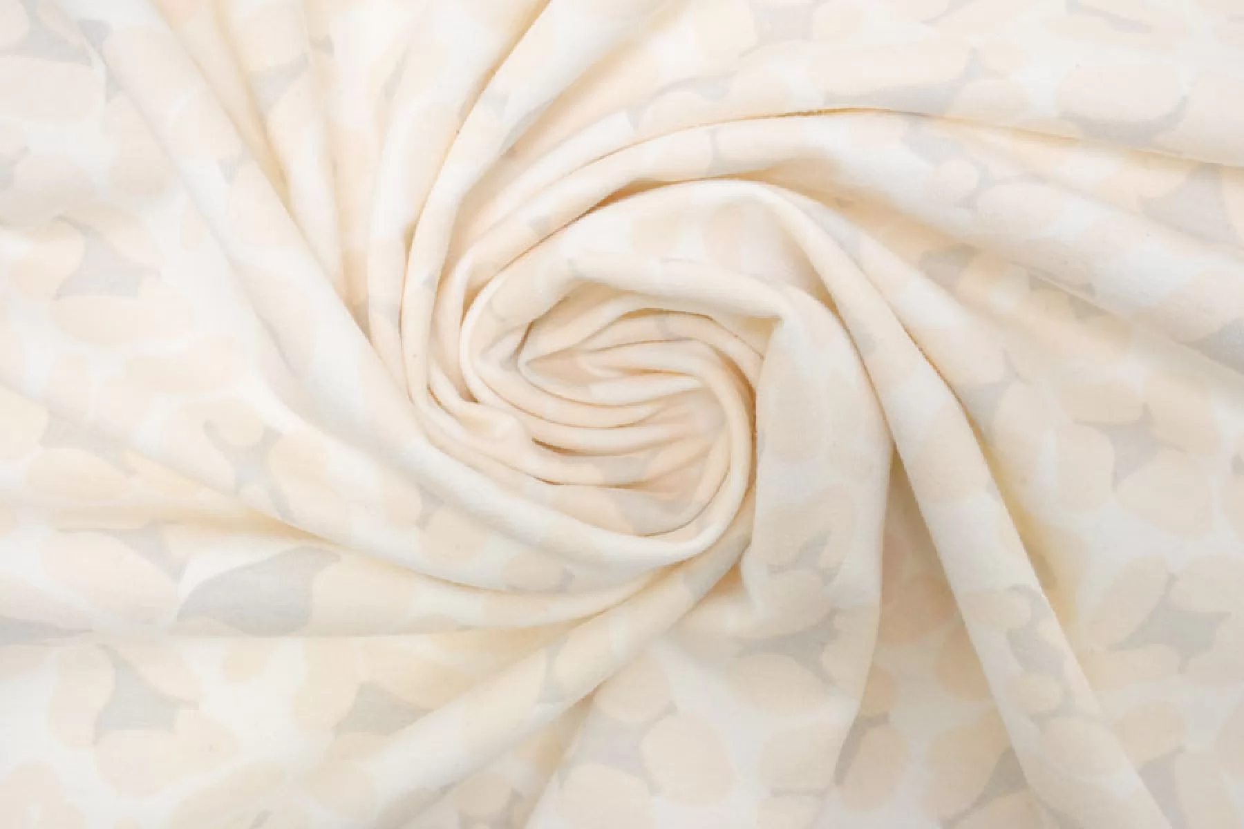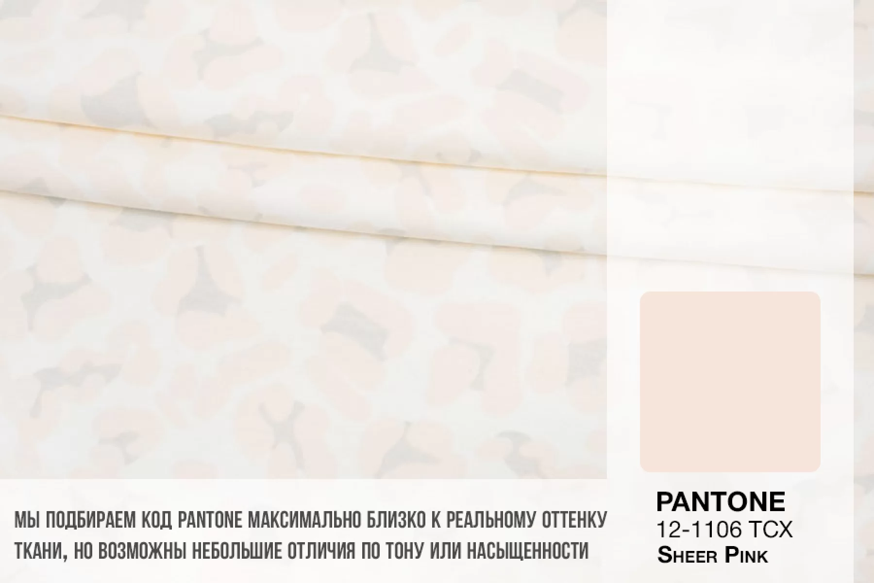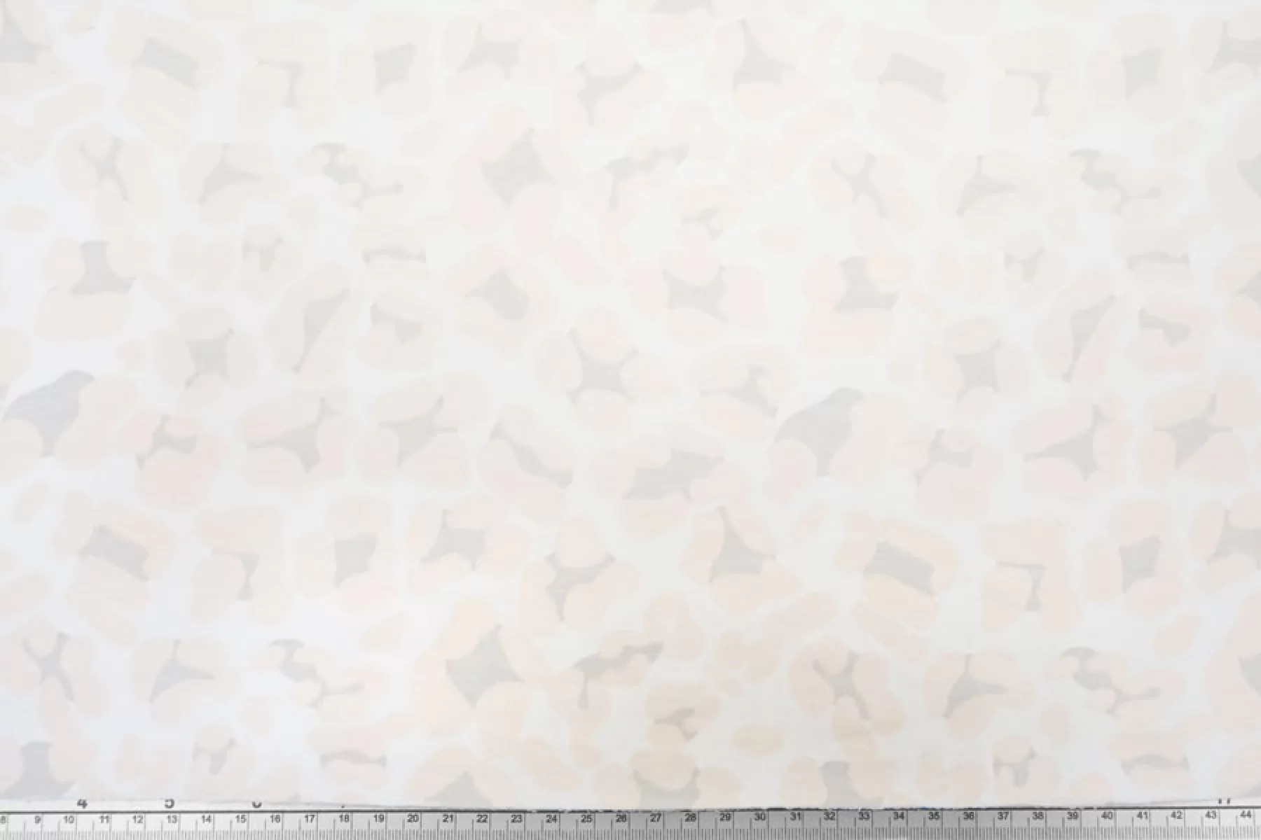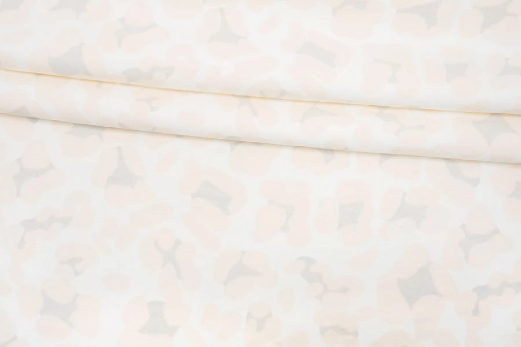 Внимание! По всей длине рулона по центру грязная полоса см. фото. Тонкий, но плотненький трикотаж-футер из хлопка 2-х нитка белого цвета со стилизованными леопардовыми пятнами очень светлого персикового цвета. Тактильно приятный. Минимально заметен силуэт на просвет в один слой. Тянется за счет плетения. Неплохо держит форму. Слегка мнется. Подойдет для пошива футболки, лонгслива, легкой кофты, домашней одежды (шорт, футболок, легких штанов), детской одежды, платья-майки или платья-футболки. У материала хорошая ширина.