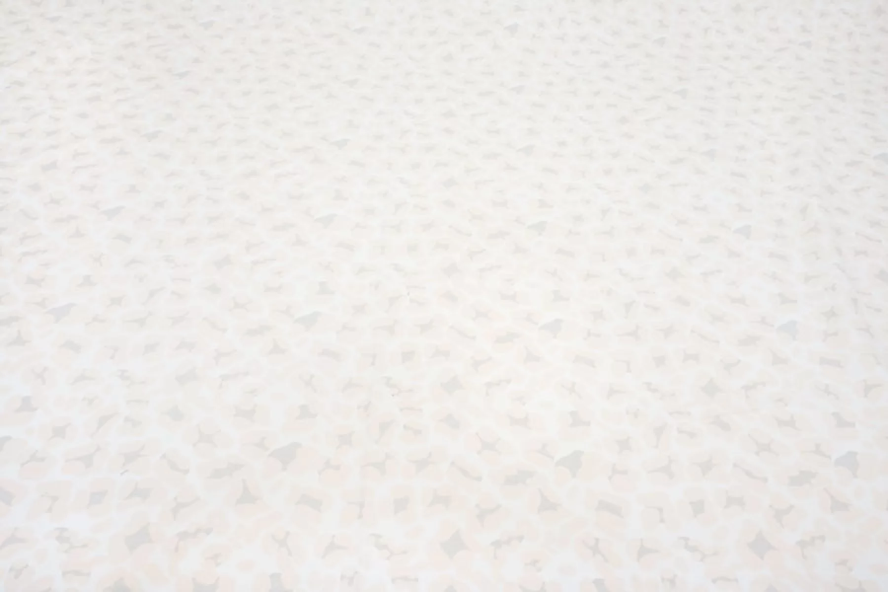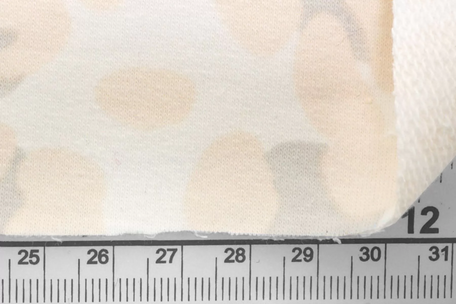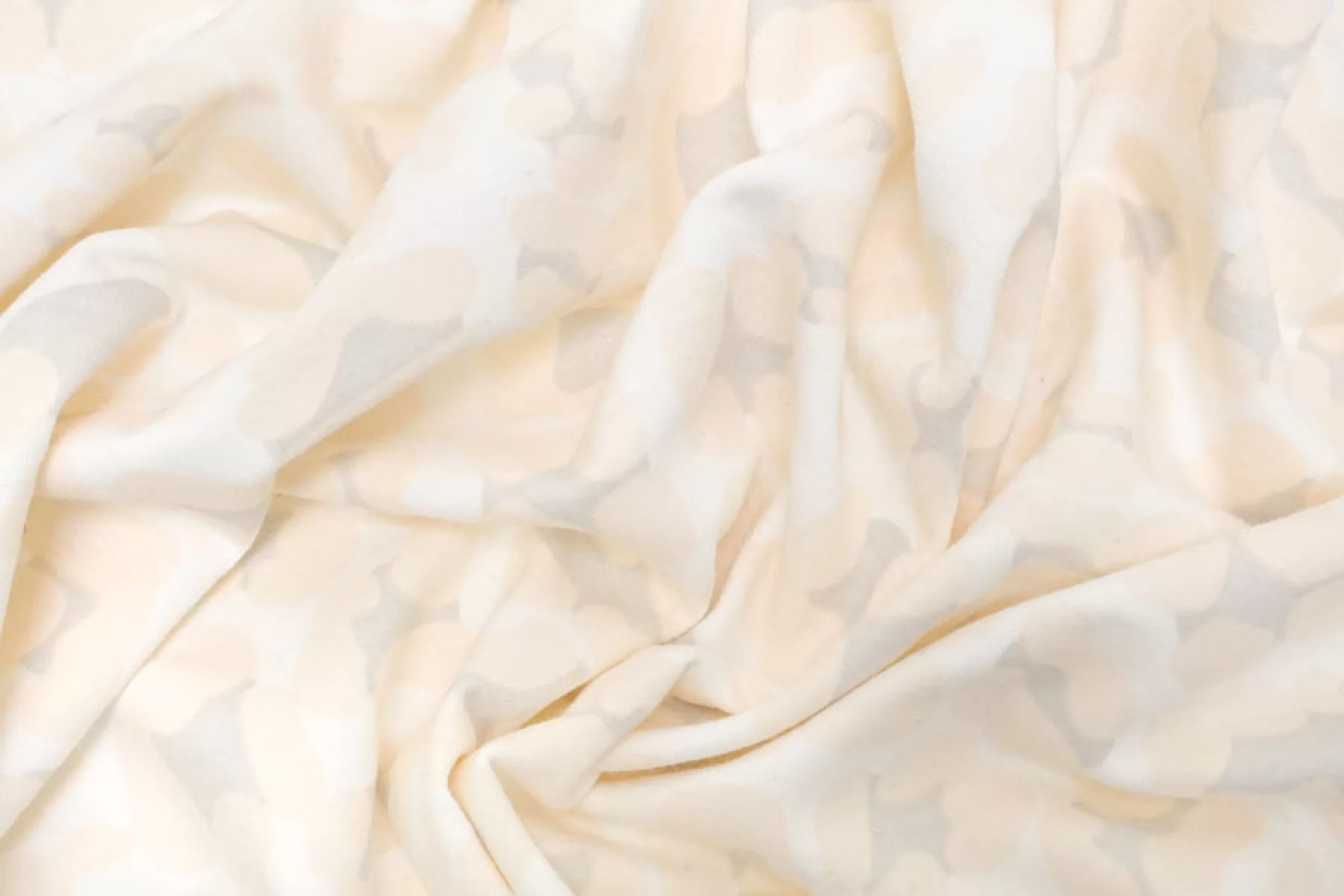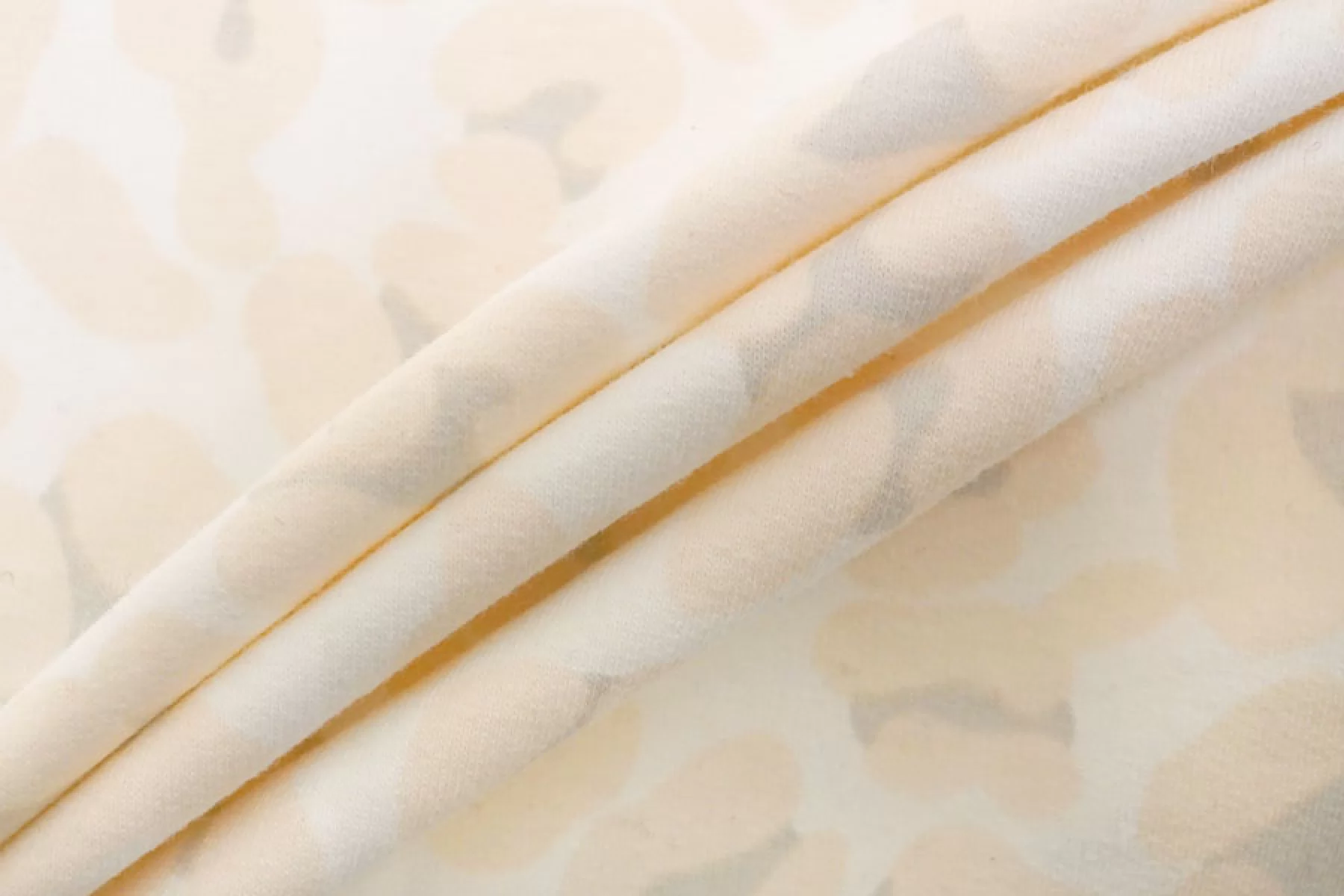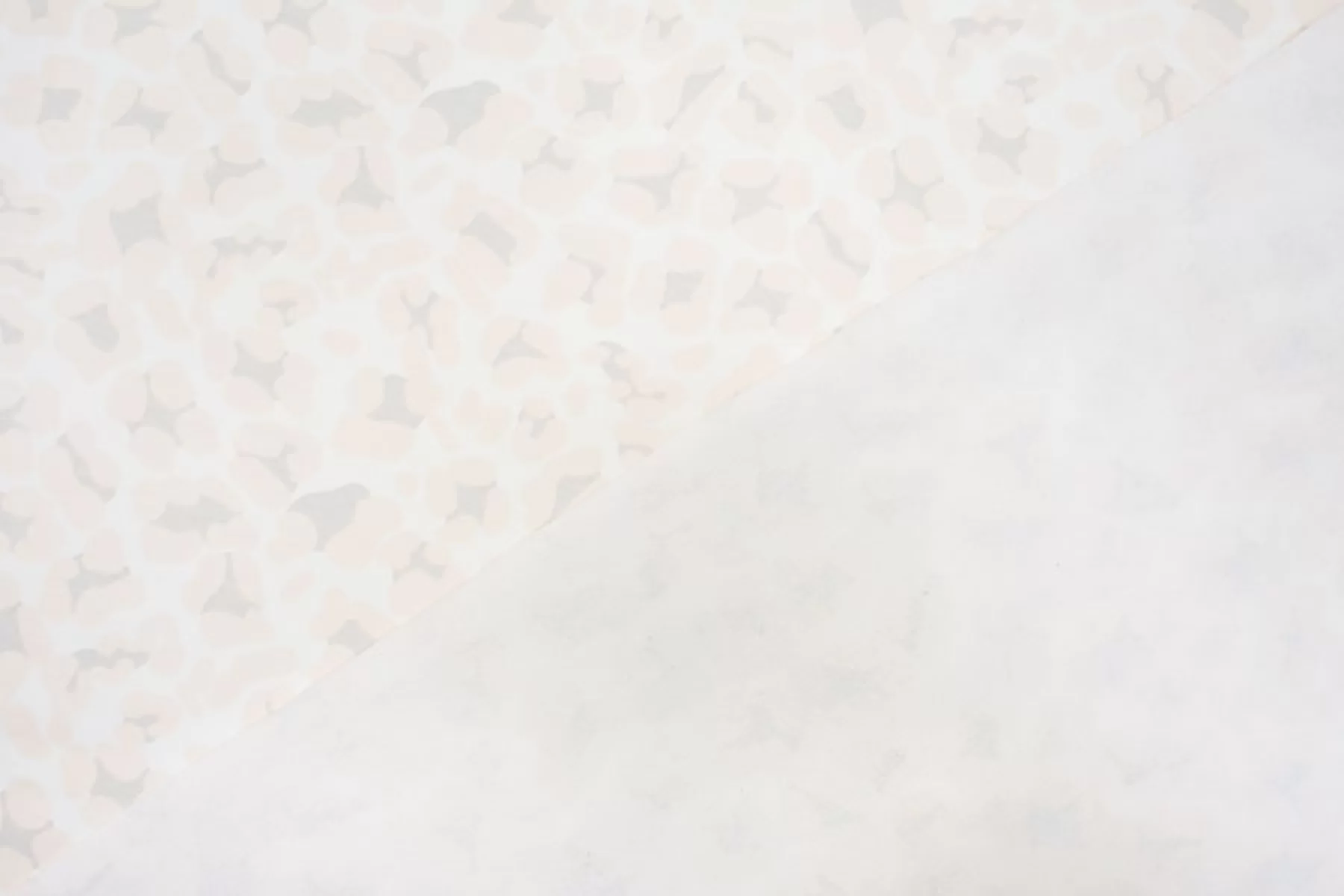 Внимание! По всей длине рулона по центру грязная полоса см. фото. Тонкий, но плотненький трикотаж-футер из хлопка 2-х нитка белого цвета со стилизованными леопардовыми пятнами очень светлого персикового цвета. Тактильно приятный. Минимально заметен силуэт на просвет в один слой. Тянется за счет плетения. Неплохо держит форму. Слегка мнется. Подойдет для пошива футболки, лонгслива, легкой кофты, домашней одежды (шорт, футболок, легких штанов), детской одежды, платья-майки или платья-футболки. У материала хорошая ширина.