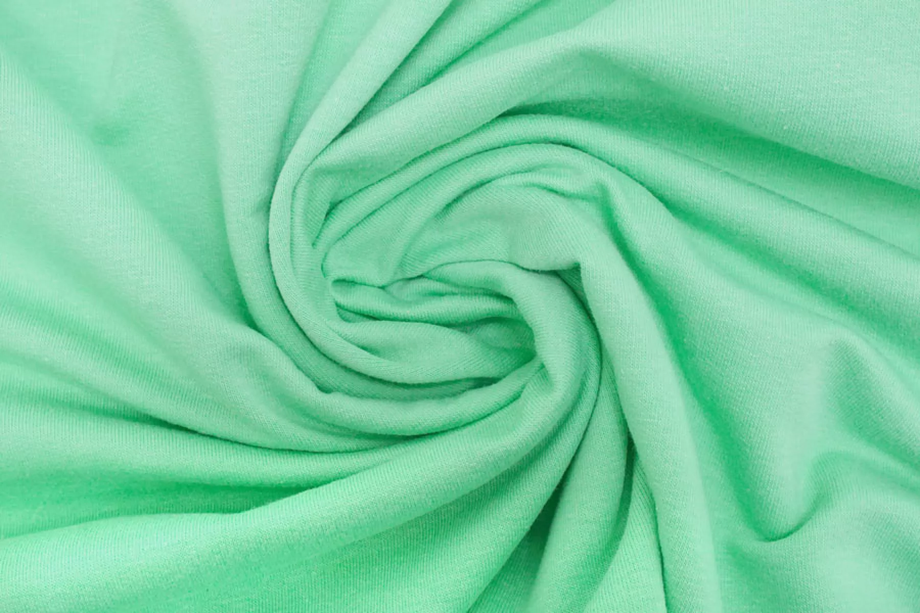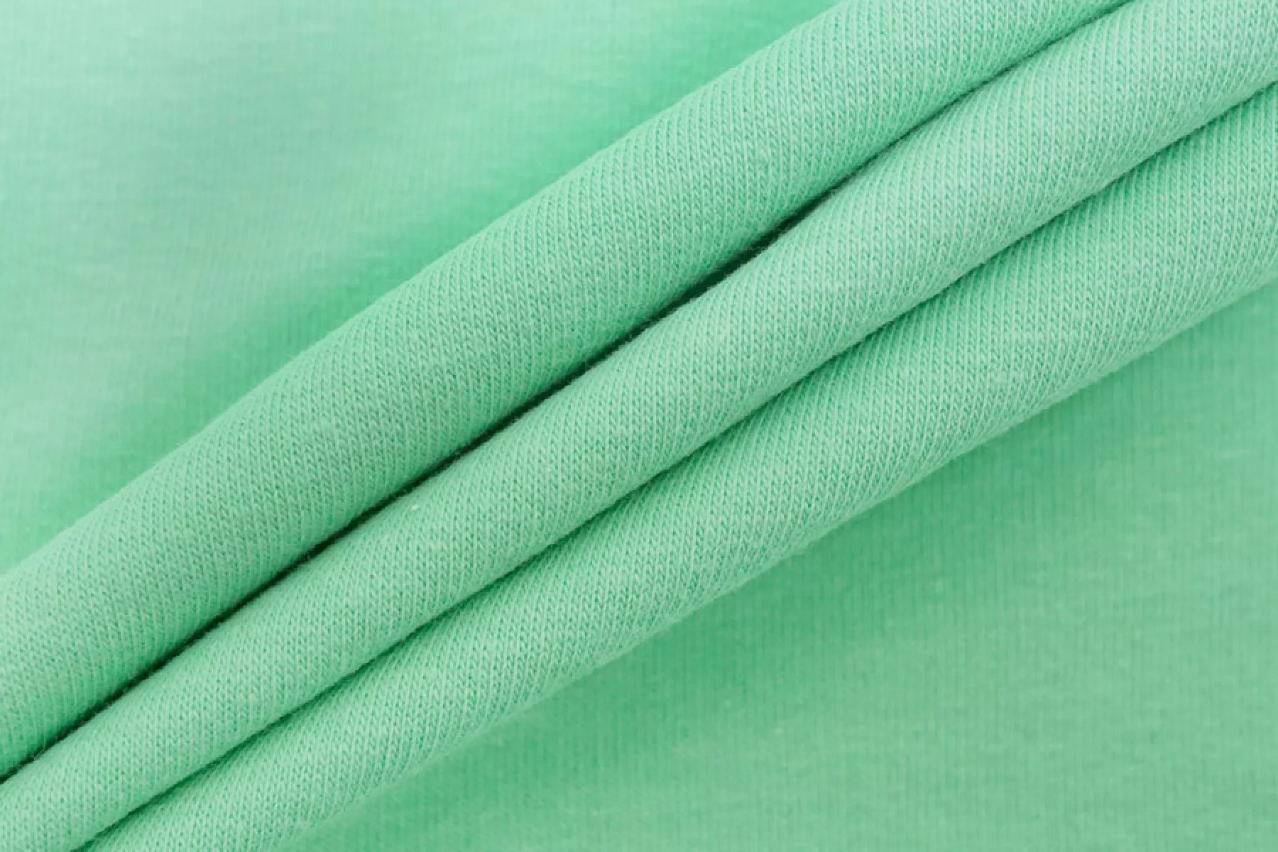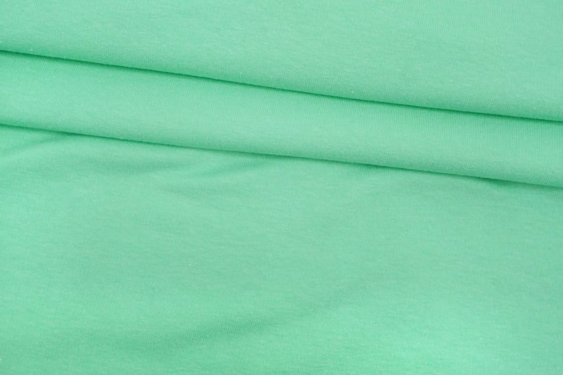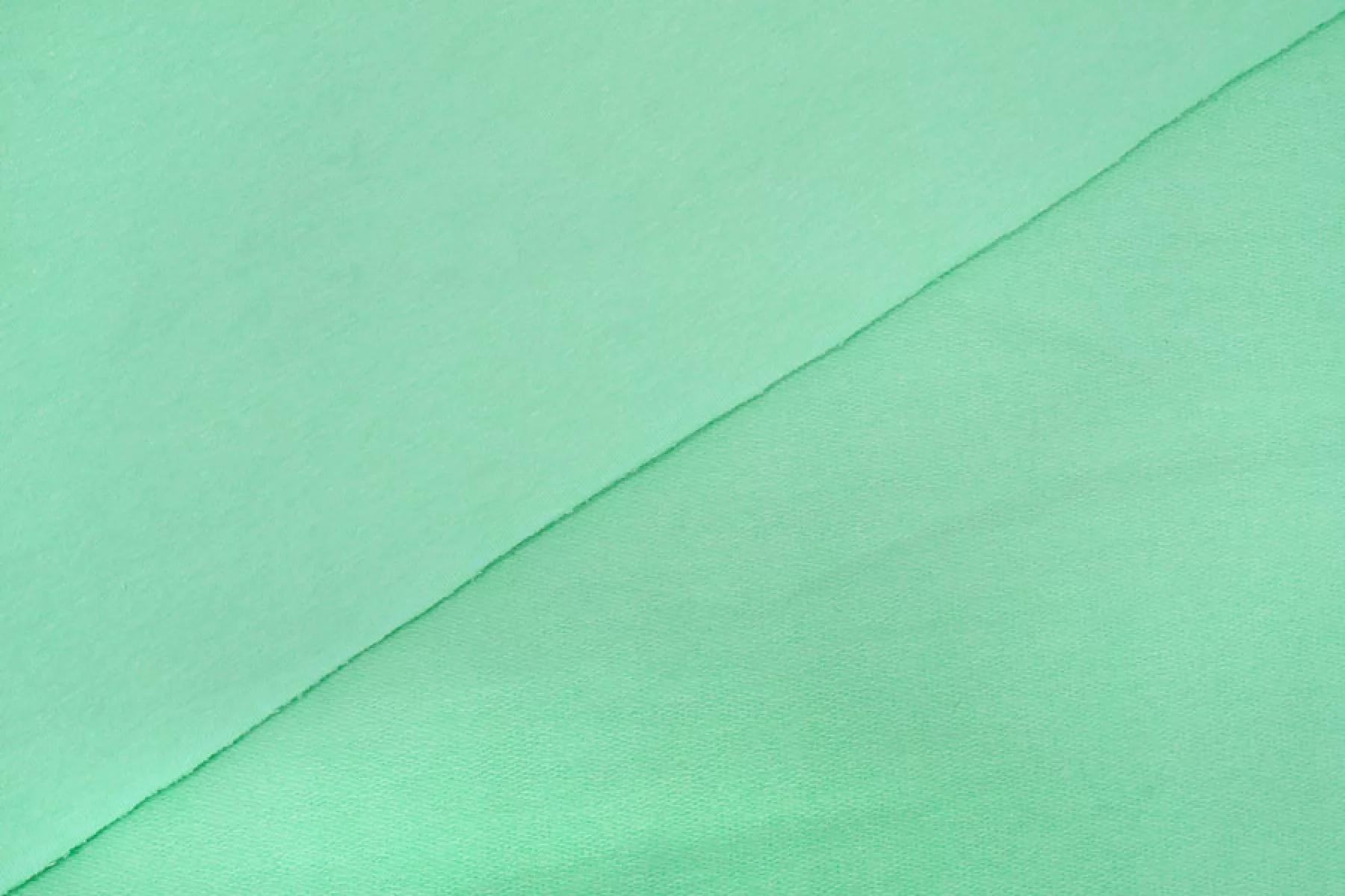 Тонкий, но плотненький трикотаж-футер из хлопка 2-х нитка в оттенке зелёной мяты. Тактильно приятный. Минимально заметен силуэт на просвет в один слой. Тянется за счет плетения. Неплохо держит форму. Слегка мнется. Подойдет для пошива футболки, лонгслива, легкой кофты, домашней одежды (шорт, футболок, легких штанов), детской одежды, платья-майки или платья-футболки. У материала хорошая ширина.