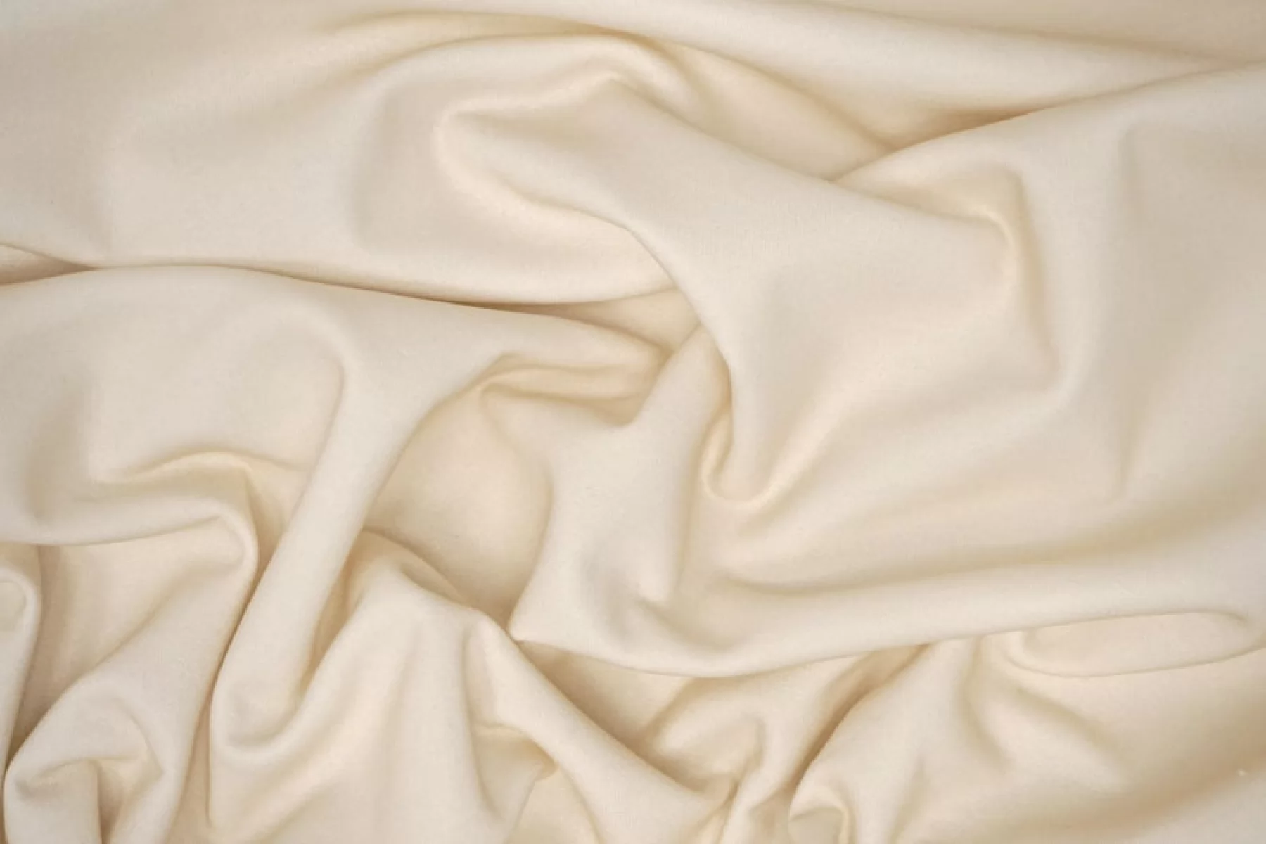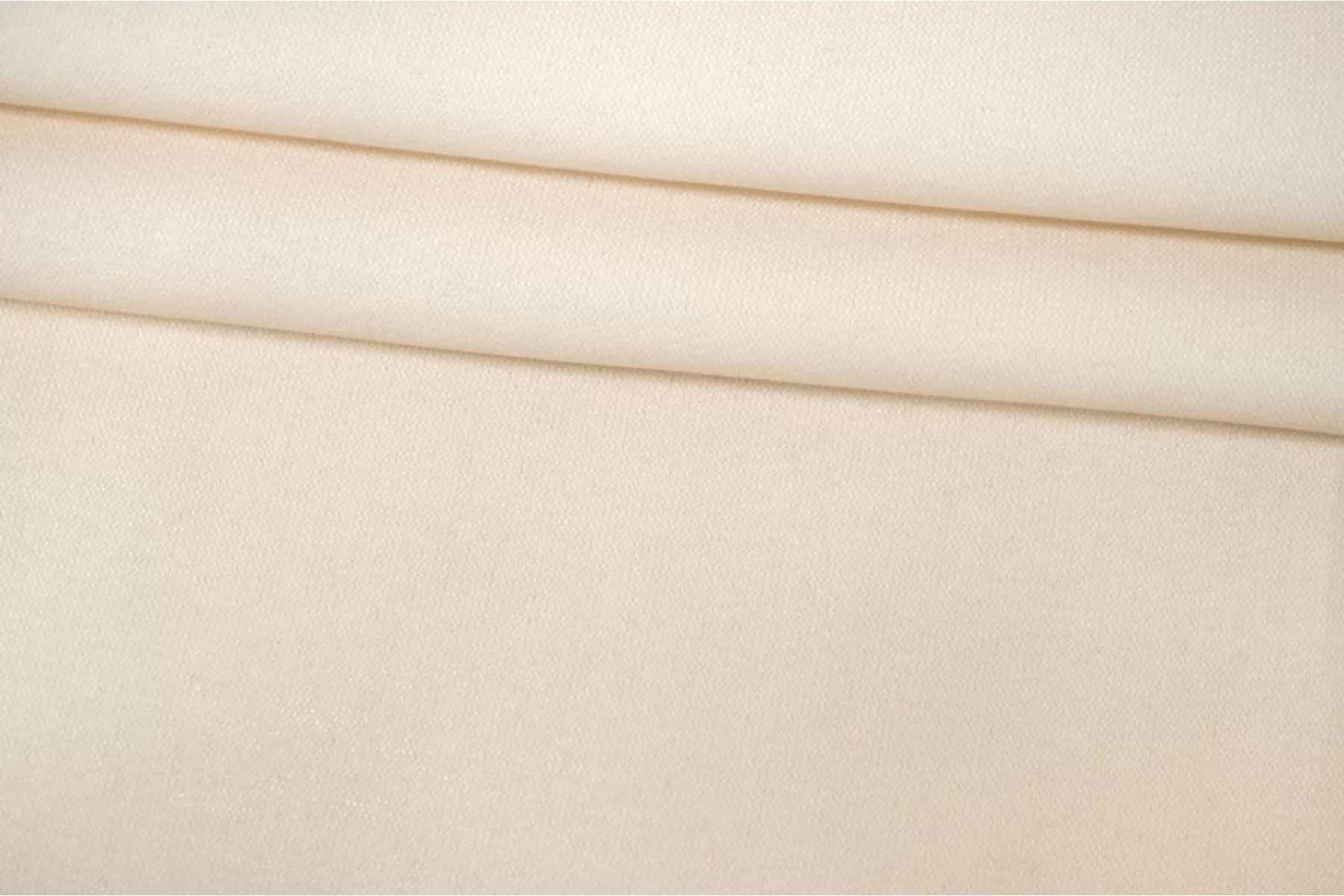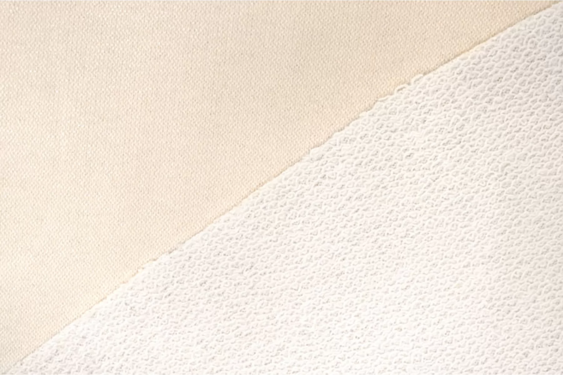 Хлопковый футер оттенка слоновой кости с накатом, который придает приятный блеск материалу и жесткость. Обратная сторона - петля белого оттенка. Тактильно шероховатый, хорошо держит форму и драпируется. Плотненький. Не просвечивает, но совсем слегка может прослеживаться тень силуэта. Несильно и упруго тянется за счет вязки. Сминается, но восстанавливается практически полностью. Классный вариант для свитшотов, худи или спортивных брюк.