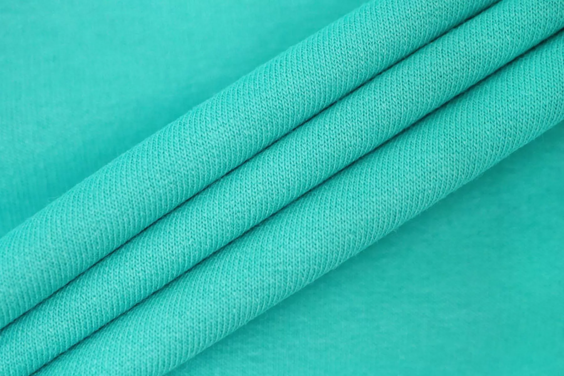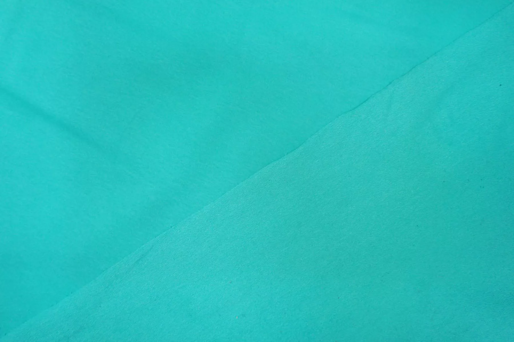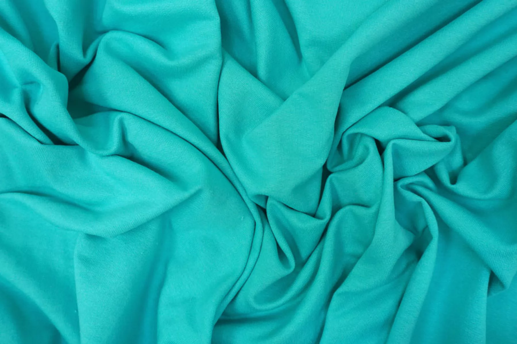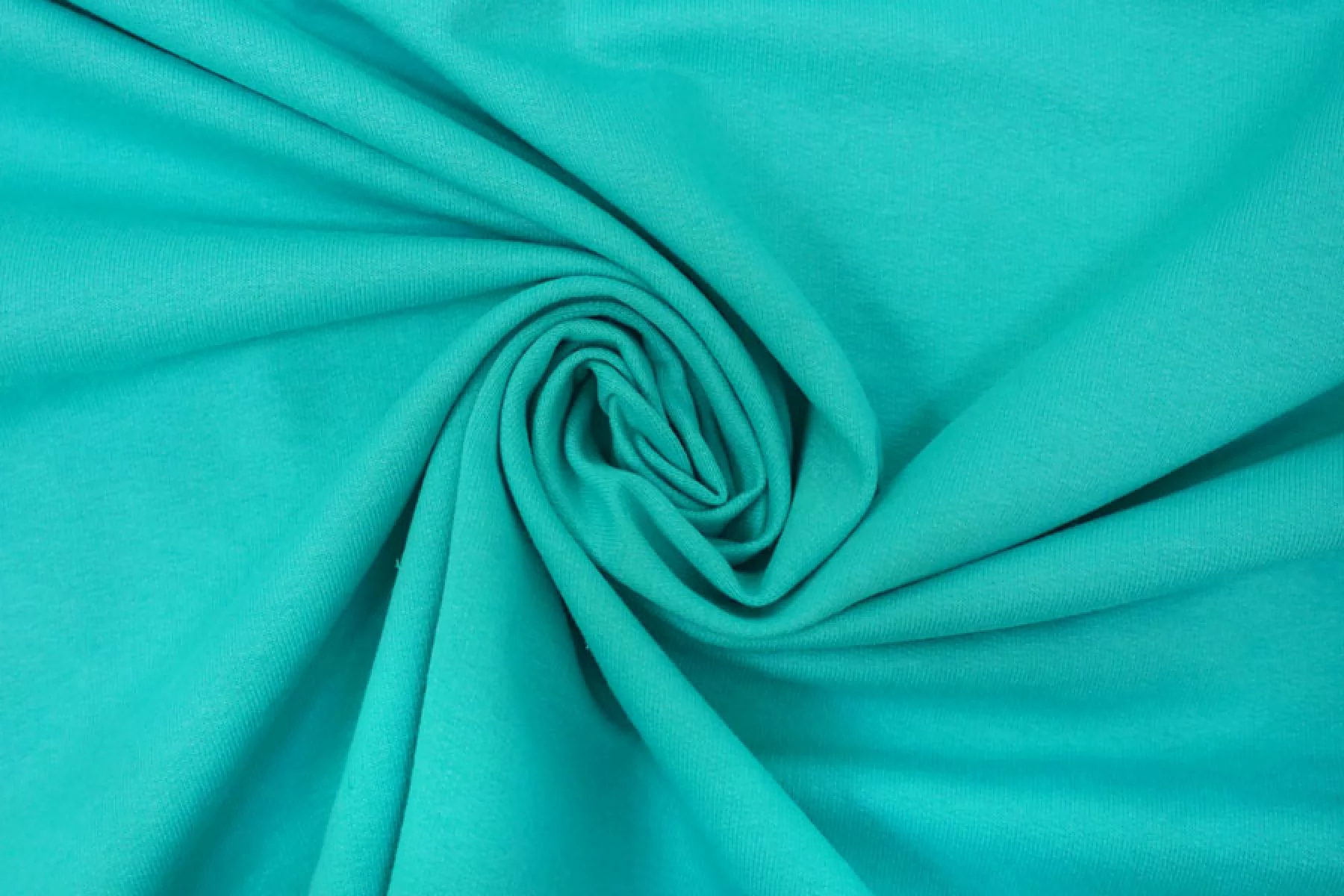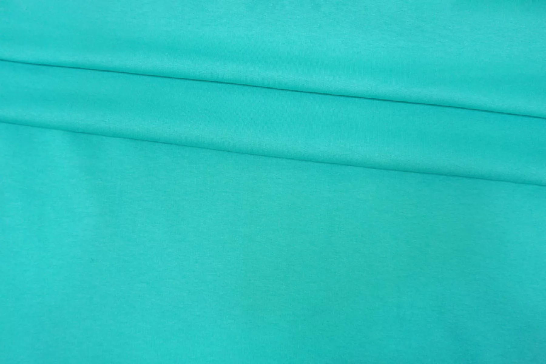 Прекрасный италянский хлопковый футер петля 2-х нитка тонкий в ярком бирюзовом оттенке. Очень приятный и мягкий наощупь. Хорошо тянется. Не просвечивает. Держит форму, при этом пластичный. Отличный вариант на теплые комфортные спортивные и домашние костюмы, а также платья, лонгсливы, свитшоты, штаны или шорты.