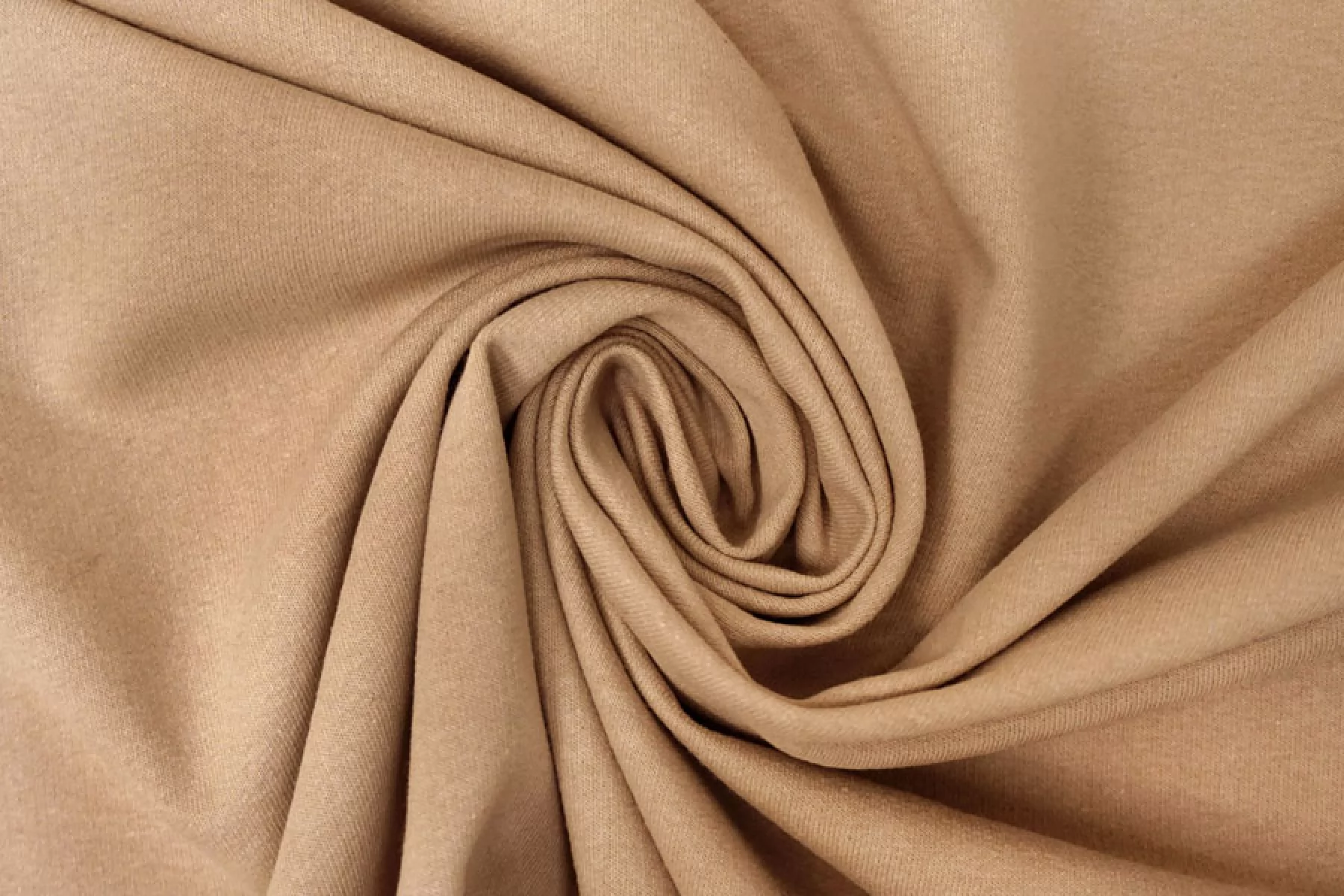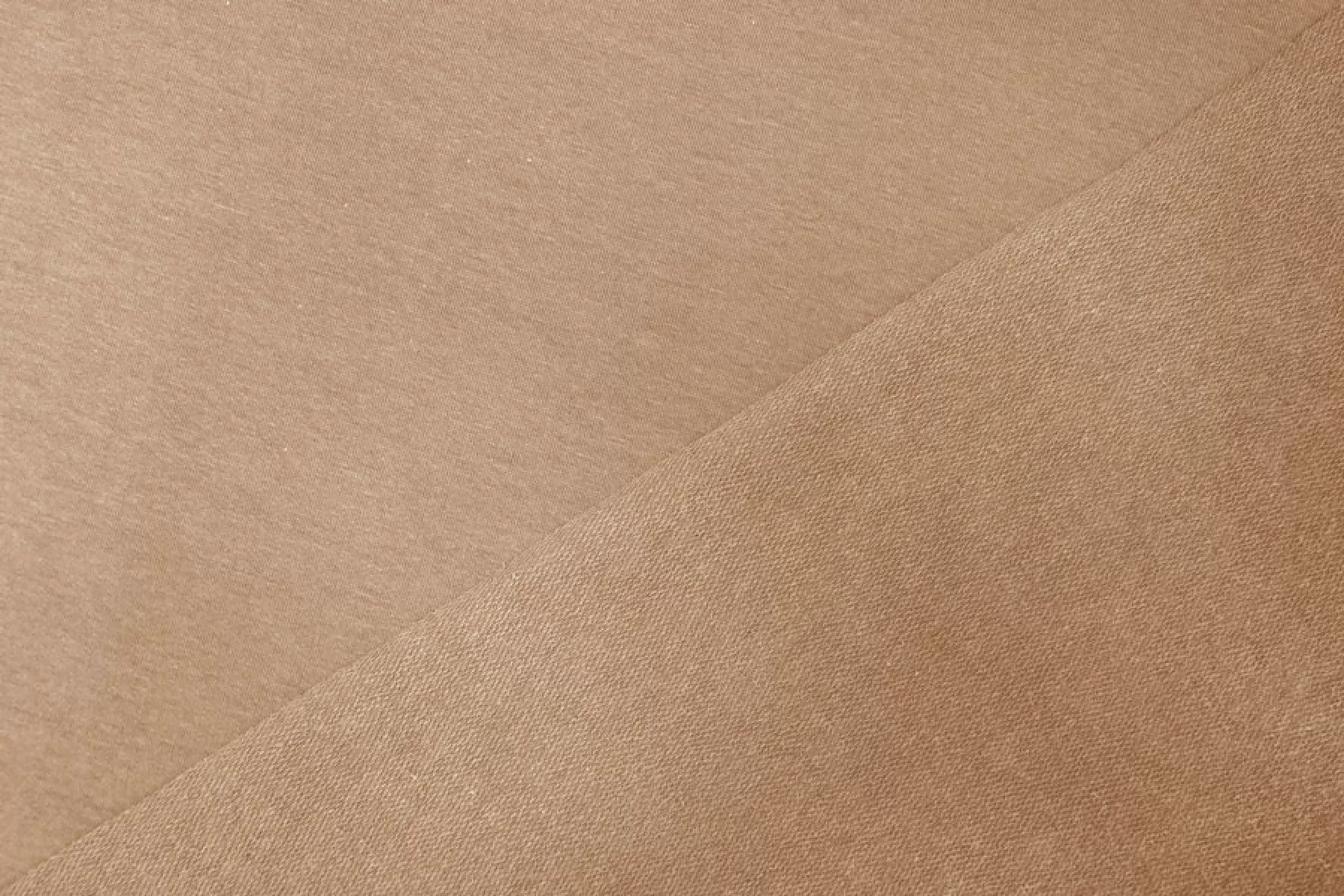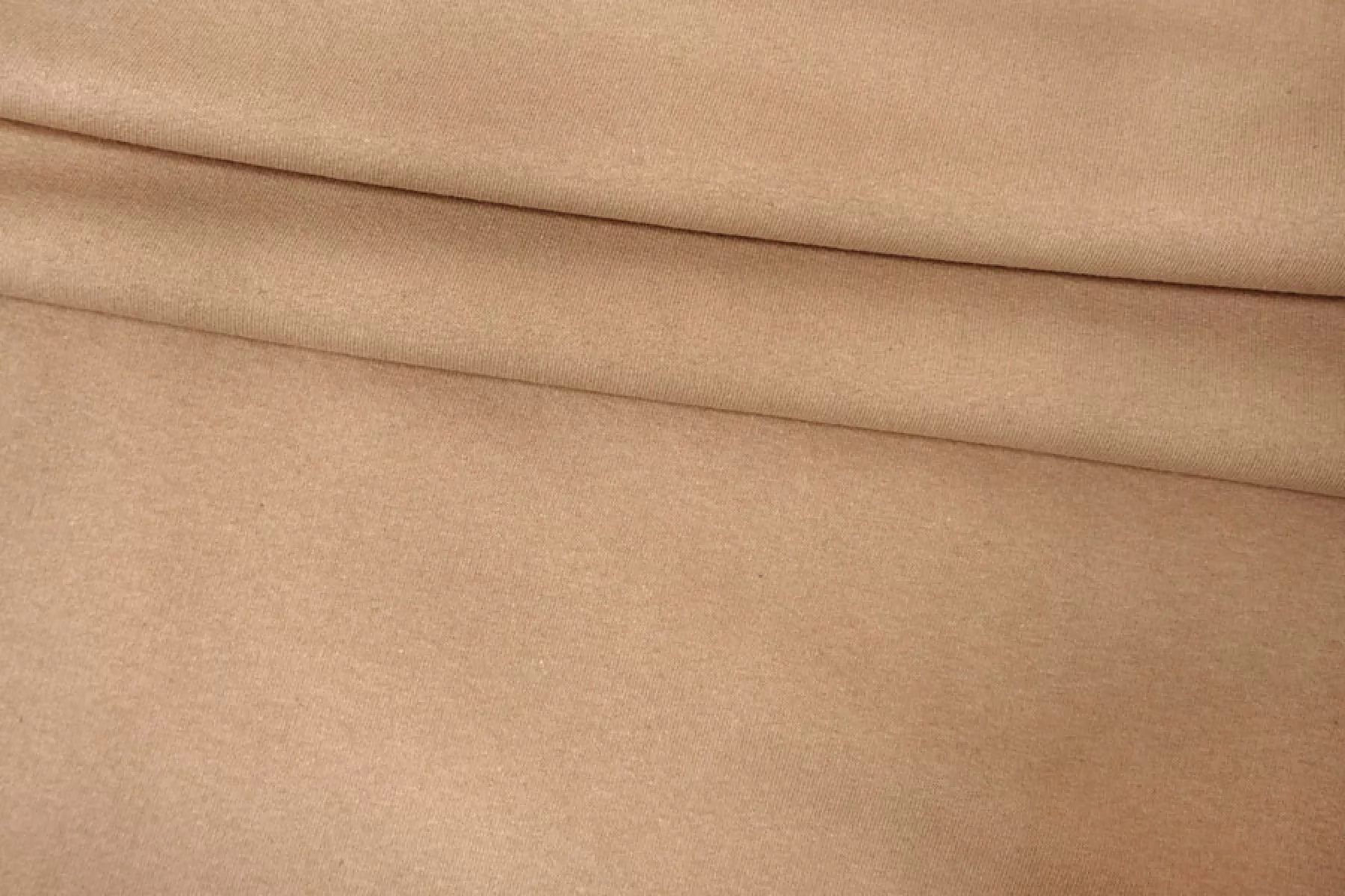 Прекрасный италянский хлопковый футер петля 2-х нитка тонкий в приятном оттенке кэмел. Очень приятный и мягкий наощупь. Хорошо тянется. Не просвечивает. Держит форму, при этом пластичный. Отличный вариант на теплые комфортные спортивные и домашние костюмы, а также платья, лонгсливы, свитшоты, штаны или шорты.