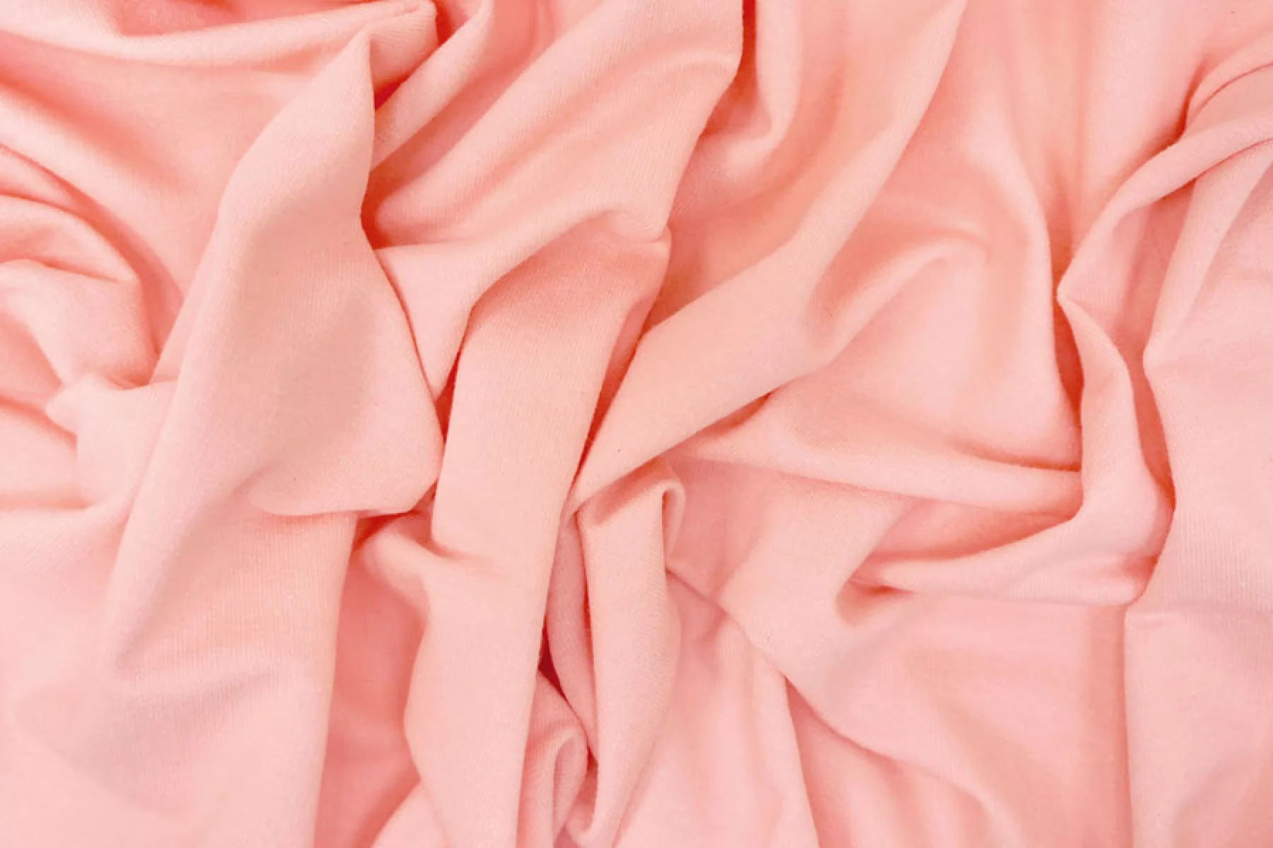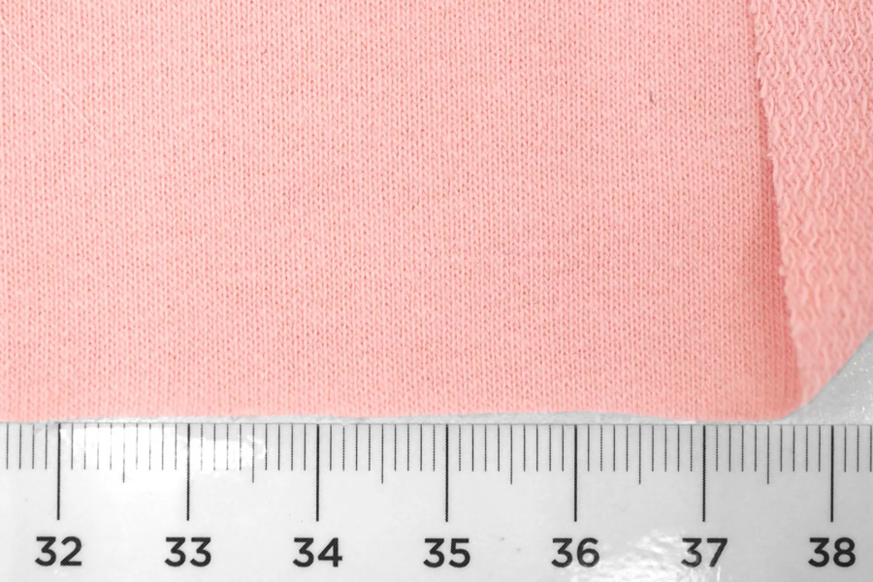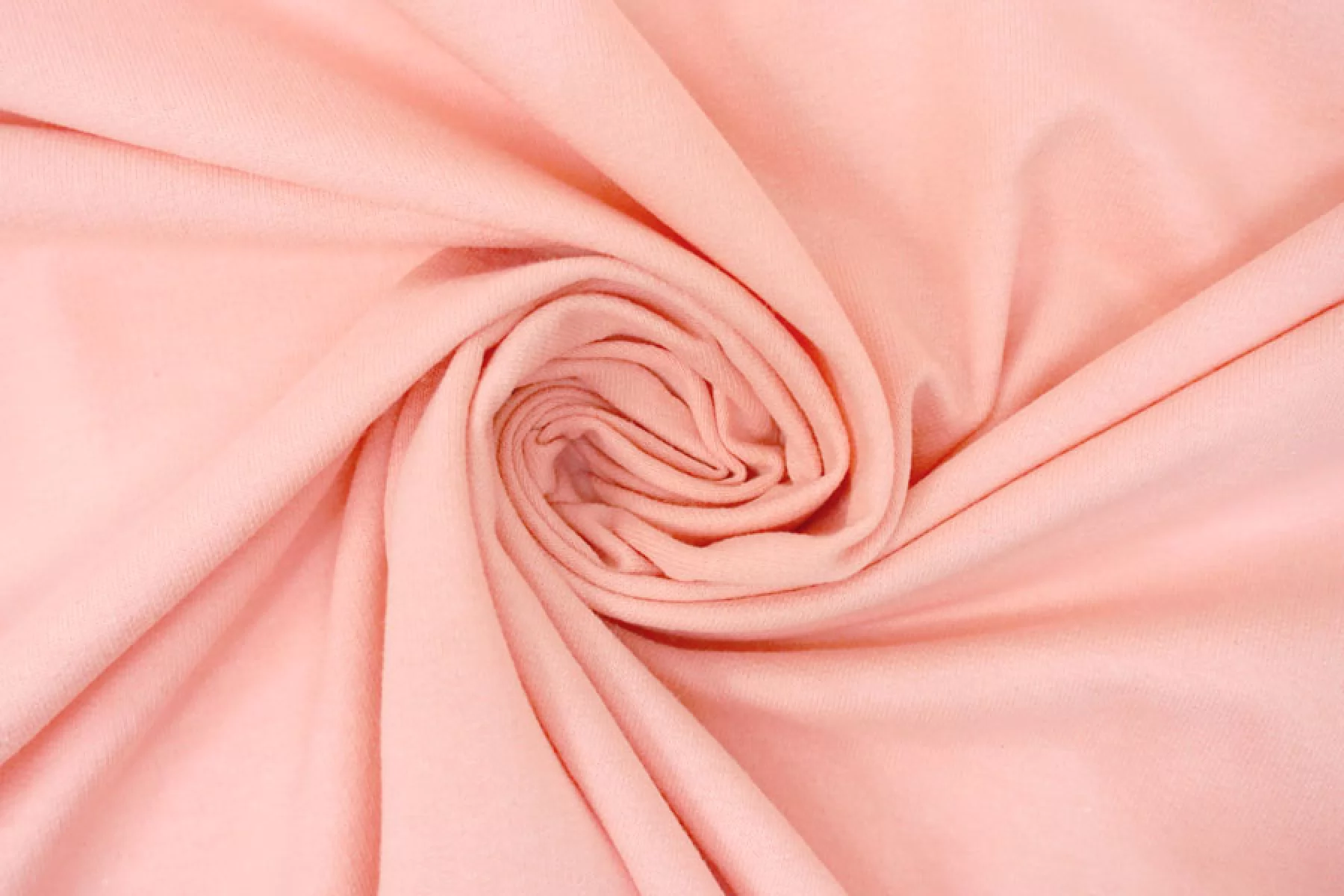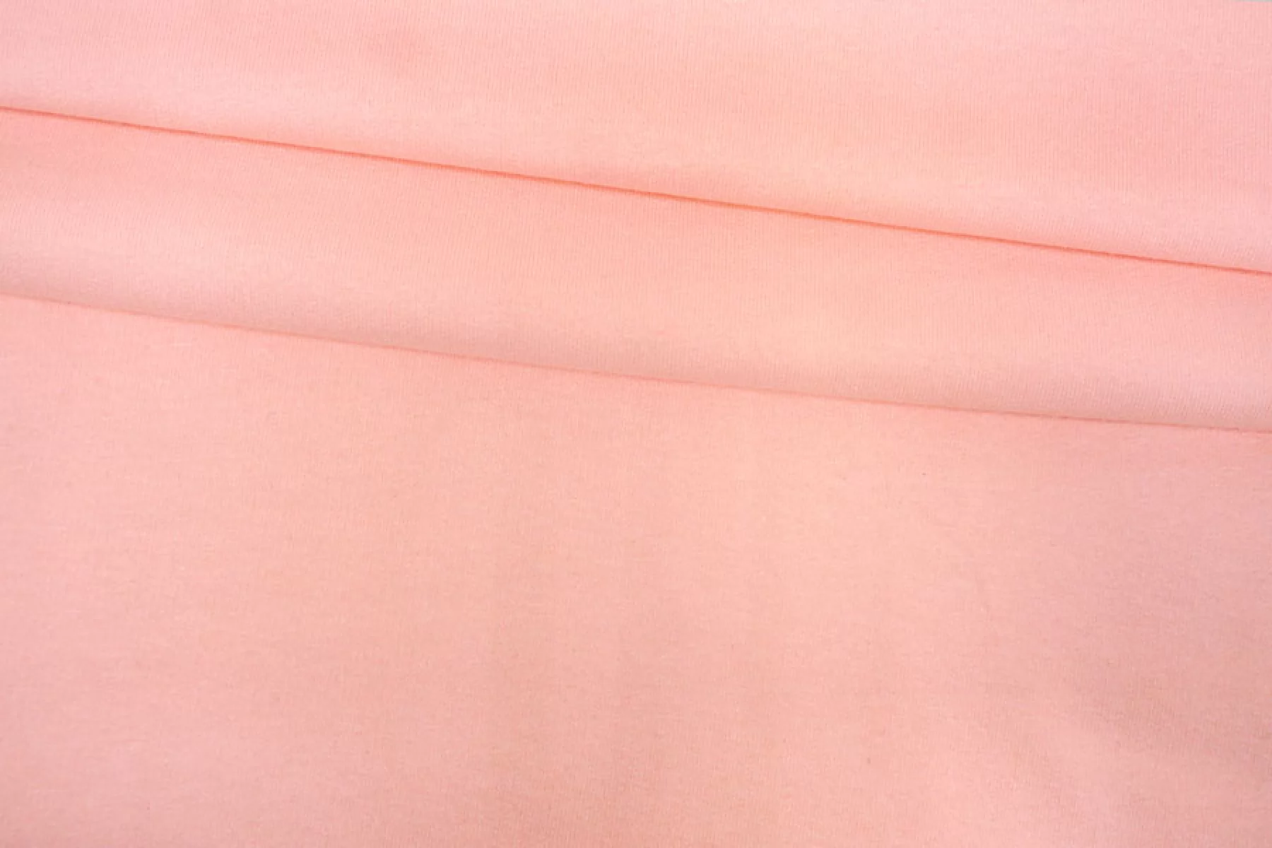 Прекрасный италянский хлопковый футер петля 2-х нитка тонкий в нежном розовом оттенке. Очень приятный и мягкий наощупь. Хорошо тянется. Немного просвечивает силуэт на просвет. Держит форму, при этом пластичный. Отличный вариант на теплые комфортные спортивные и домашние костюмы, а также платья, лонгсливы, свитшоты, штаны или шорты.
