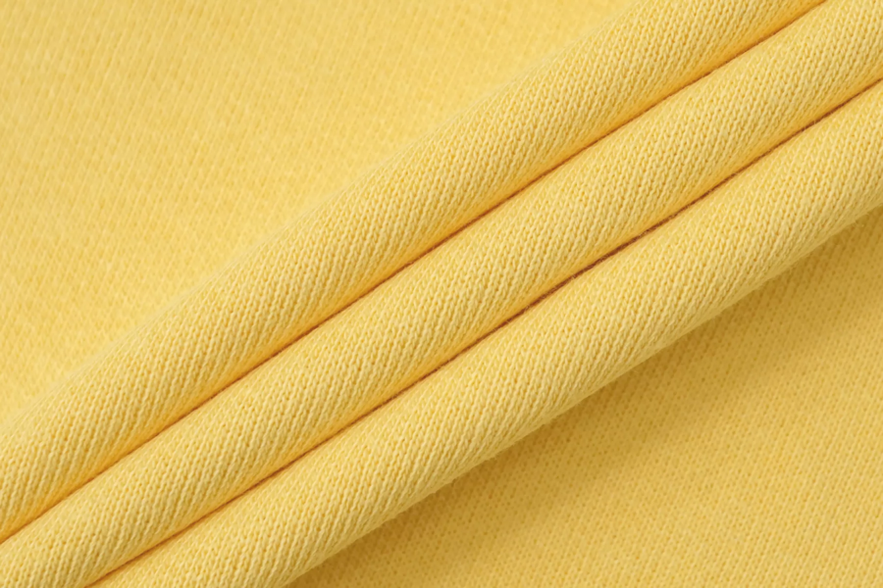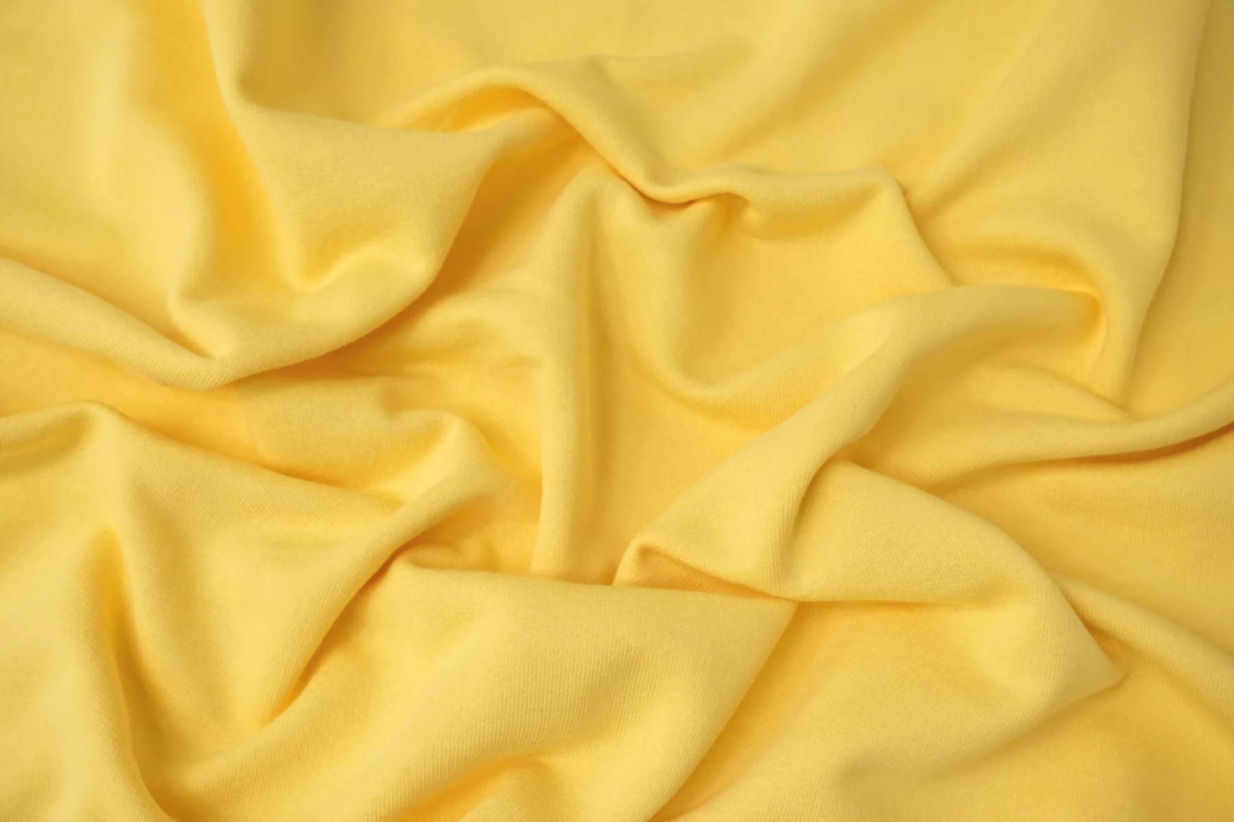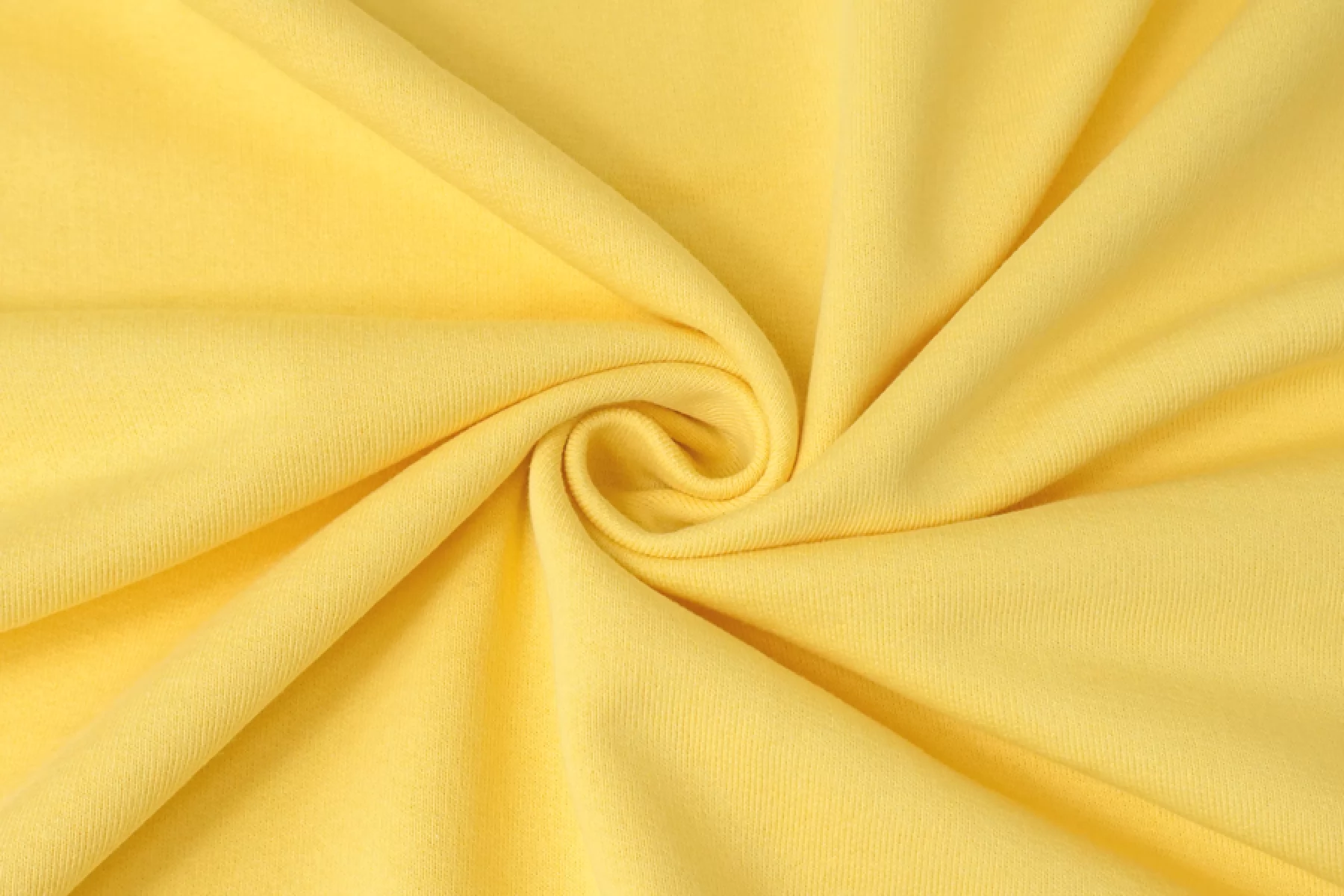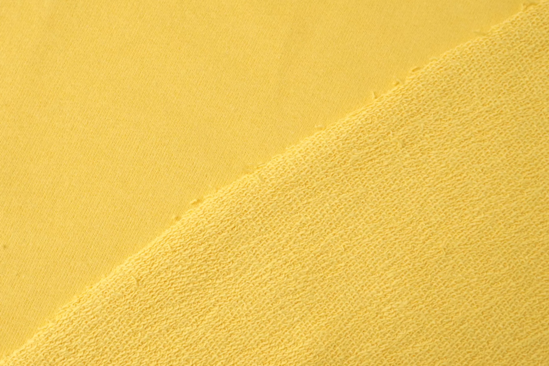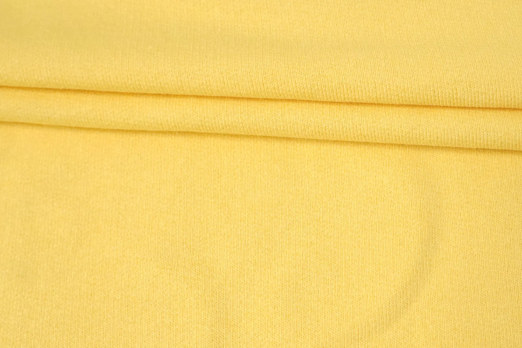 Хлопковый футер 3-нитка от бренда FENDI желтого оттенка, изнаночный слой в петельку также из хлопка - состав полностью натуральный, что позволяет телу свободно дышать и делает его комфортным в носке. Материал тактильно приятный, мягкий и гладкий, совсем слегка суховатый. Немного держит форму. Неплохо тянется по ширине. Отличный вариант для пошива худи, свитшотов, толстовок, спортивных костюмов, платьев и другой одежды в спортивном стиле.