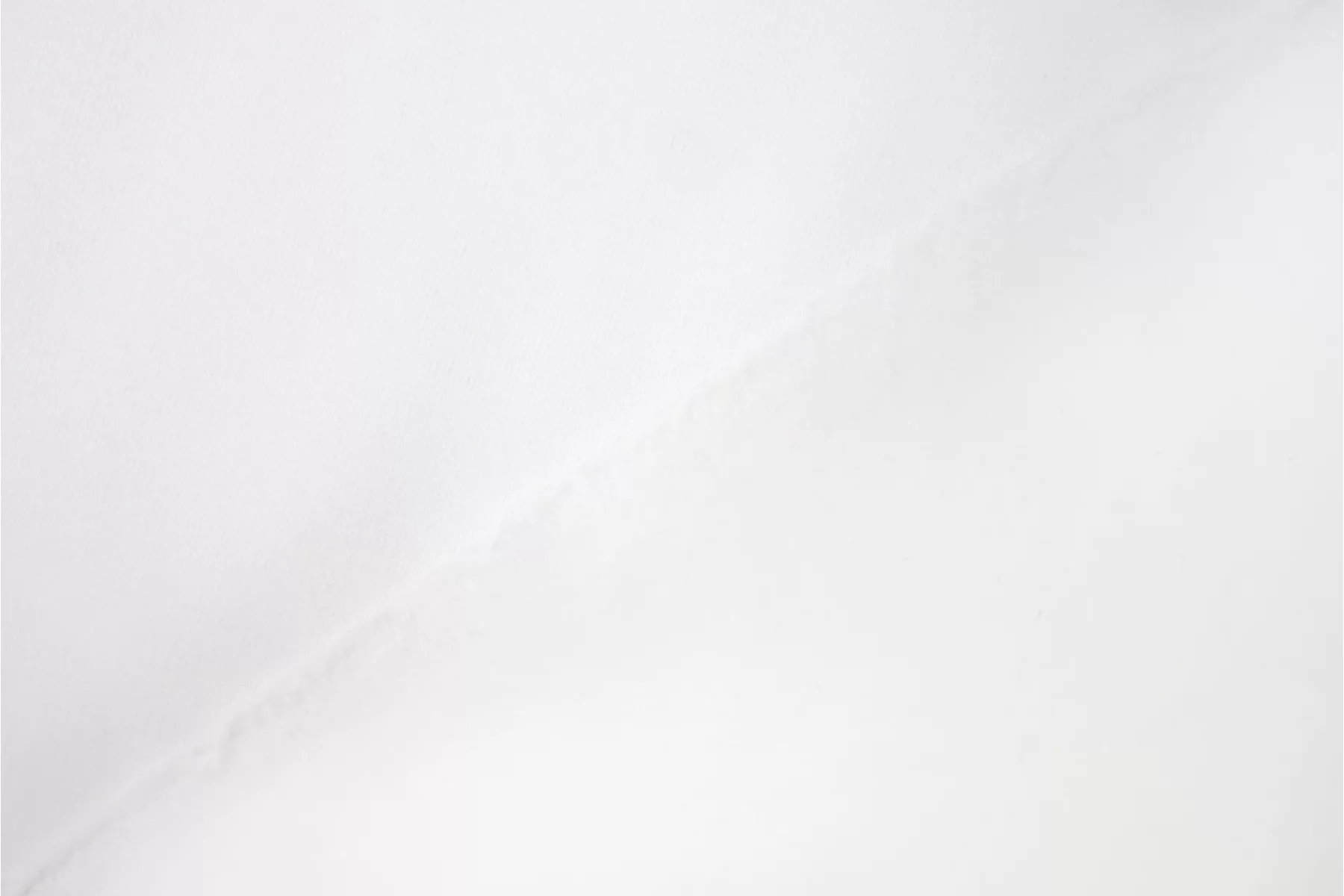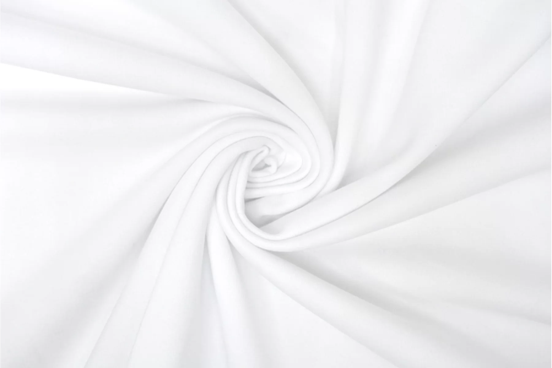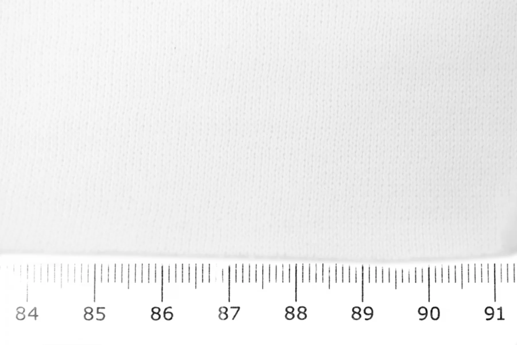 Отличного качества хлопковый футер с начесом от OFF-WHITE белого цвета. Материал очень приятный и мягкий наощупь. Плотный, слегка заметен силуэт черного на просвет. Не тянется. Гладкий, обладает легким лоском. Сминается, но восстанавливается практически полностью. Отличный вариант для спортивной одежды, свитшотов, худи или спортивных брюк.