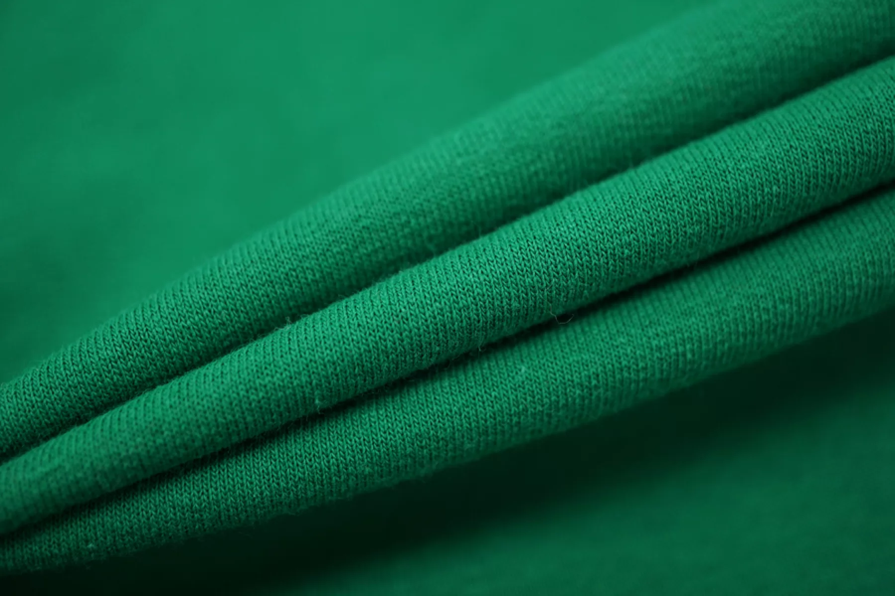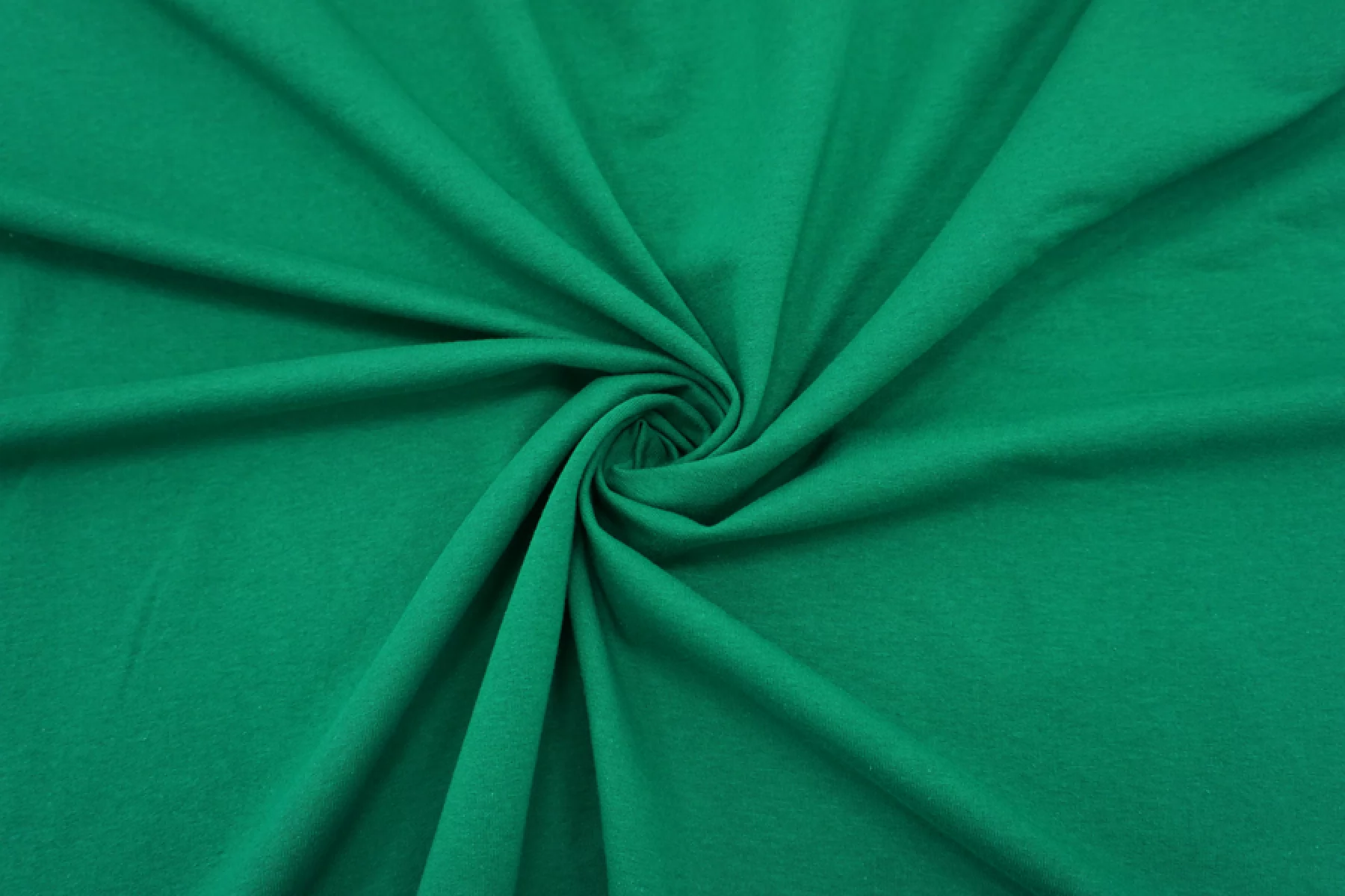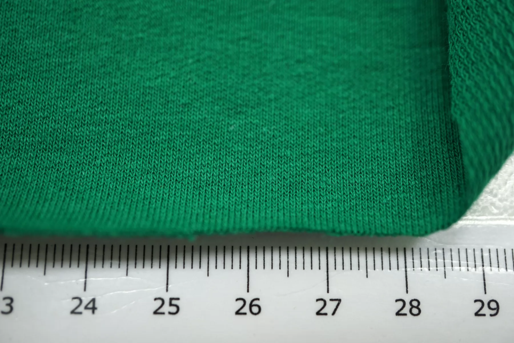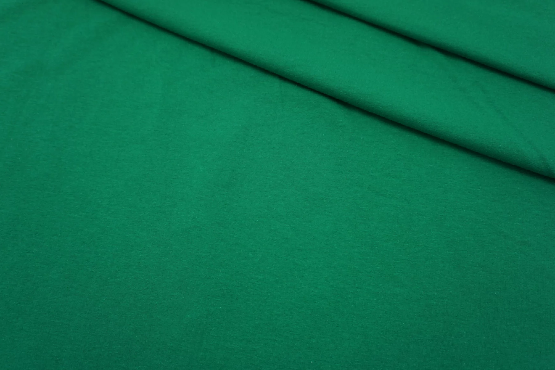 Трикотаж-футер из хлопка в ярком травянисто-зеленом оттенке, 2-х нитка. Немного просвечивает (насквозь, в один слой) при растяжении, в изделии подкладка не требуется. Пластичный, эластичный. Подойдет для пошива футболки, легкой кофты, домашней одежды (шорт, футболок, легких штанов), платья-майки или платья-футболки.