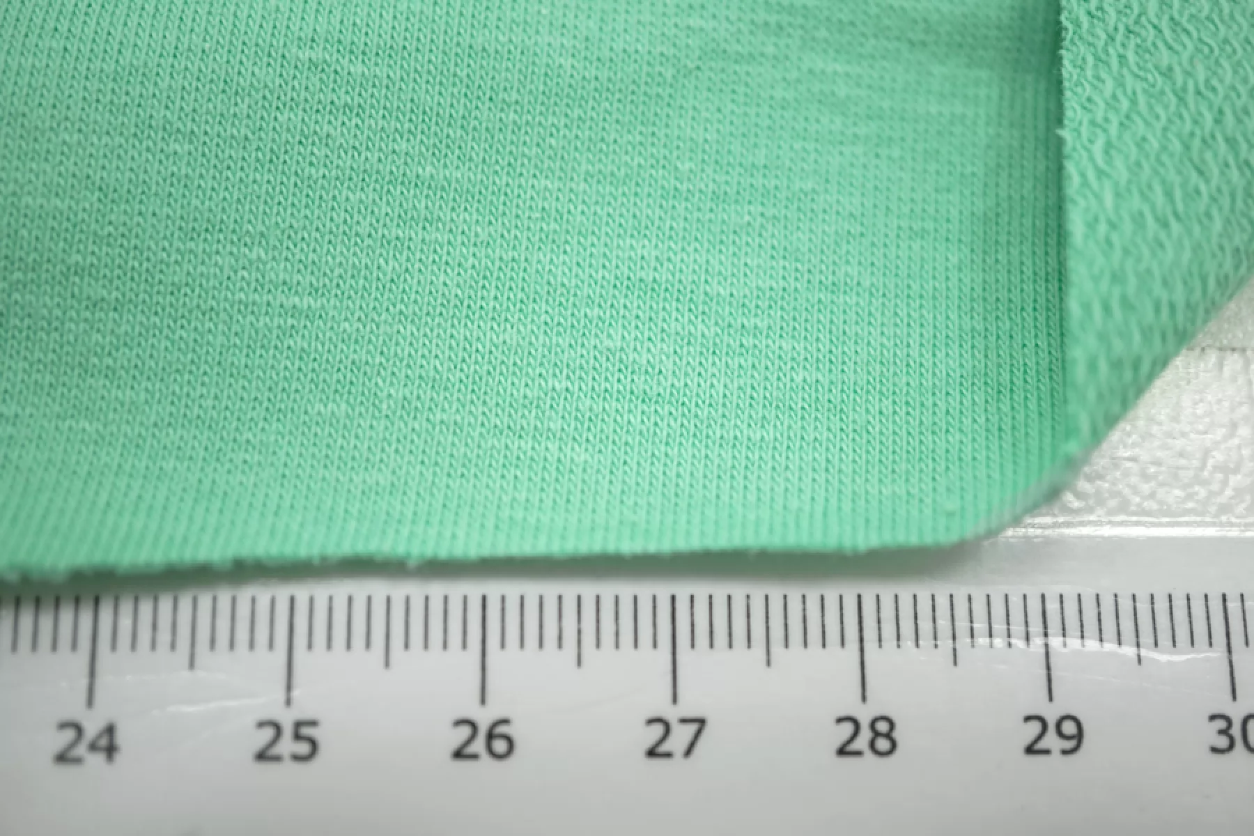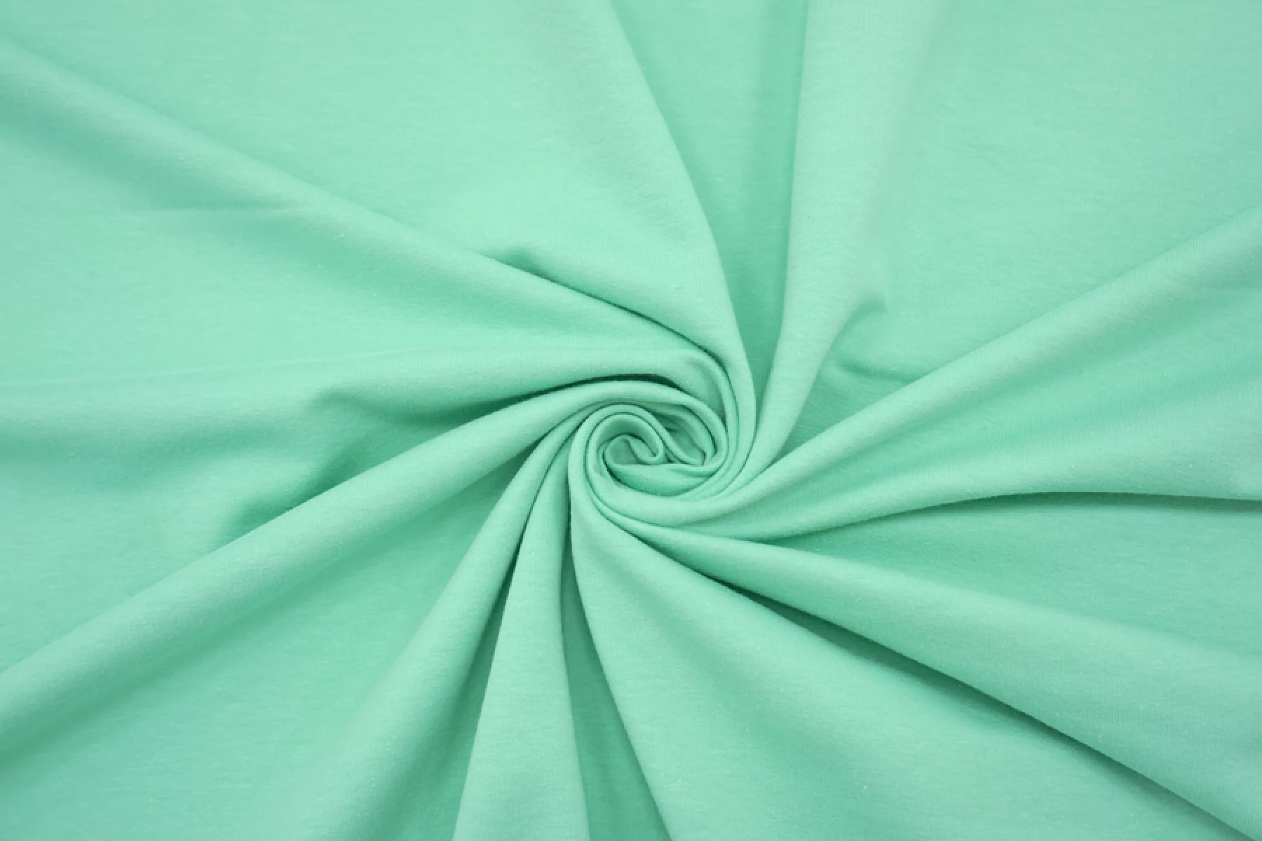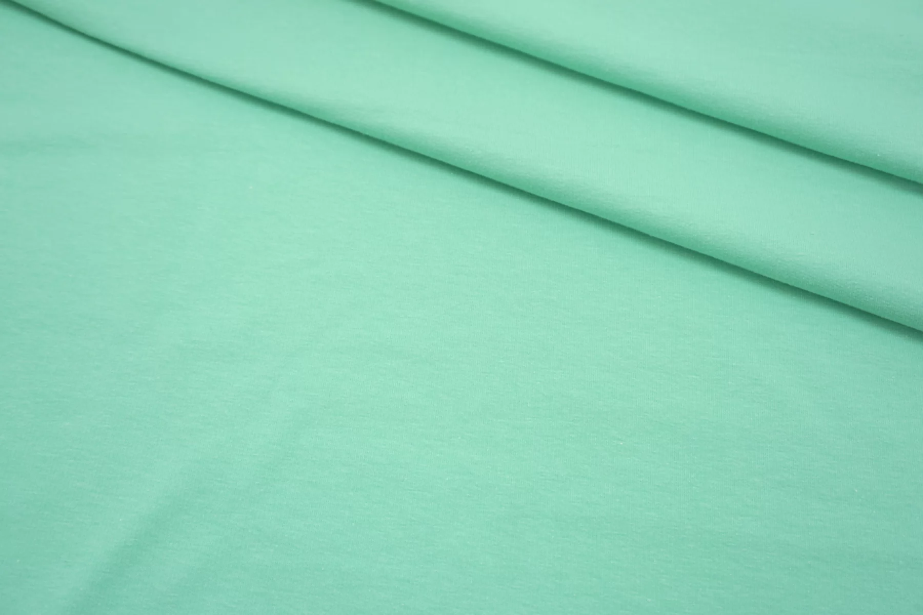 Трикотаж-футер из хлопка в насыщенном мятном оттенке, 2-х нитка. Немного просвечивает (насквозь, в один слой) при растяжении, в изделии подкладка не требуется. Пластичный, эластичный. Подойдет для пошива футболки, легкой кофты, домашней одежды (шорт, футболок, легких штанов), платья-майки или платья-футболки.