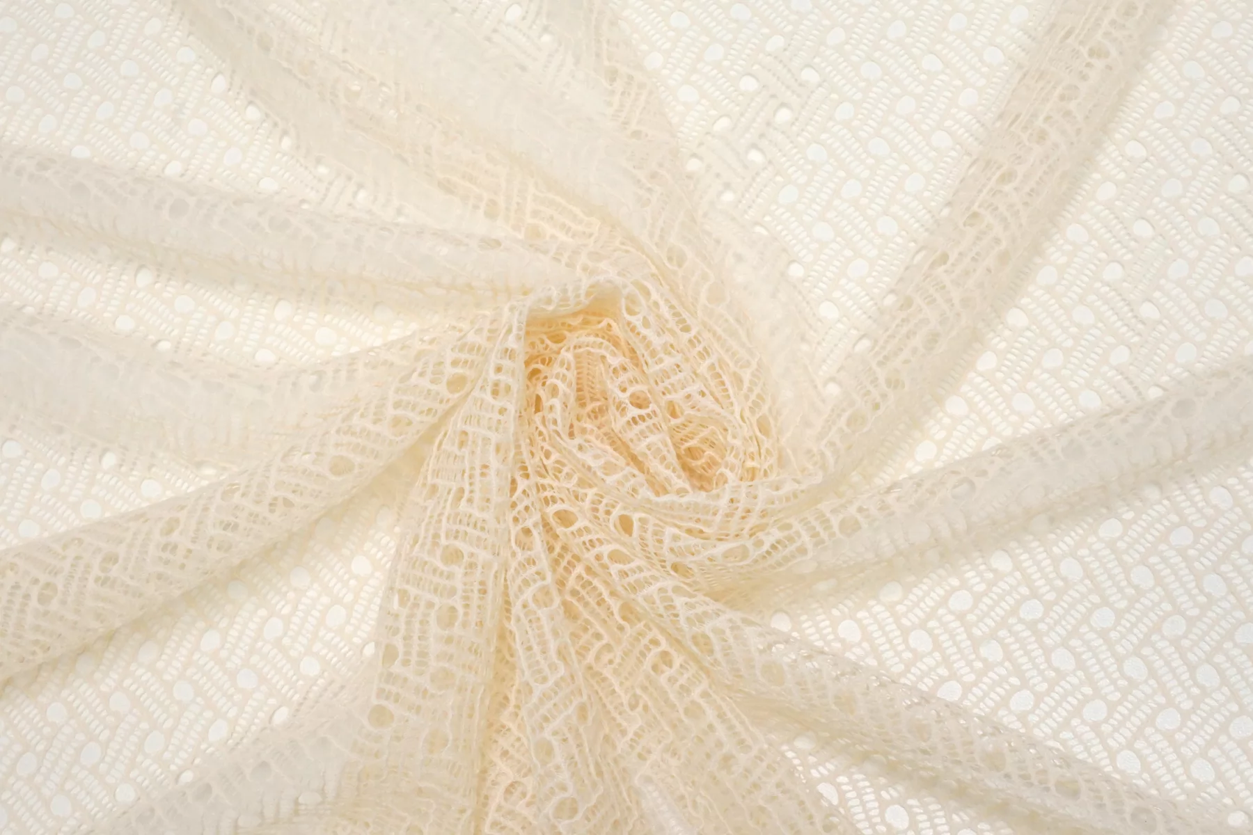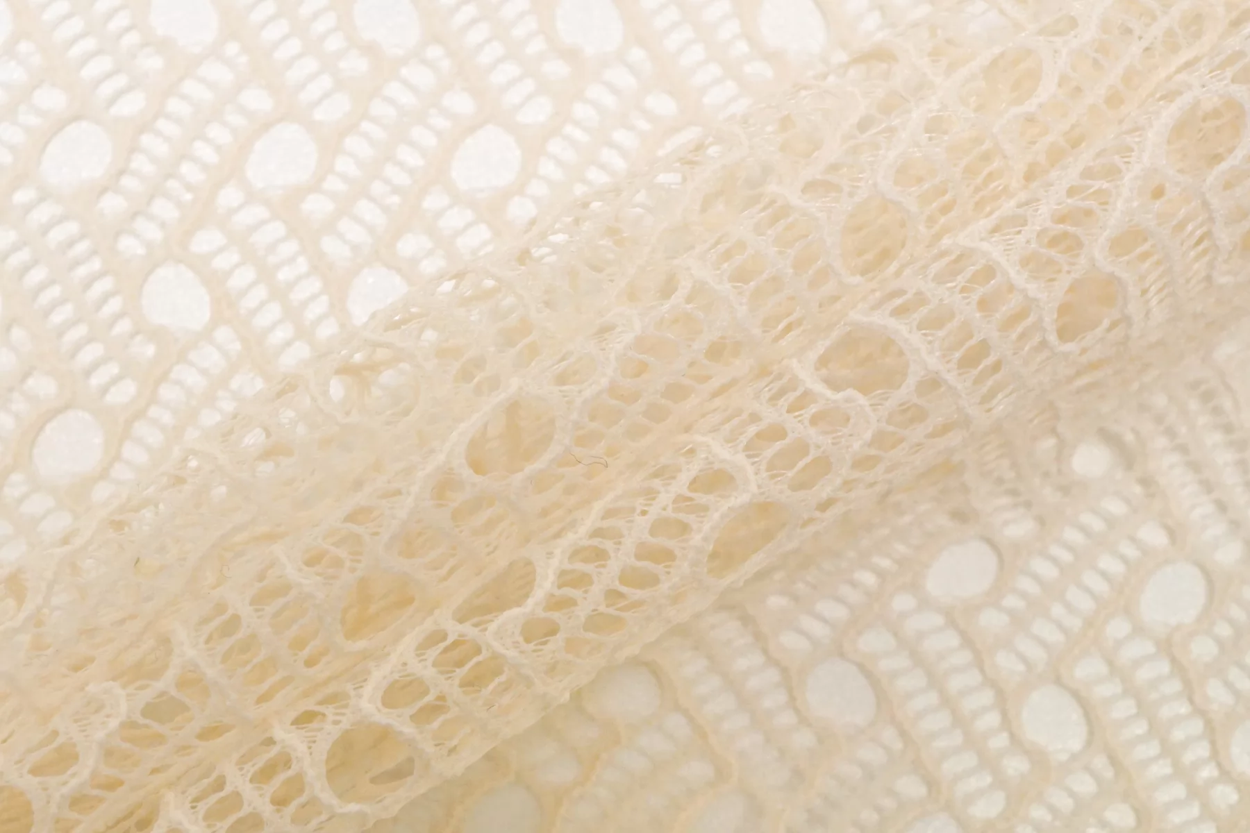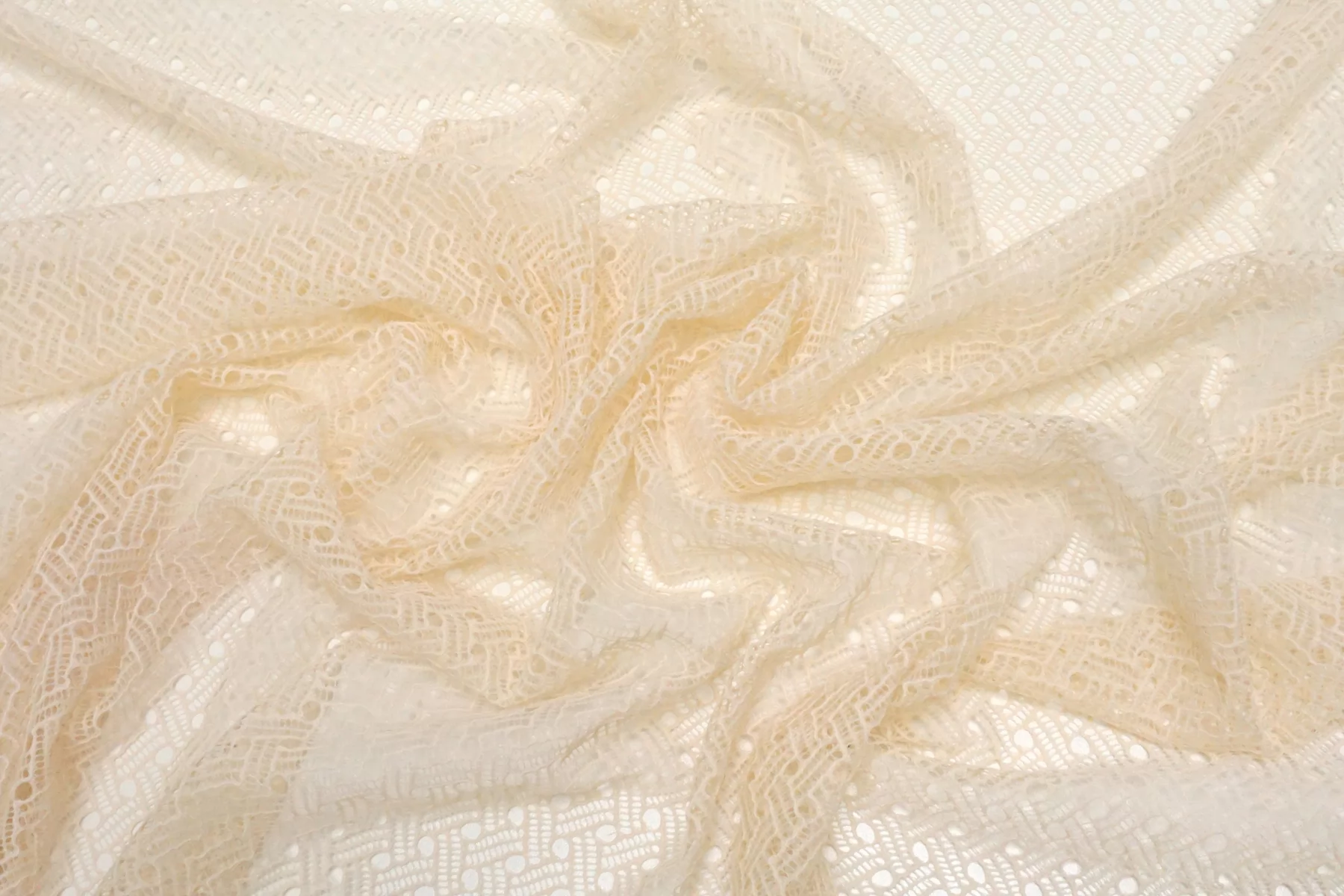 Прекрасный итальянское кружево в молочном цвете с бежевым подтоном. Мягкое, гладкое, прозрачное. Эластичное. Не мнется, форму не держит, хорошо драпируется. Отлично подойдет для пошива самостоятельного изделия (на подкладе), или отделки отдельных элементов одежды и аксессуаров.