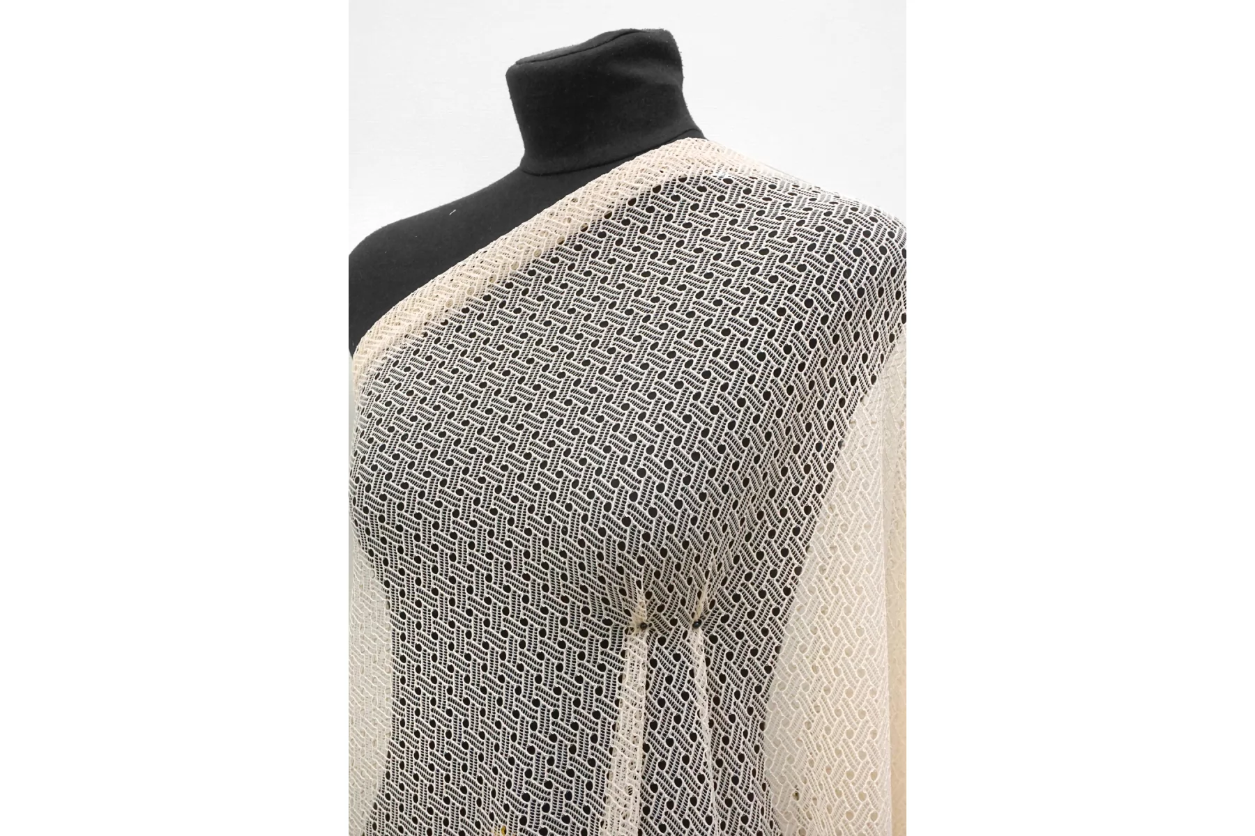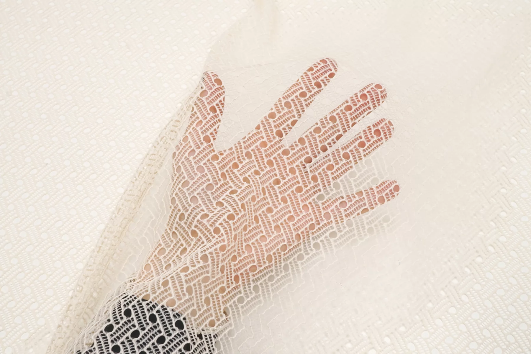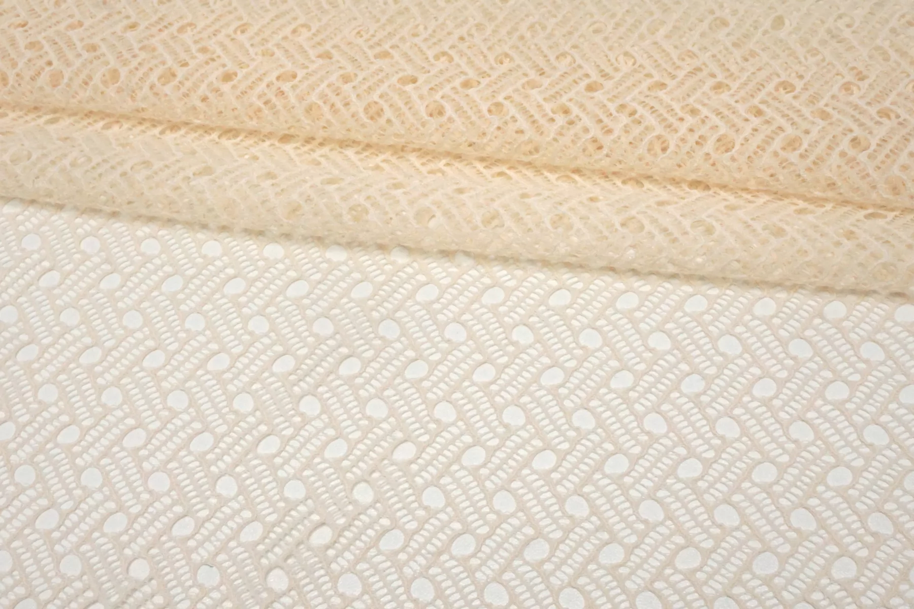 Прекрасный итальянское кружево в молочном цвете с бежевым подтоном. Мягкое, гладкое, прозрачное. Эластичное. Не мнется, форму не держит, хорошо драпируется. Отлично подойдет для пошива самостоятельного изделия (на подкладе), или отделки отдельных элементов одежды и аксессуаров.