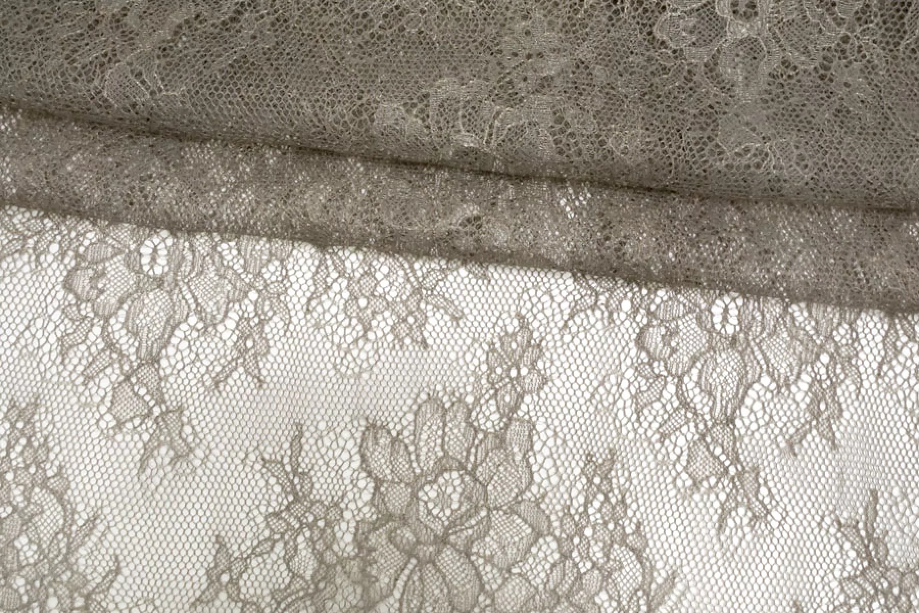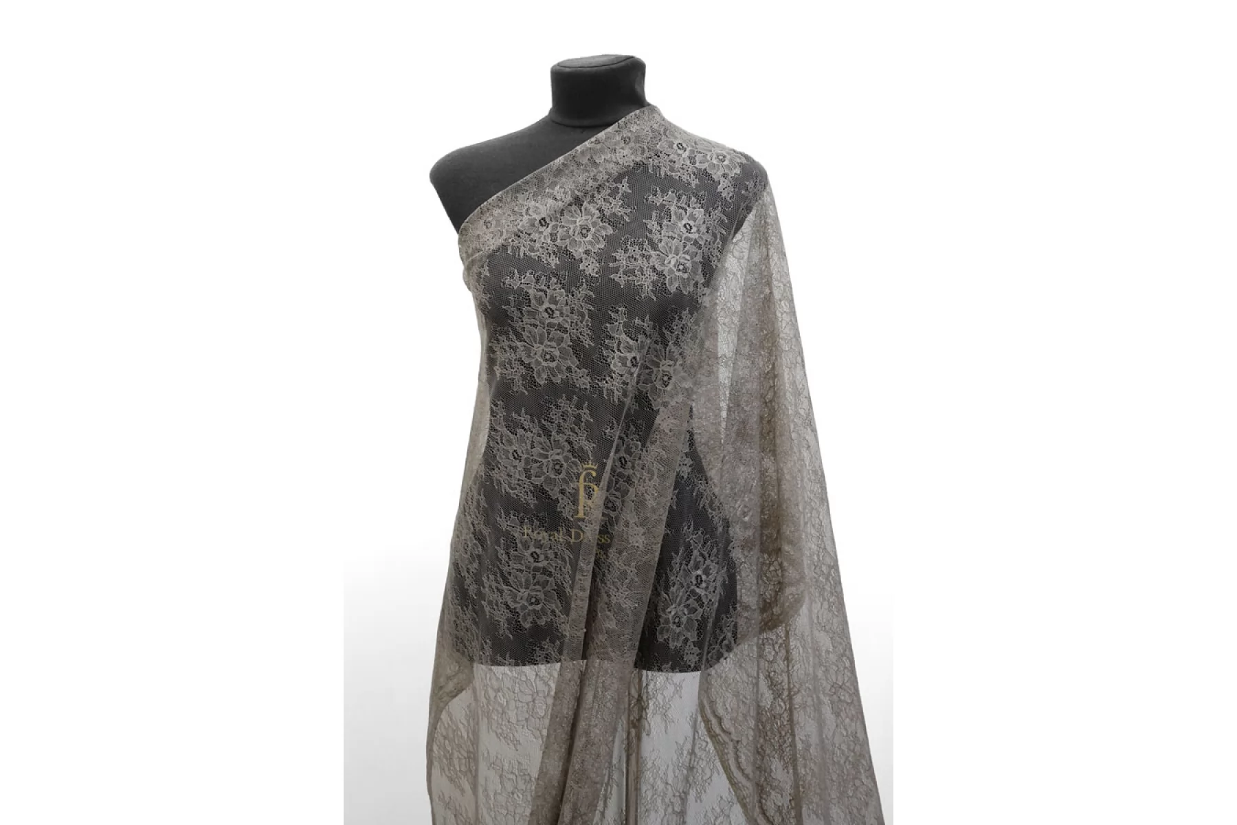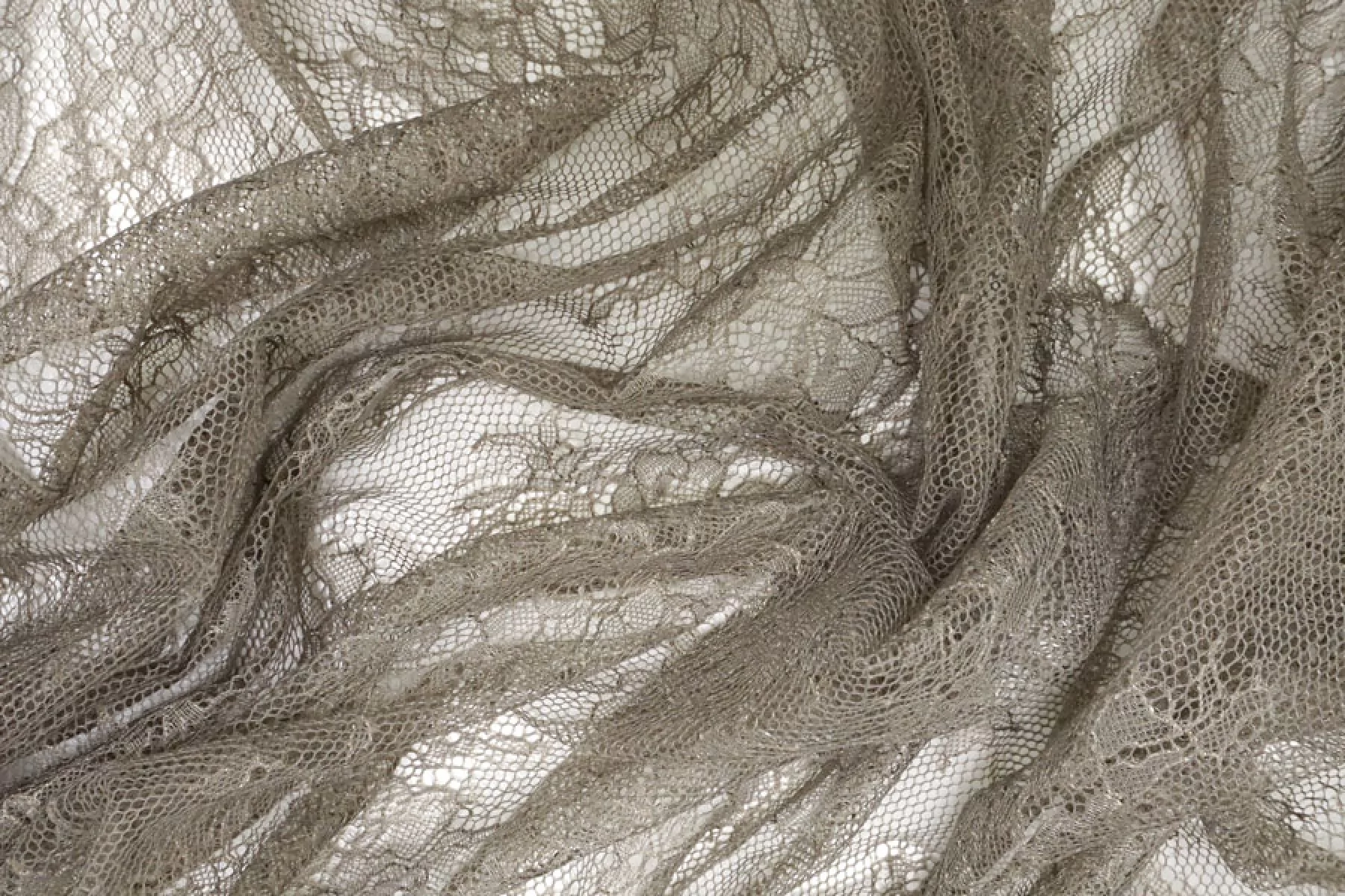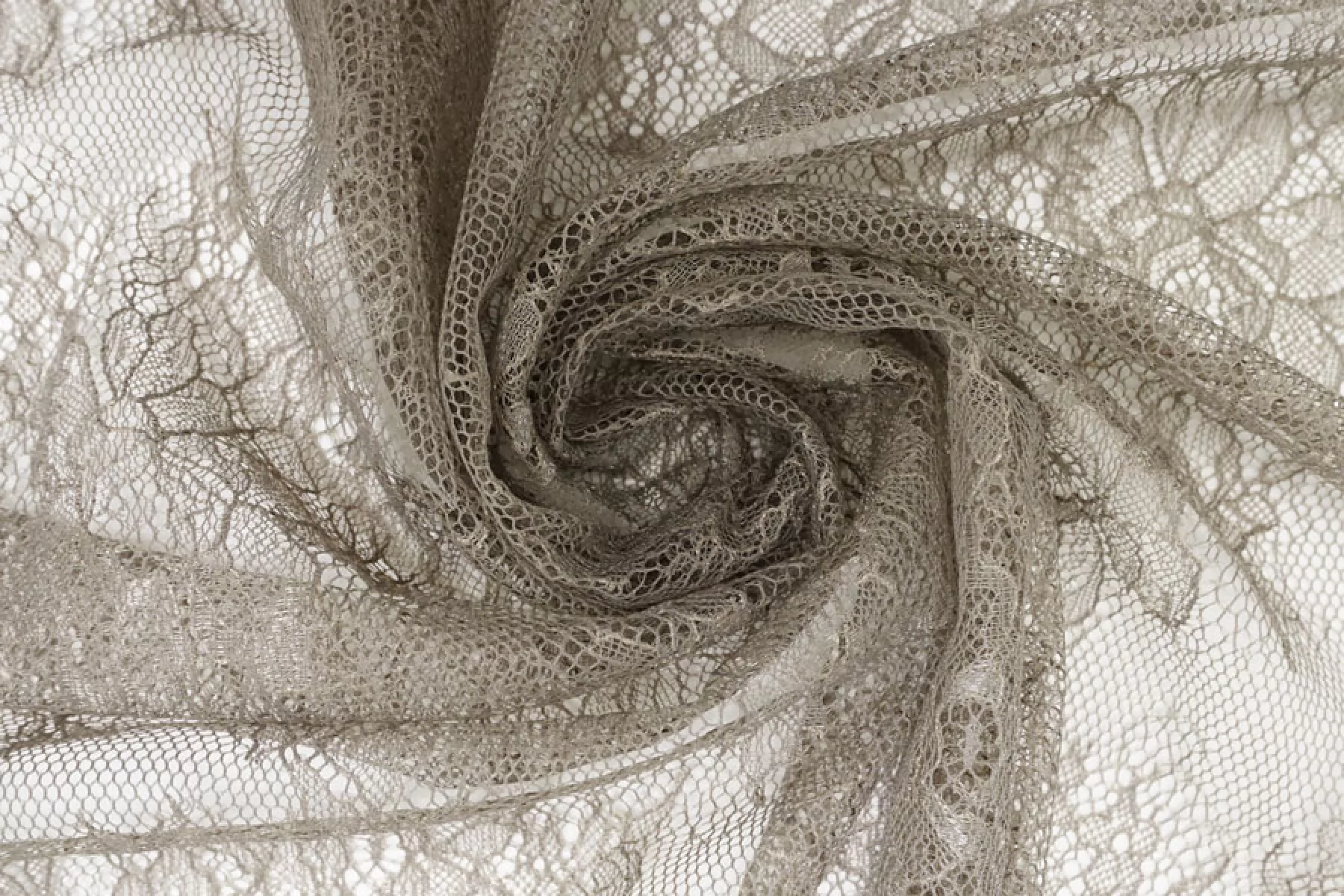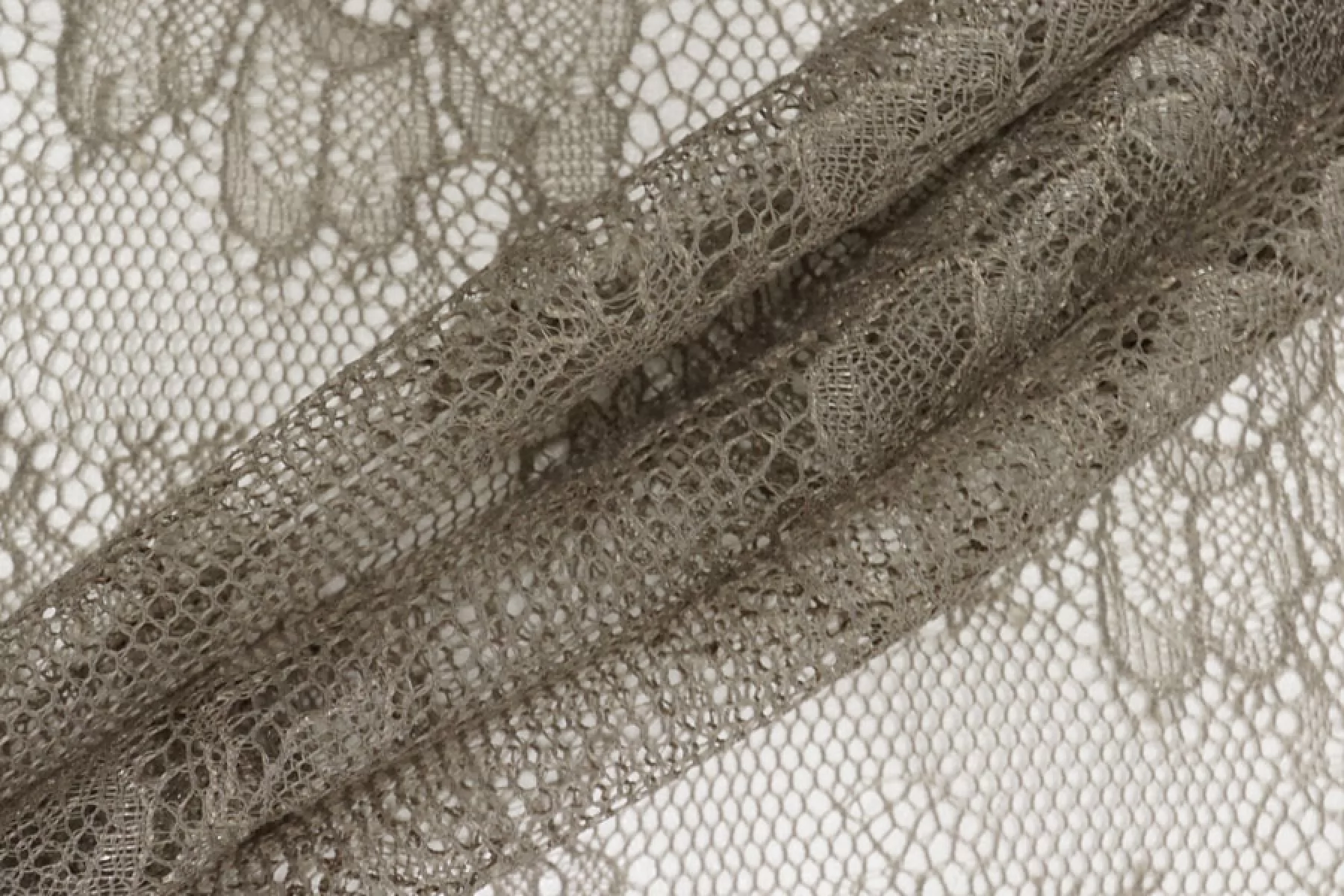 Прекрасный итальянский гипюр в сложном серо-бежевом цвете. С блеском. Мягкий, гладкий, прозрачный. Не мнется, форму не держит, хорошо драпируется. Плетение немного тянется. Отлично подойдет для пошива самостоятельного изделия (на подкладе), или отделки отдельных элементов одежды и аксессуаров.