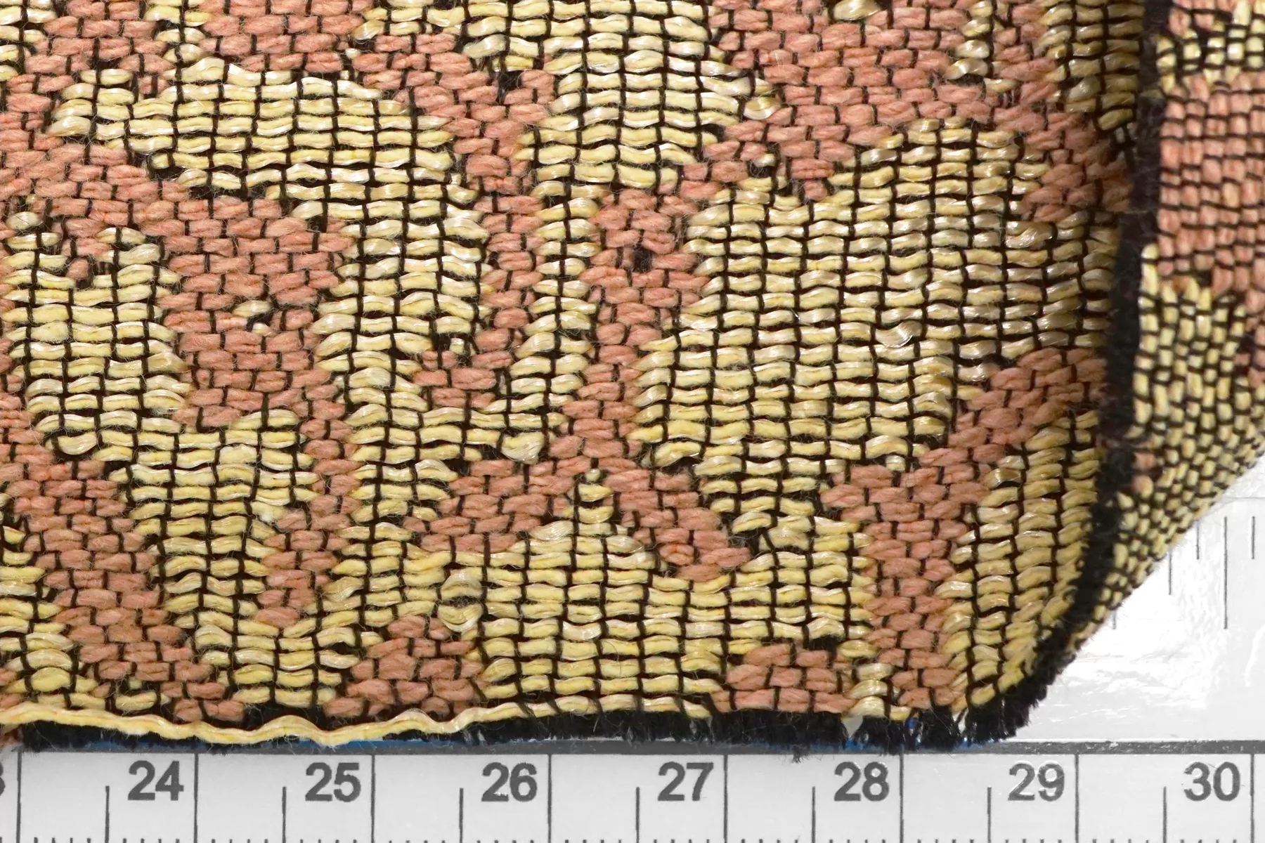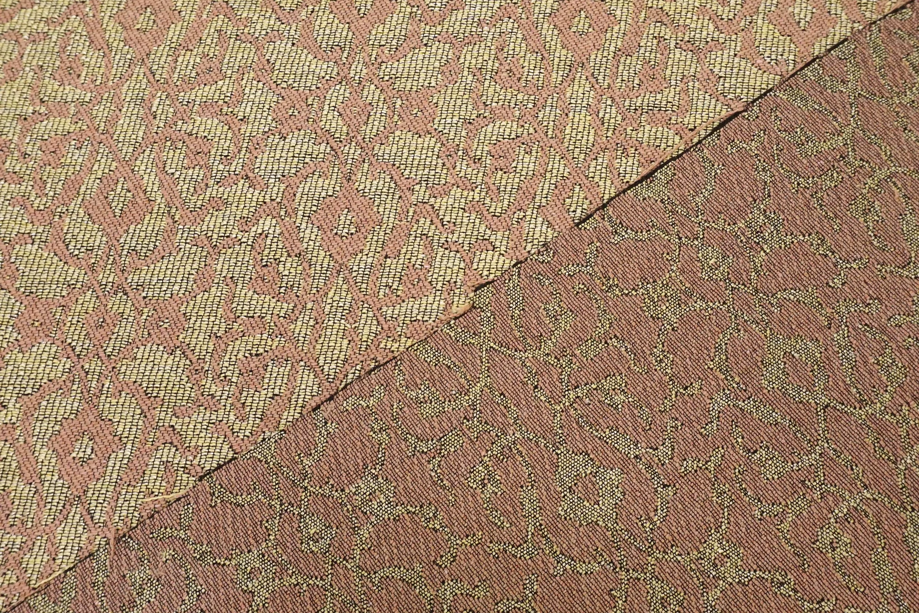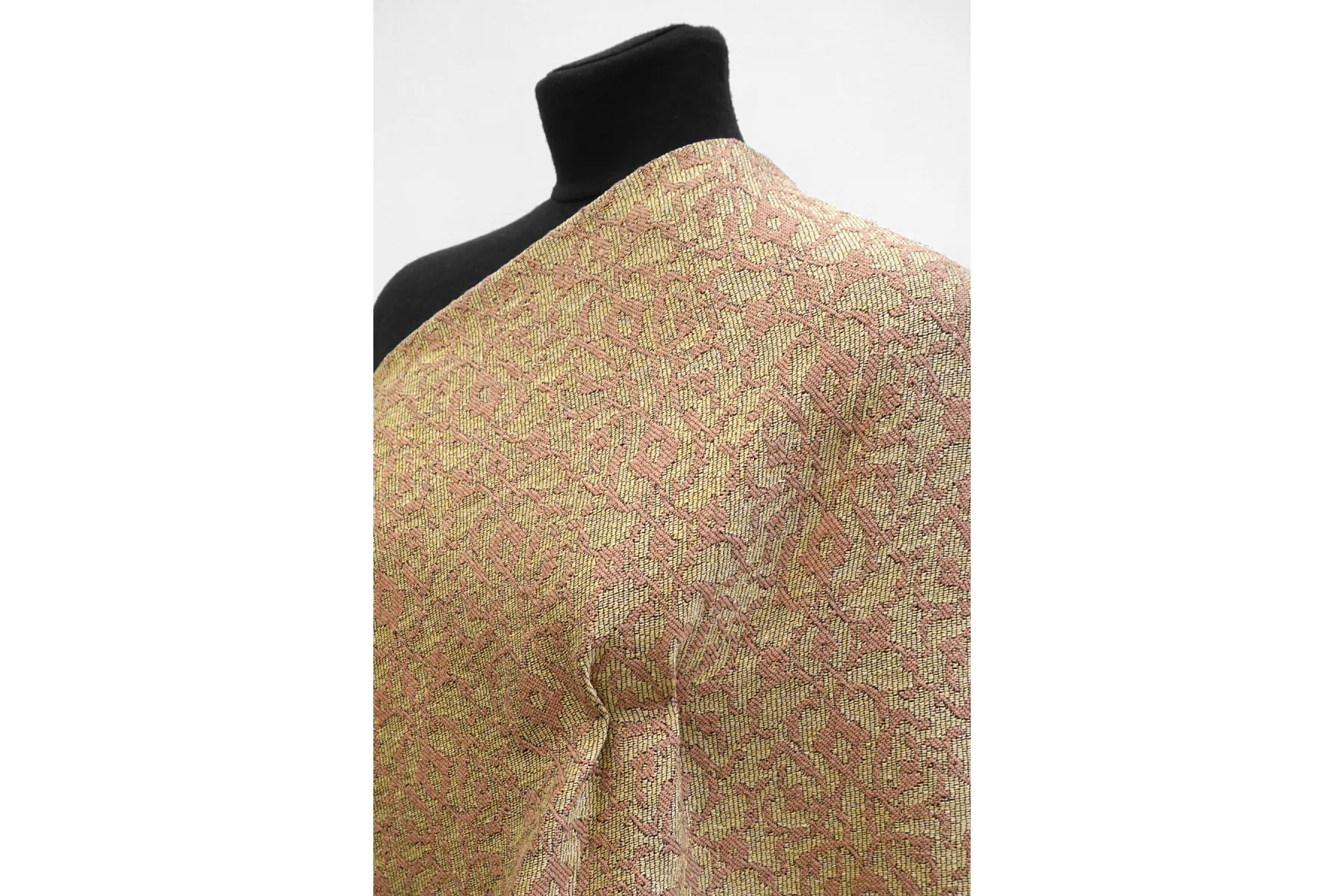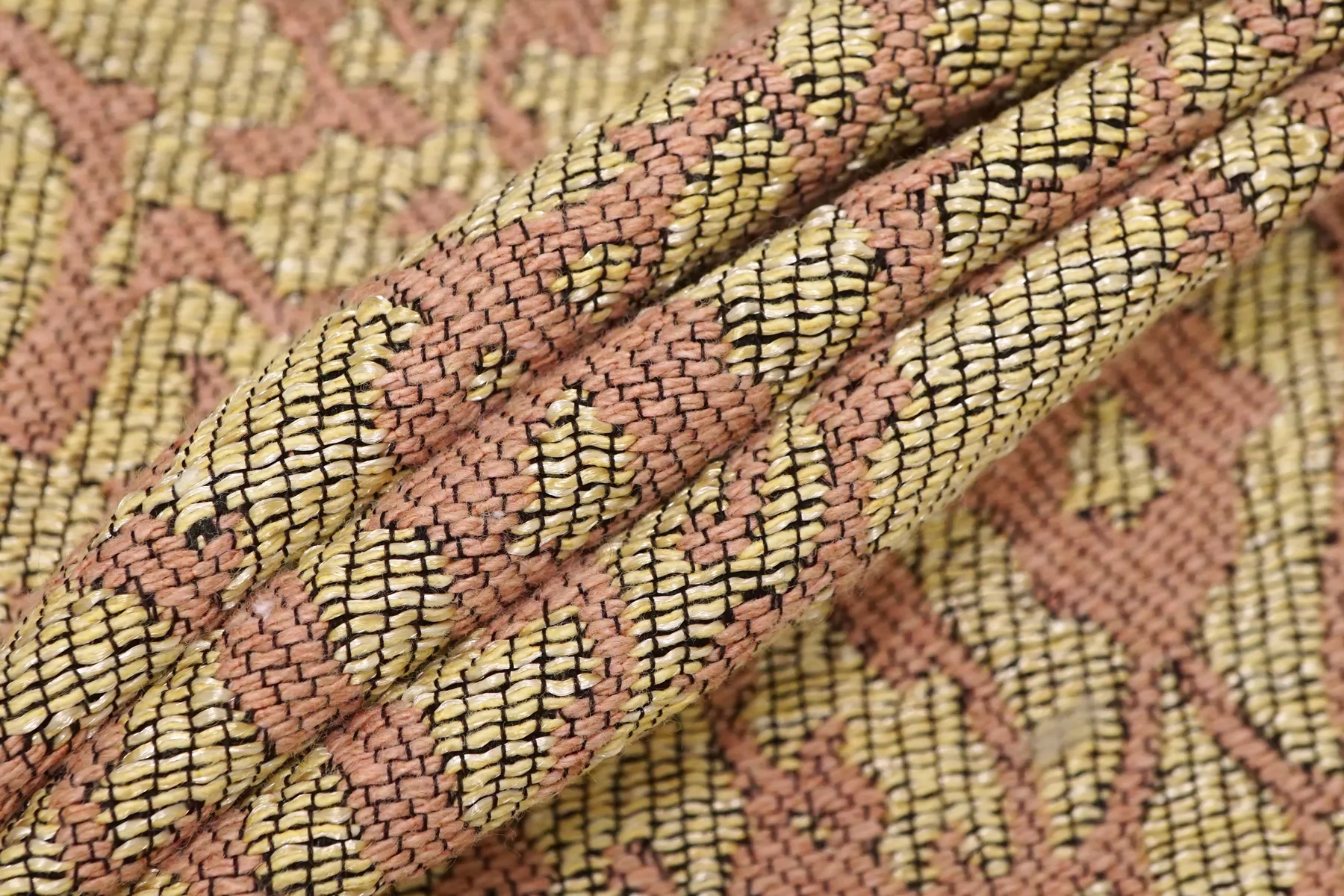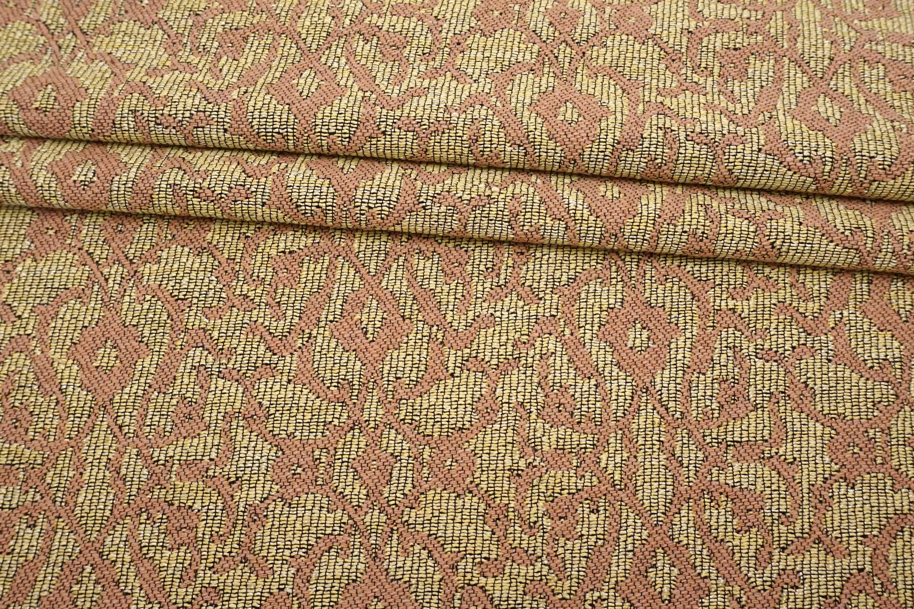 Мягкий хлопковый гобелен песочного и бледно-розового оттенка с узором в виде орнамента. Тактильно очень приятный, плотненький, мягкий, чувствуется фактура наощупь. Не тянется и хорошо держит форму. Довольно пластичный. Не просвечивает. Не сминается. Прекрасный вариант на жакеты, костюмные варианты, платья и юбки.