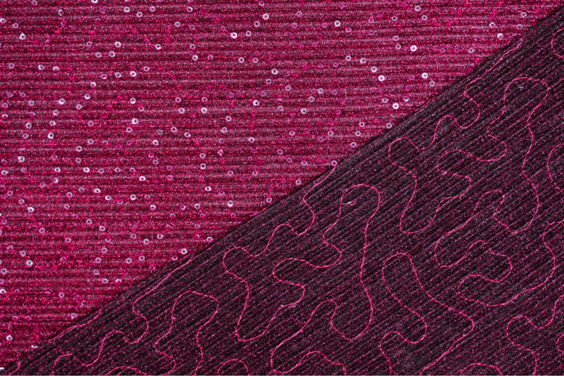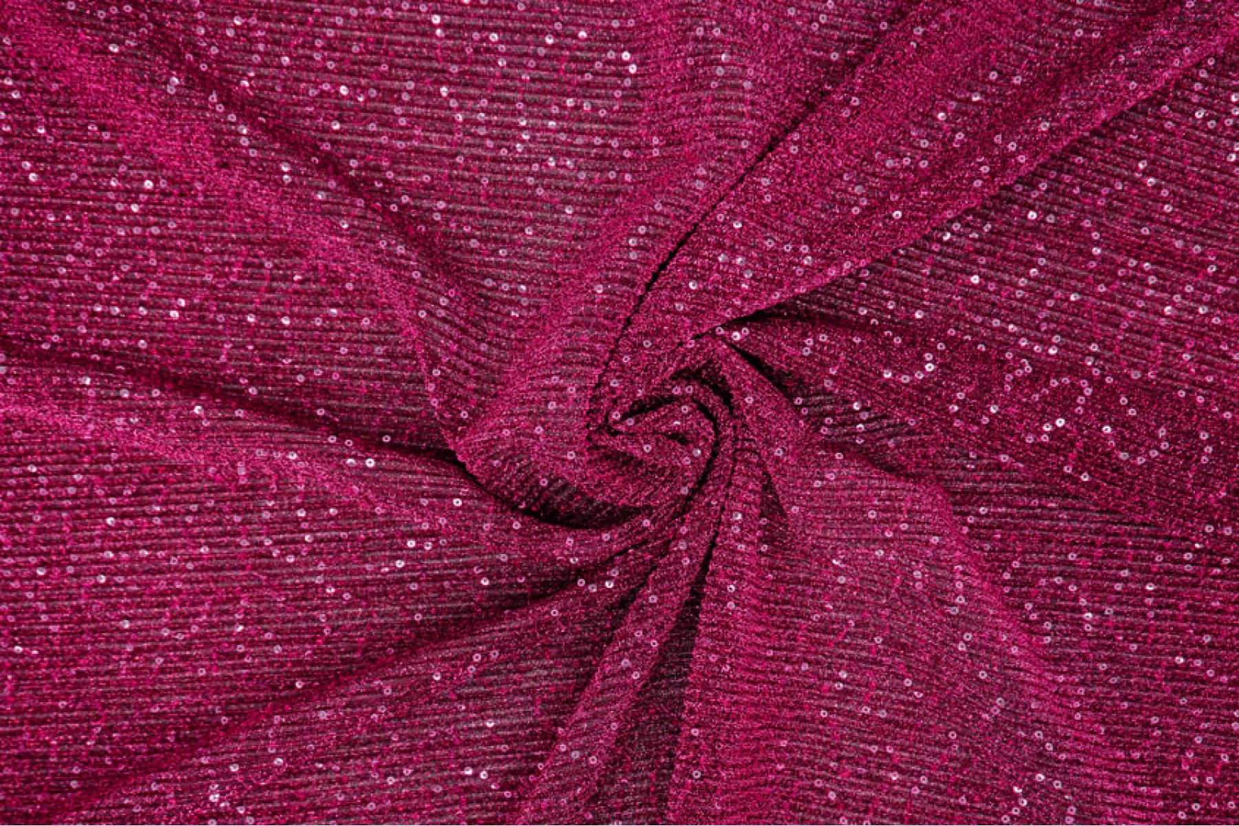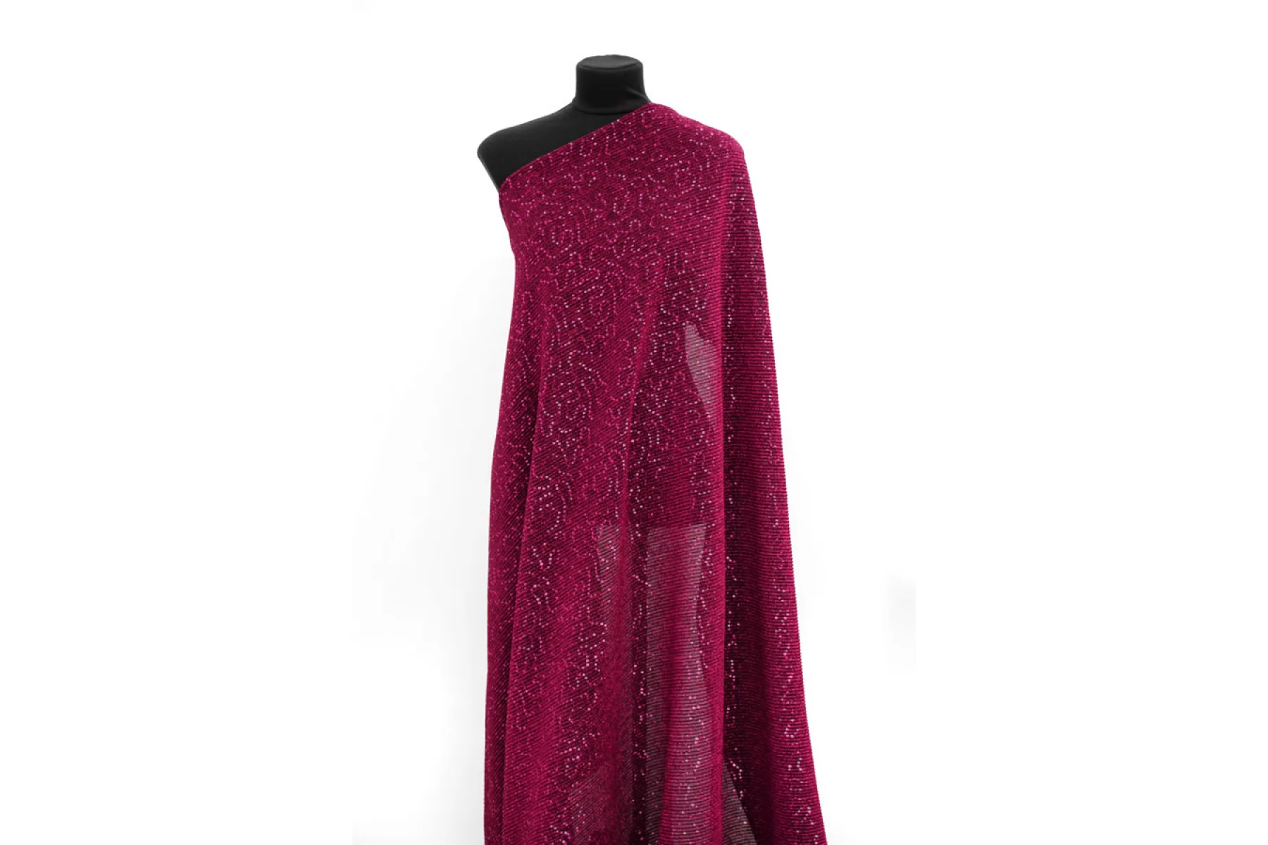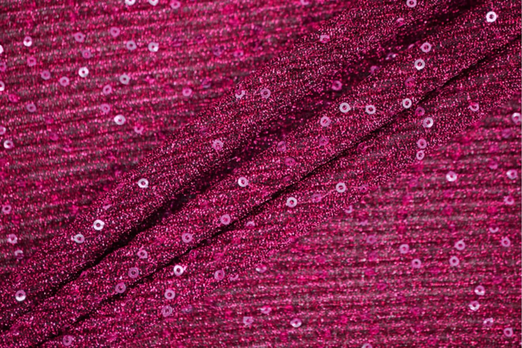 Нарядный тонкий трикотаж цвета розовой фуксии с пайетками и люрексом. Гофрированная поверхность. Красивый нарядный блеск, полупрозрачное тонкое полотно. Изнаночная сторона черного цвета, гладкая. Выглядит эффектно и очень нарядно. Пластичный, эластичный. Просвечивает силуэт. Отлично тянется. Немного держит форму. Отличный вариант на нарядные кофты, платья, отдельные элементы изделия и не только. При необходимости используйте подкладочный материал.