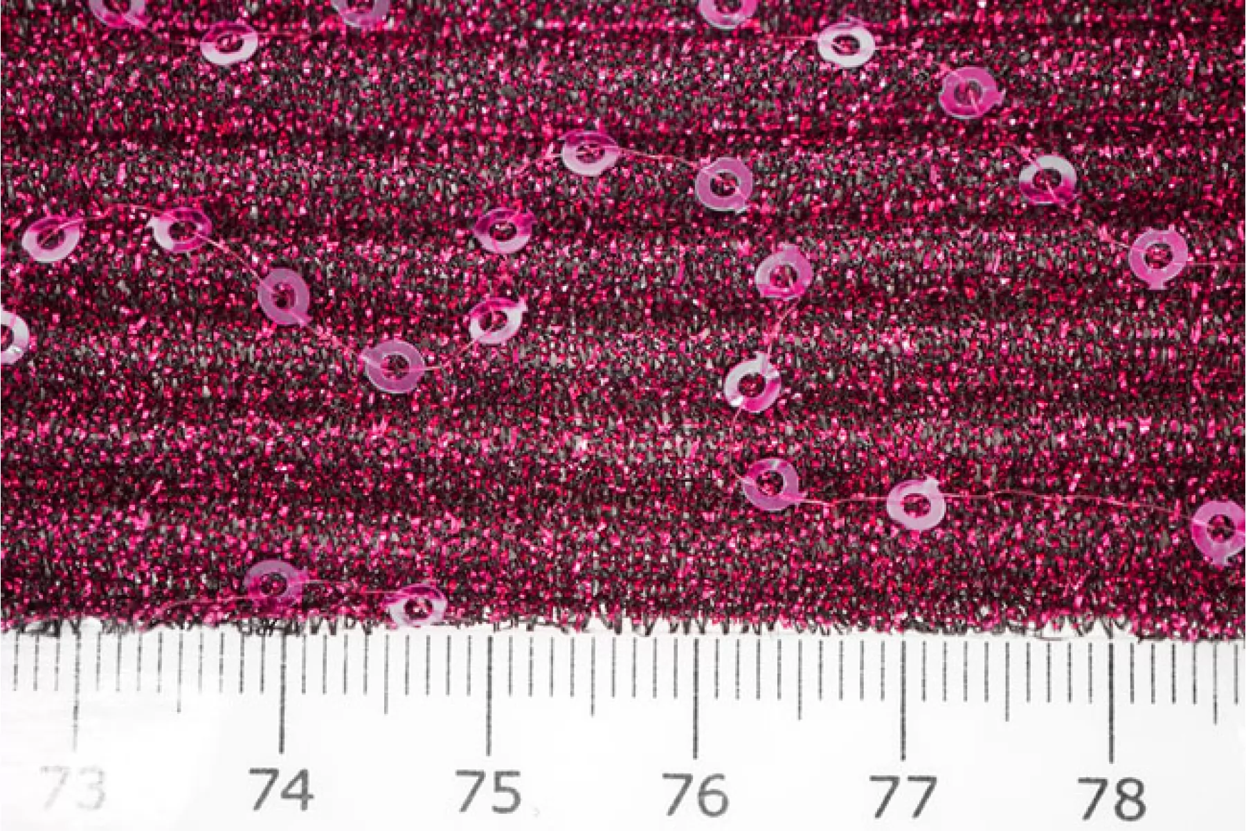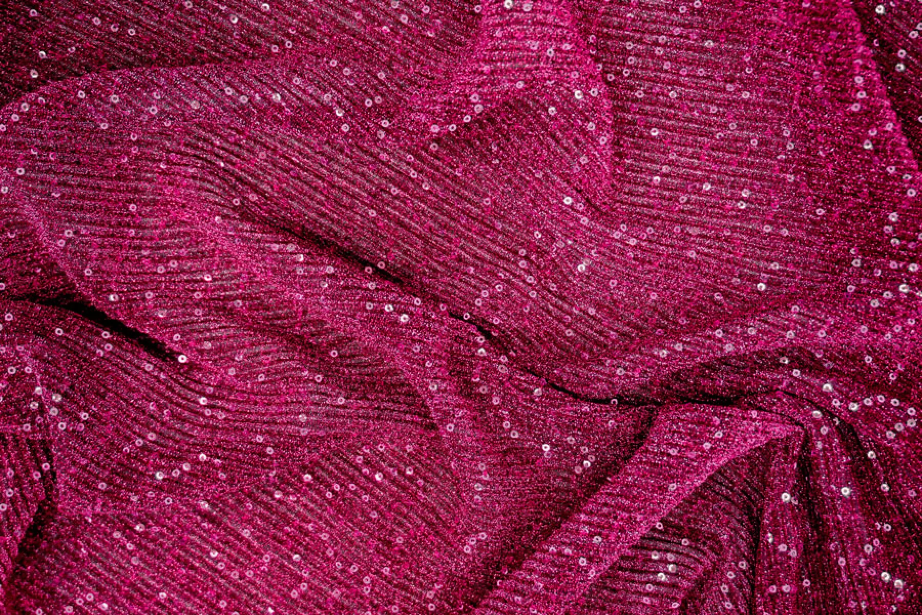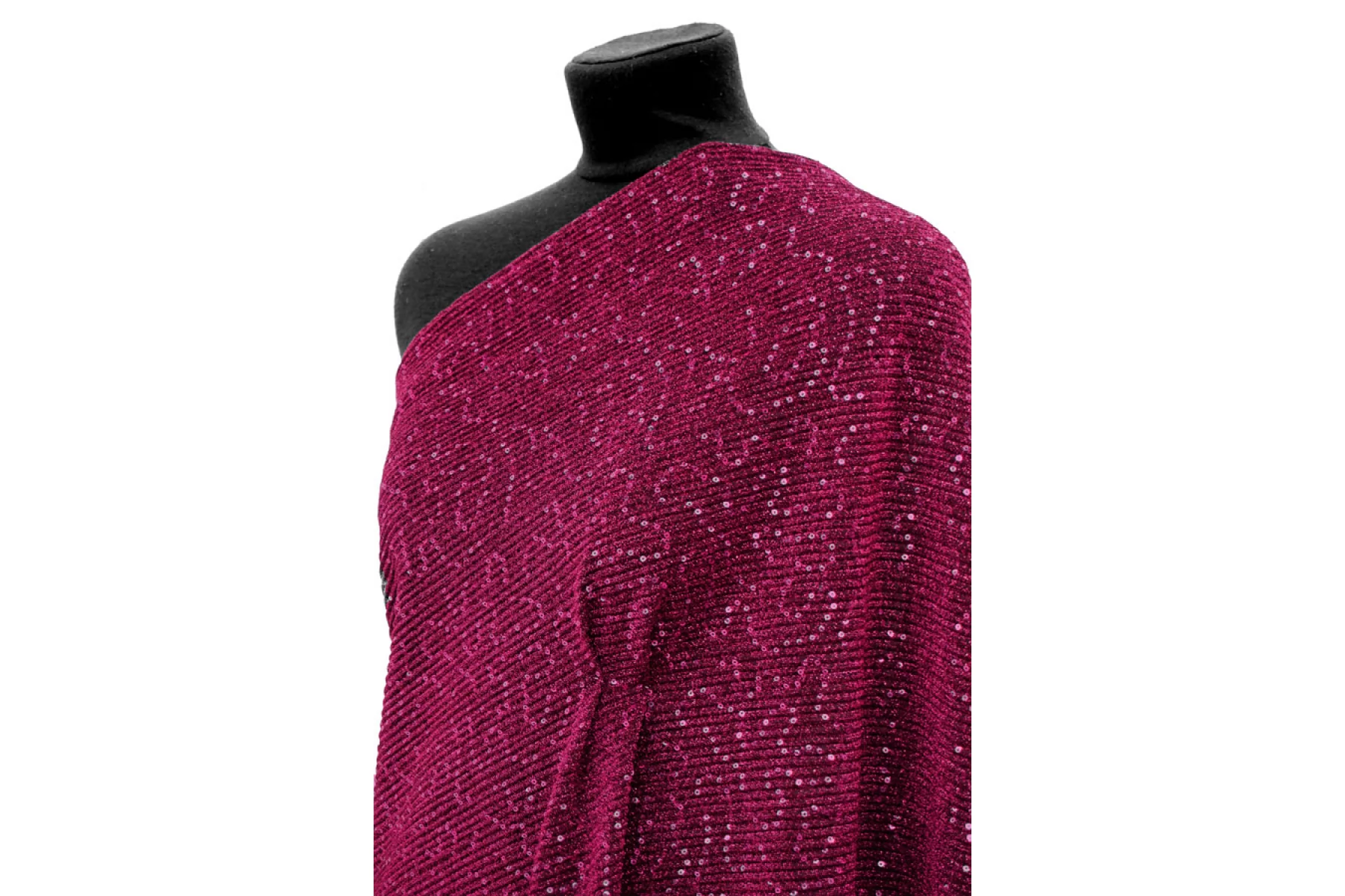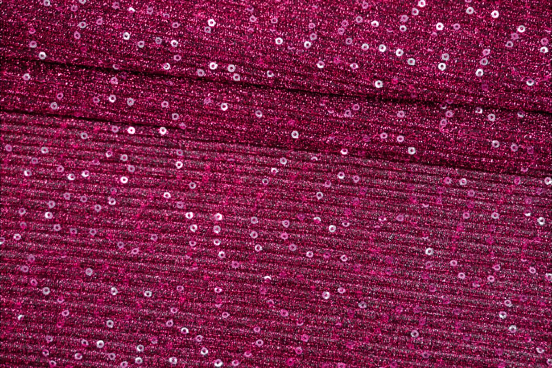 Нарядный тонкий трикотаж цвета розовой фуксии с пайетками и люрексом. Гофрированная поверхность. Красивый нарядный блеск, полупрозрачное тонкое полотно. Изнаночная сторона черного цвета, гладкая. Выглядит эффектно и очень нарядно. Пластичный, эластичный. Просвечивает силуэт. Отлично тянется. Немного держит форму. Отличный вариант на нарядные кофты, платья, отдельные элементы изделия и не только. При необходимости используйте подкладочный материал.
