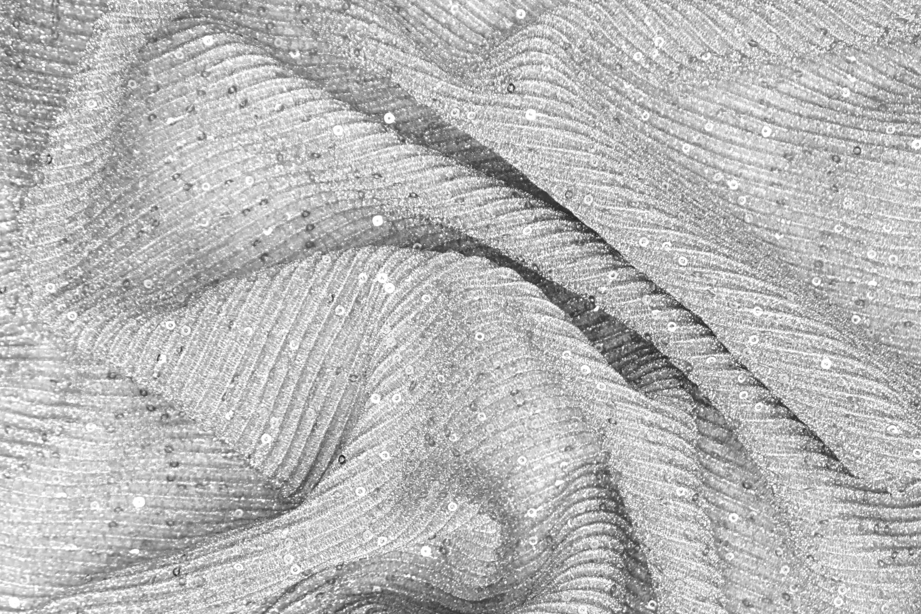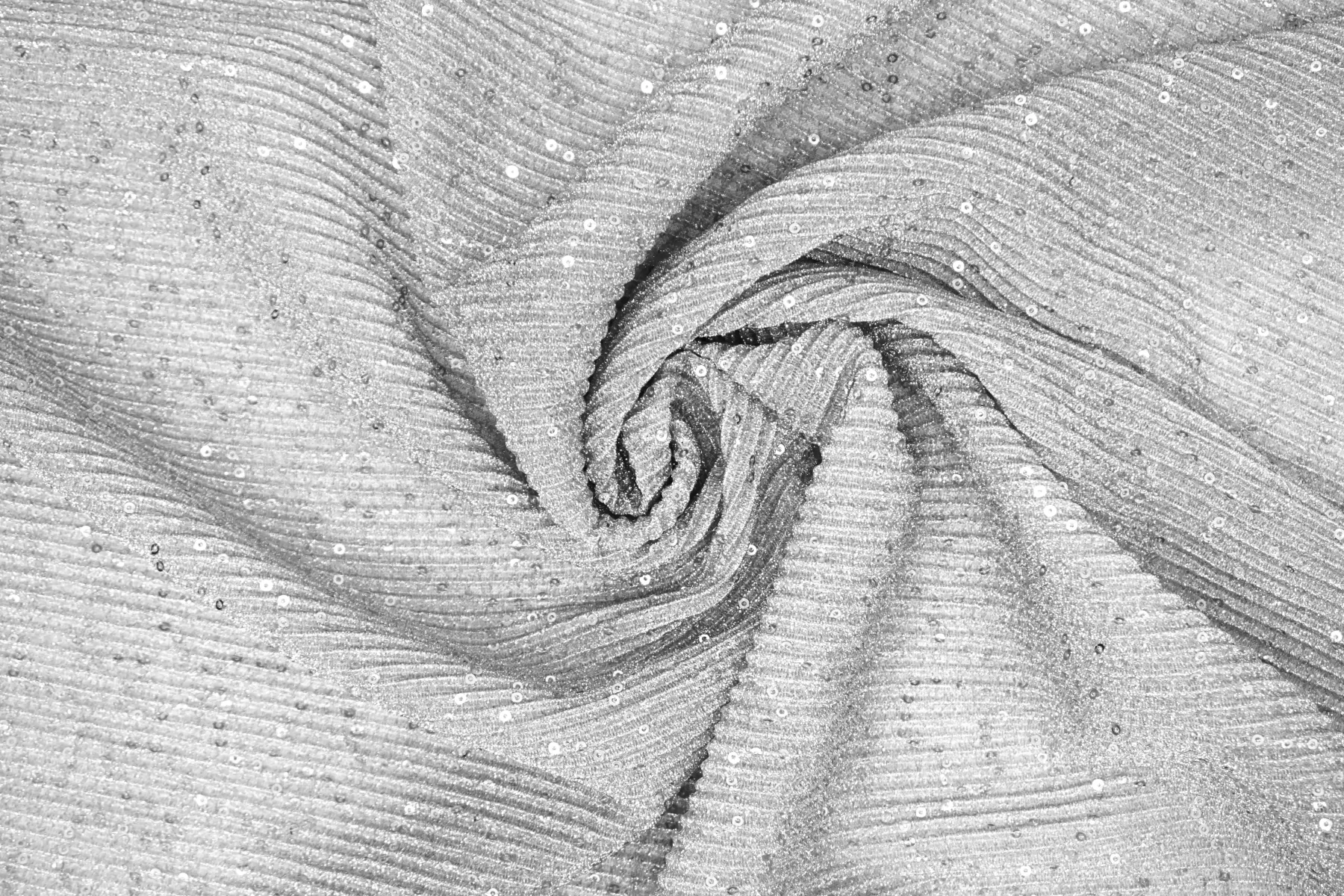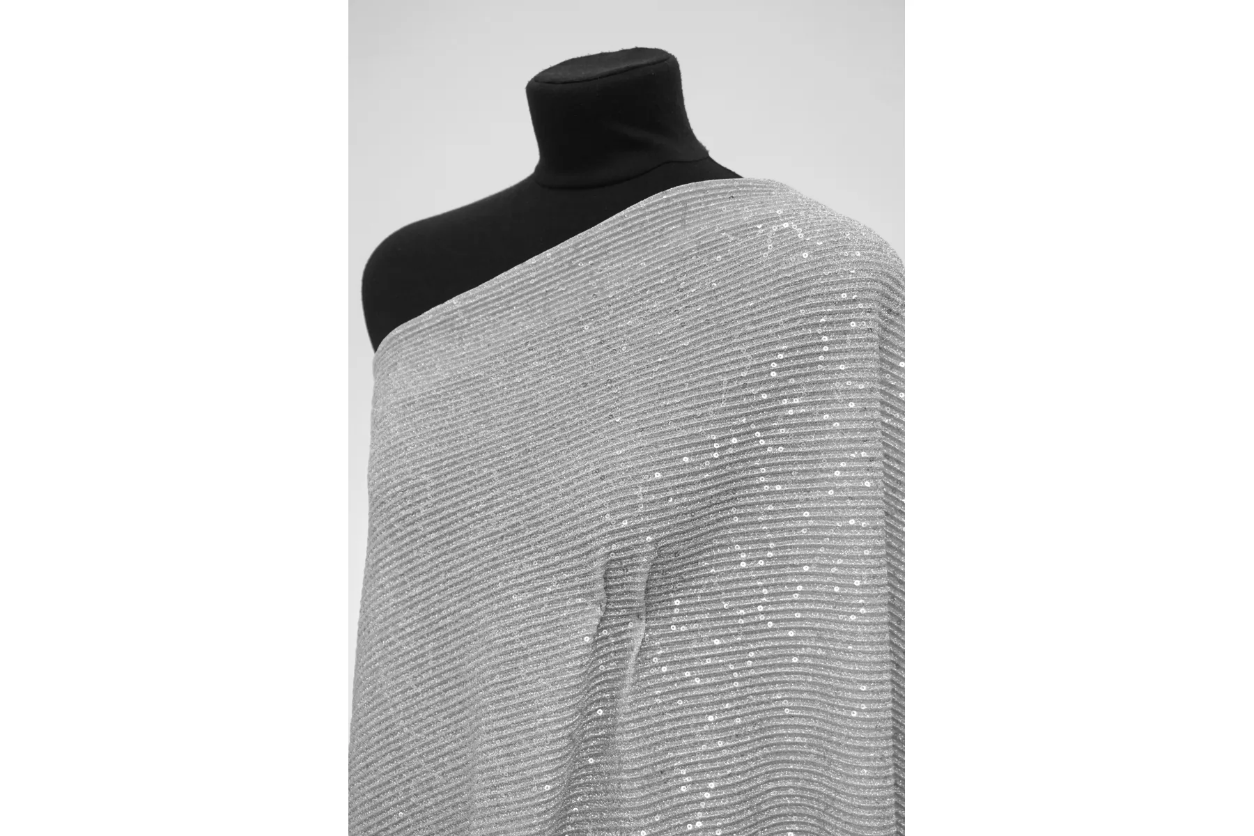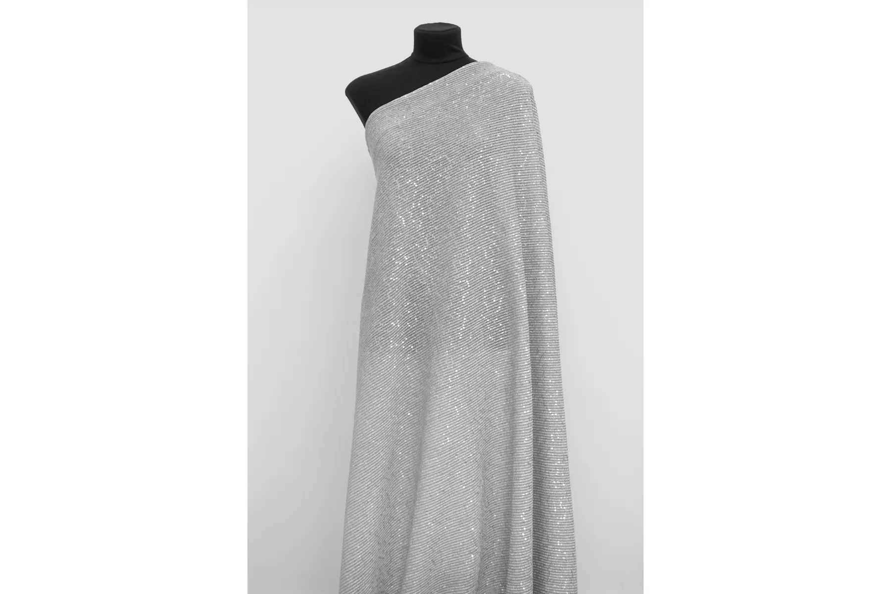 Нарядный тонкий серебряный трикотаж с пайетками и люрексом от бренда Atelier Emé . Гофрированная поверхность. Красивый нарядный блеск, полупрозрачное тонкое полотно. Выглядит эффектно и очень нарядно. Пластичный, эластичный. Просвечивает силуэт. Отлично тянется. Немного держит форму. Отличный вариант на нарядные кофты, платья, отдельные элементы изделия и не только. При необходимости используйте подкладочный материал.