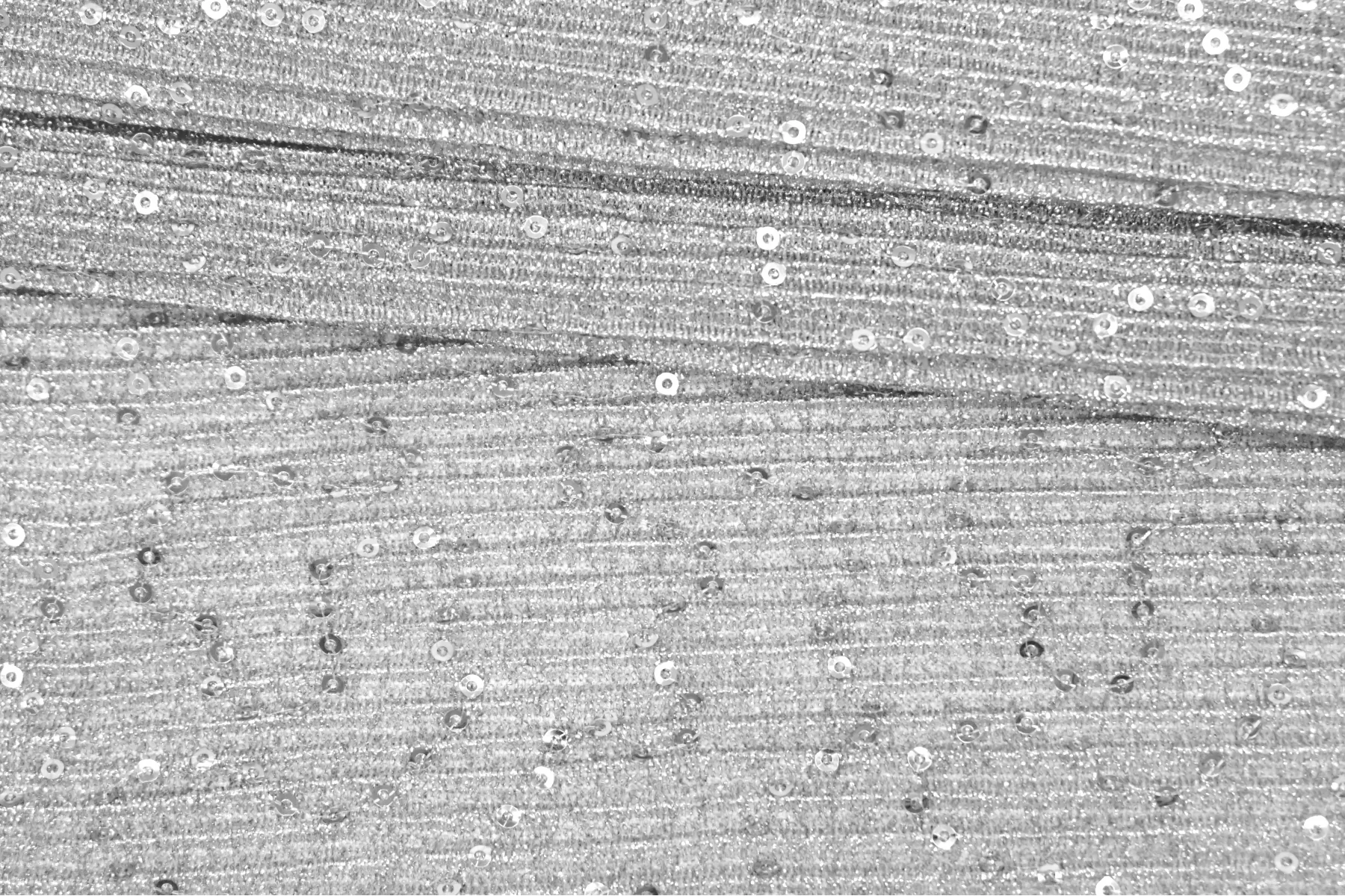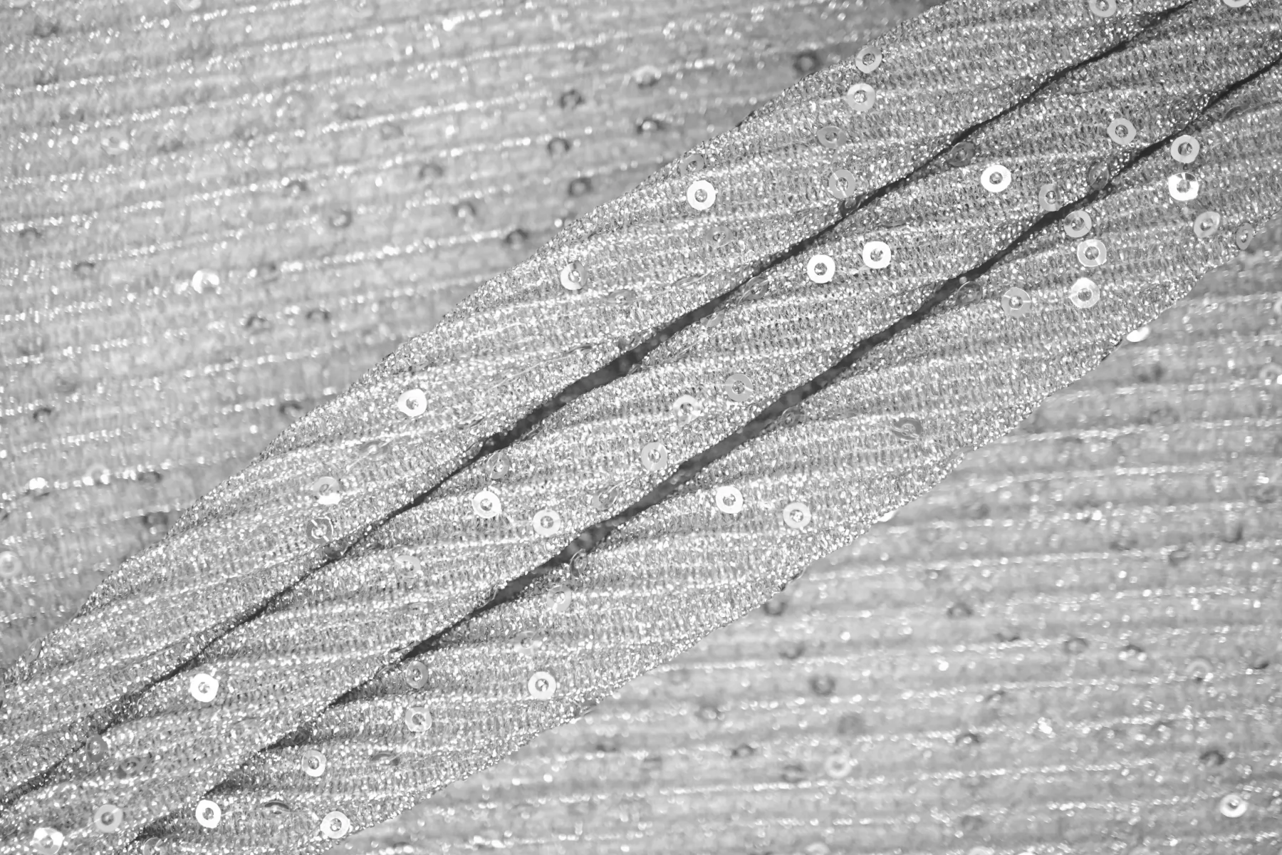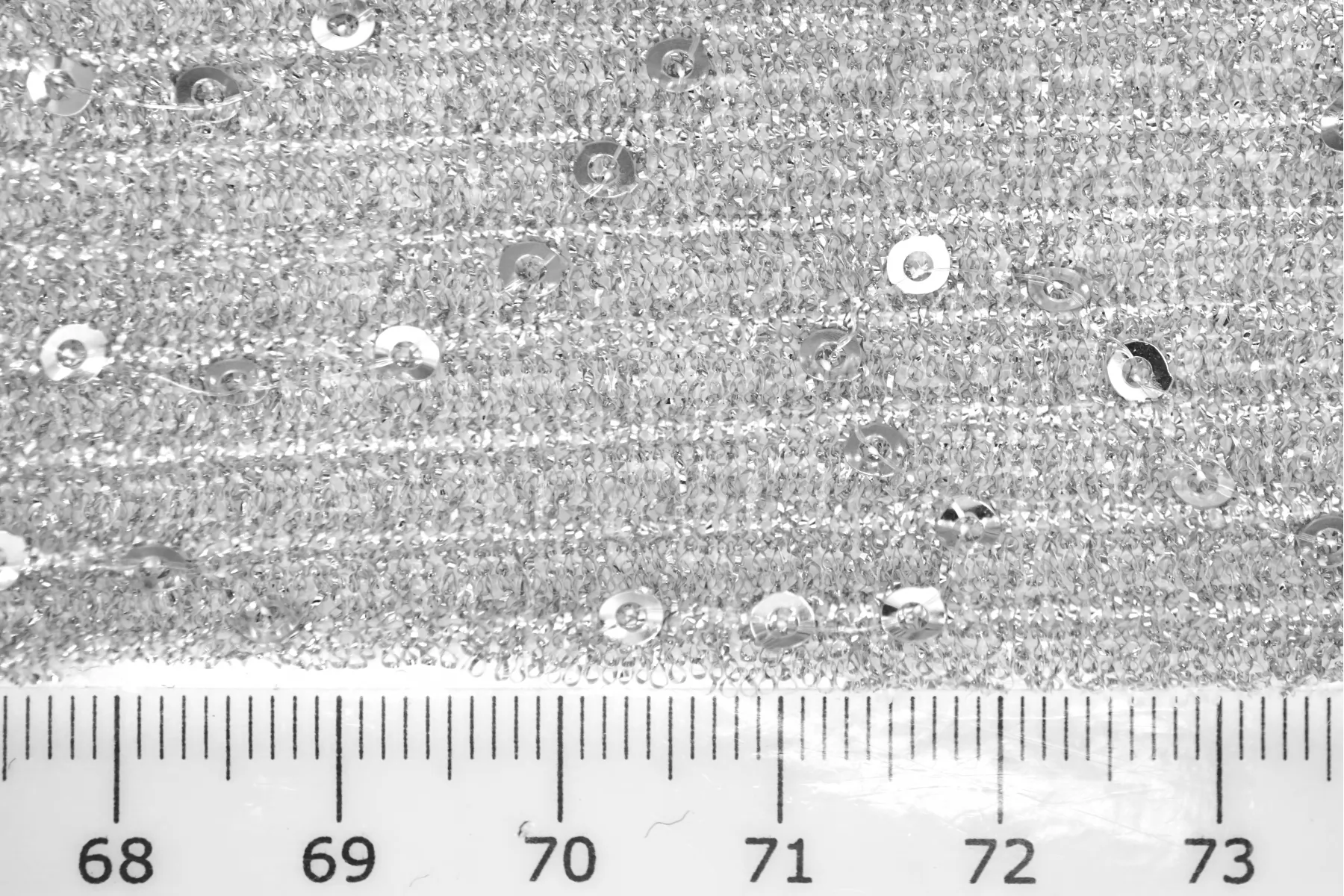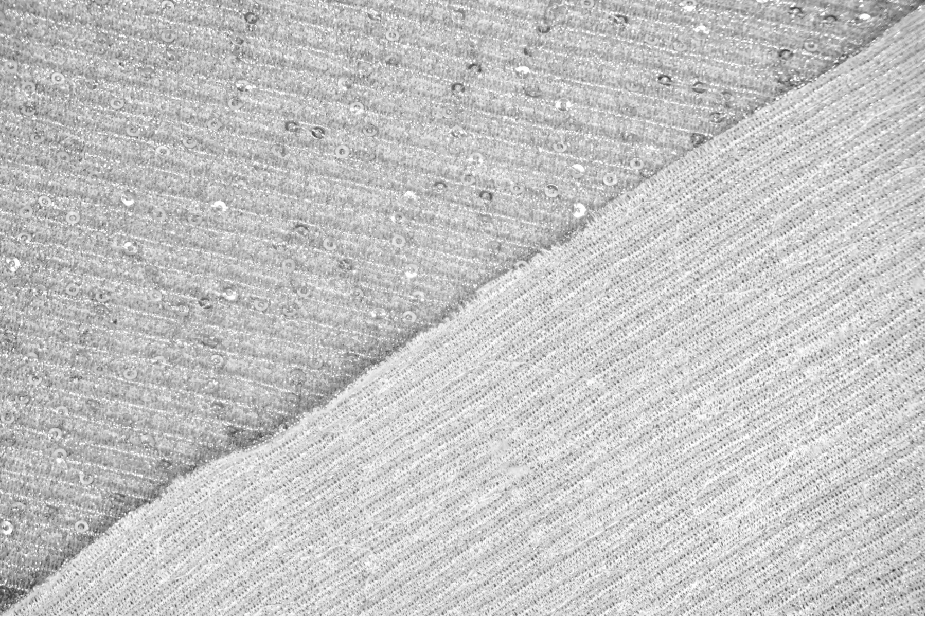 Нарядный тонкий серебряный трикотаж с пайетками и люрексом от бренда Atelier Emé . Гофрированная поверхность. Красивый нарядный блеск, полупрозрачное тонкое полотно. Выглядит эффектно и очень нарядно. Пластичный, эластичный. Просвечивает силуэт. Отлично тянется. Немного держит форму. Отличный вариант на нарядные кофты, платья, отдельные элементы изделия и не только. При необходимости используйте подкладочный материал.