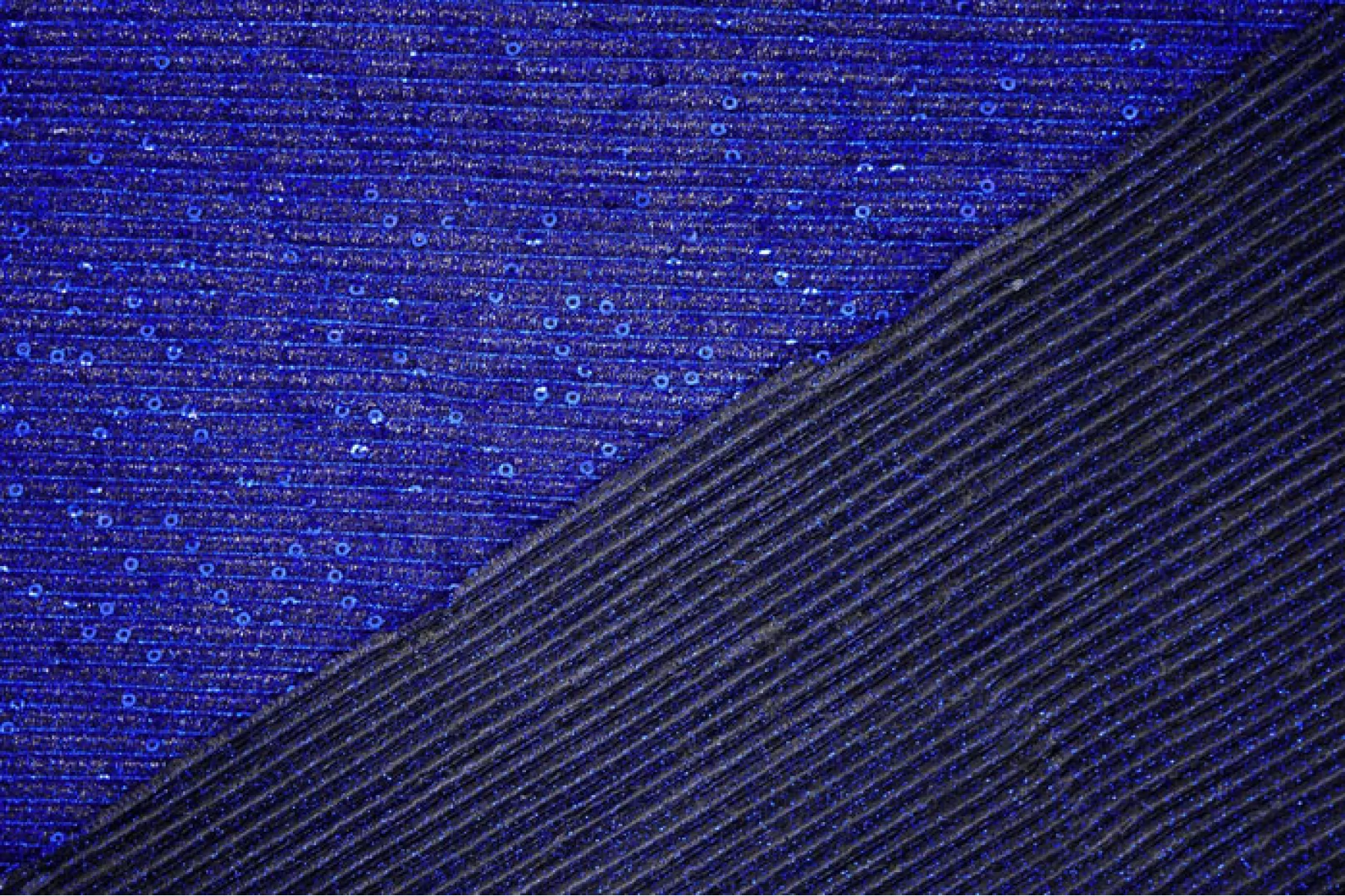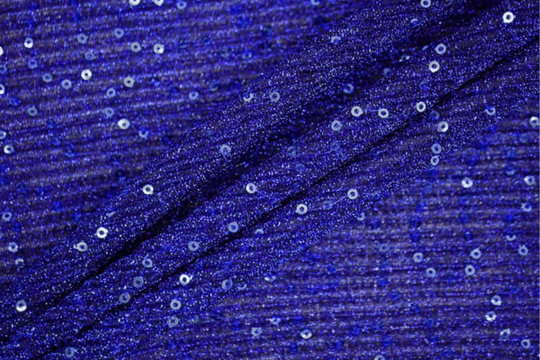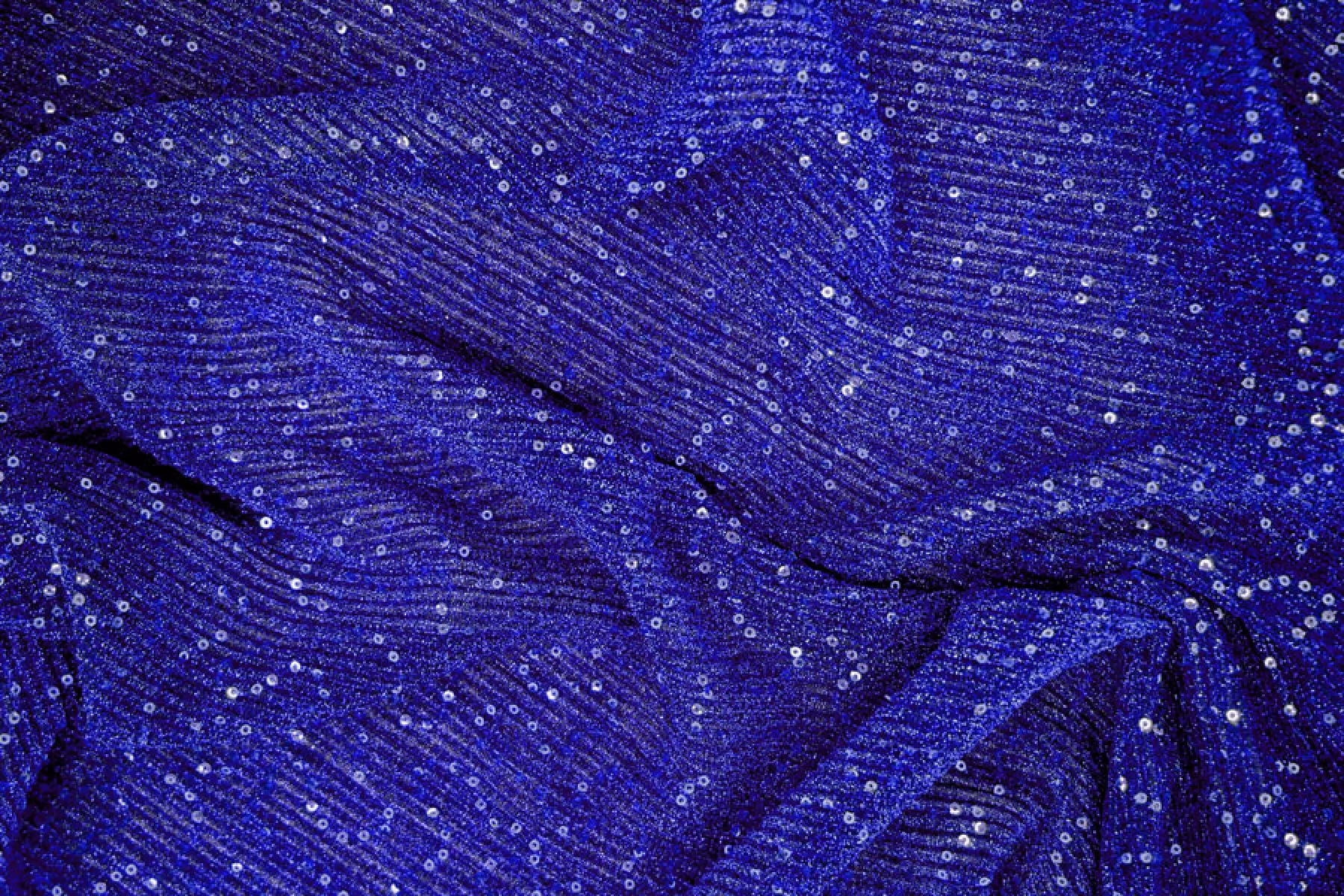 Нарядный тонкий трикотаж синего цвета с пайетками и люрексом. Гофрированная поверхность. Красивый нарядный блеск, полупрозрачное тонкое полотно. Изнаночная сторона черного цвета, гладкая. Выглядит эффектно и очень нарядно. Пластичный, эластичный. Просвечивает силуэт. Отлично тянется. Немного держит форму. Отличный вариант на нарядные кофты, платья, отдельные элементы изделия и не только. При необходимости используйте подкладочный материал.