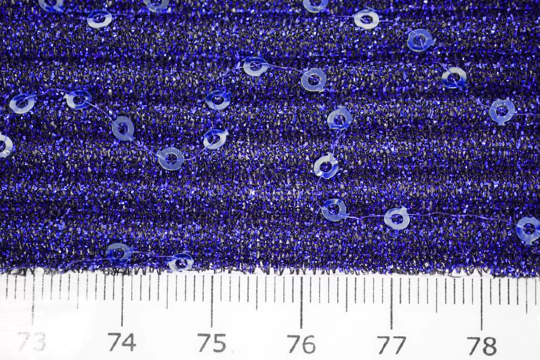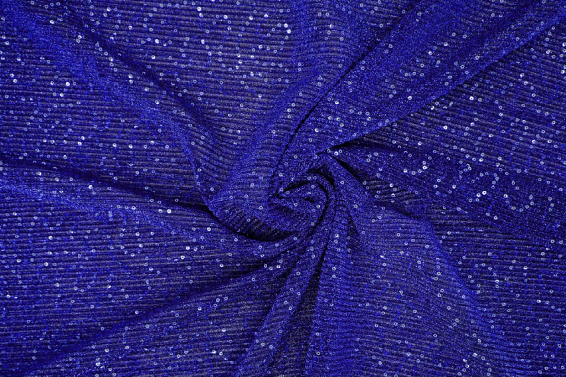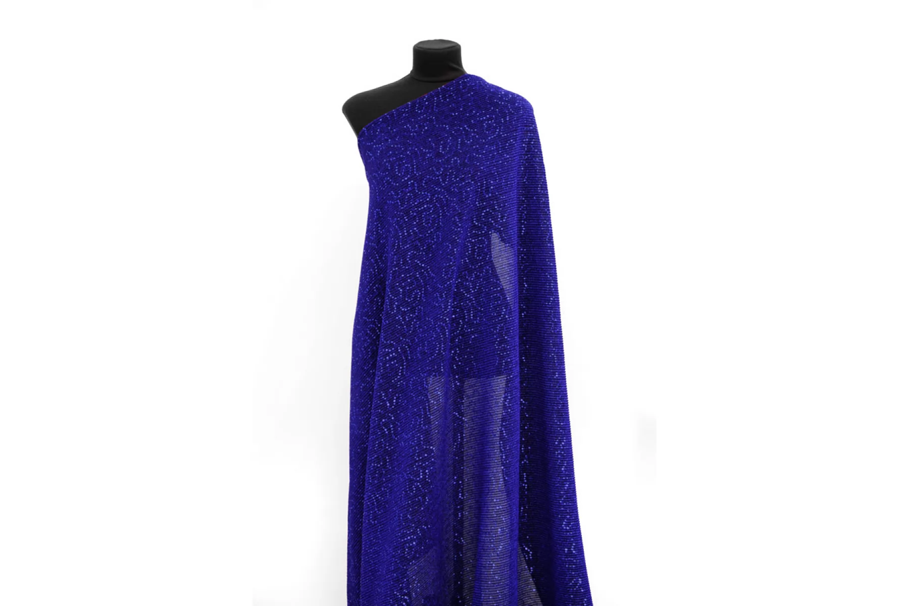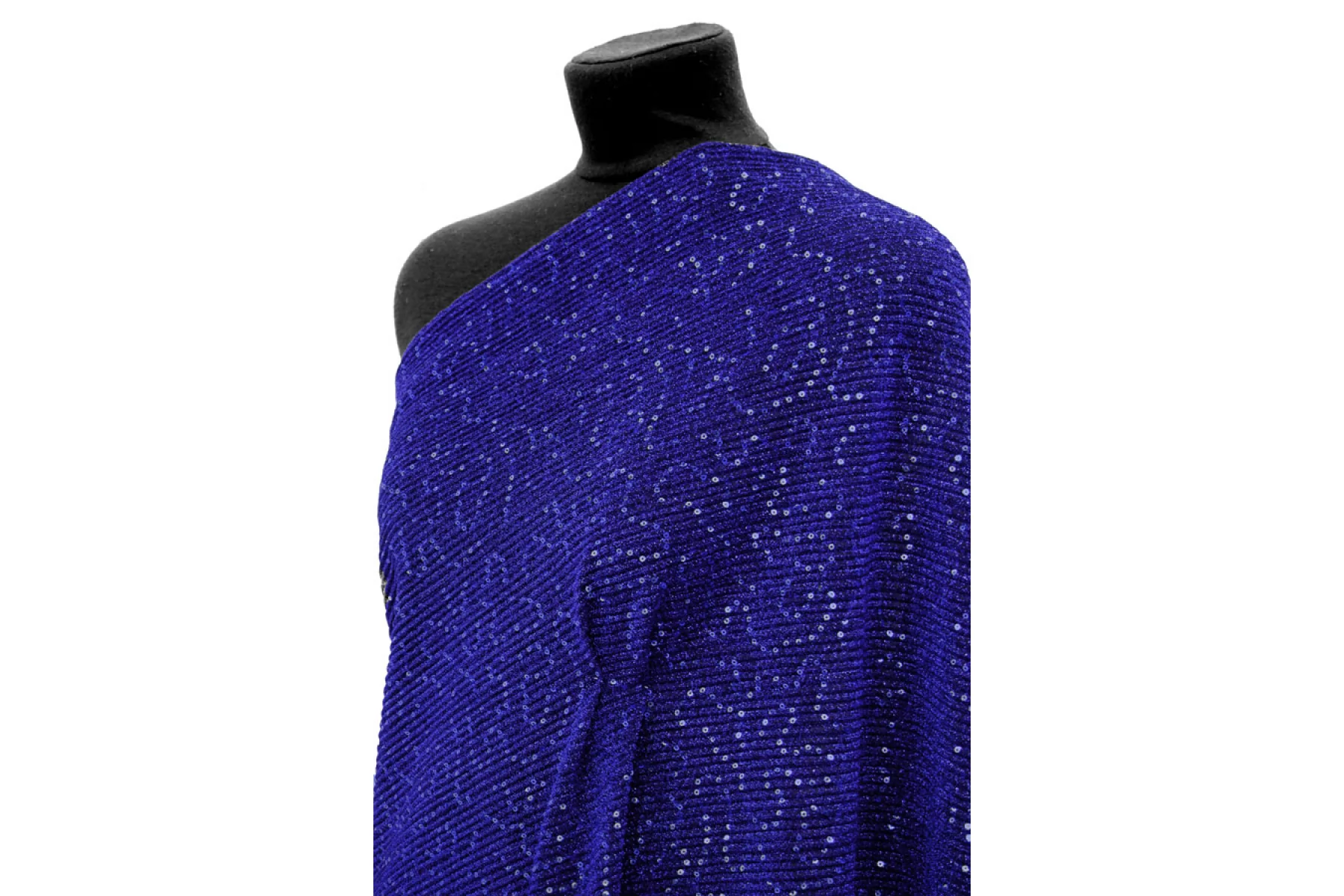 Нарядный тонкий трикотаж синего цвета с пайетками и люрексом. Гофрированная поверхность. Красивый нарядный блеск, полупрозрачное тонкое полотно. Изнаночная сторона черного цвета, гладкая. Выглядит эффектно и очень нарядно. Пластичный, эластичный. Просвечивает силуэт. Отлично тянется. Немного держит форму. Отличный вариант на нарядные кофты, платья, отдельные элементы изделия и не только. При необходимости используйте подкладочный материал.