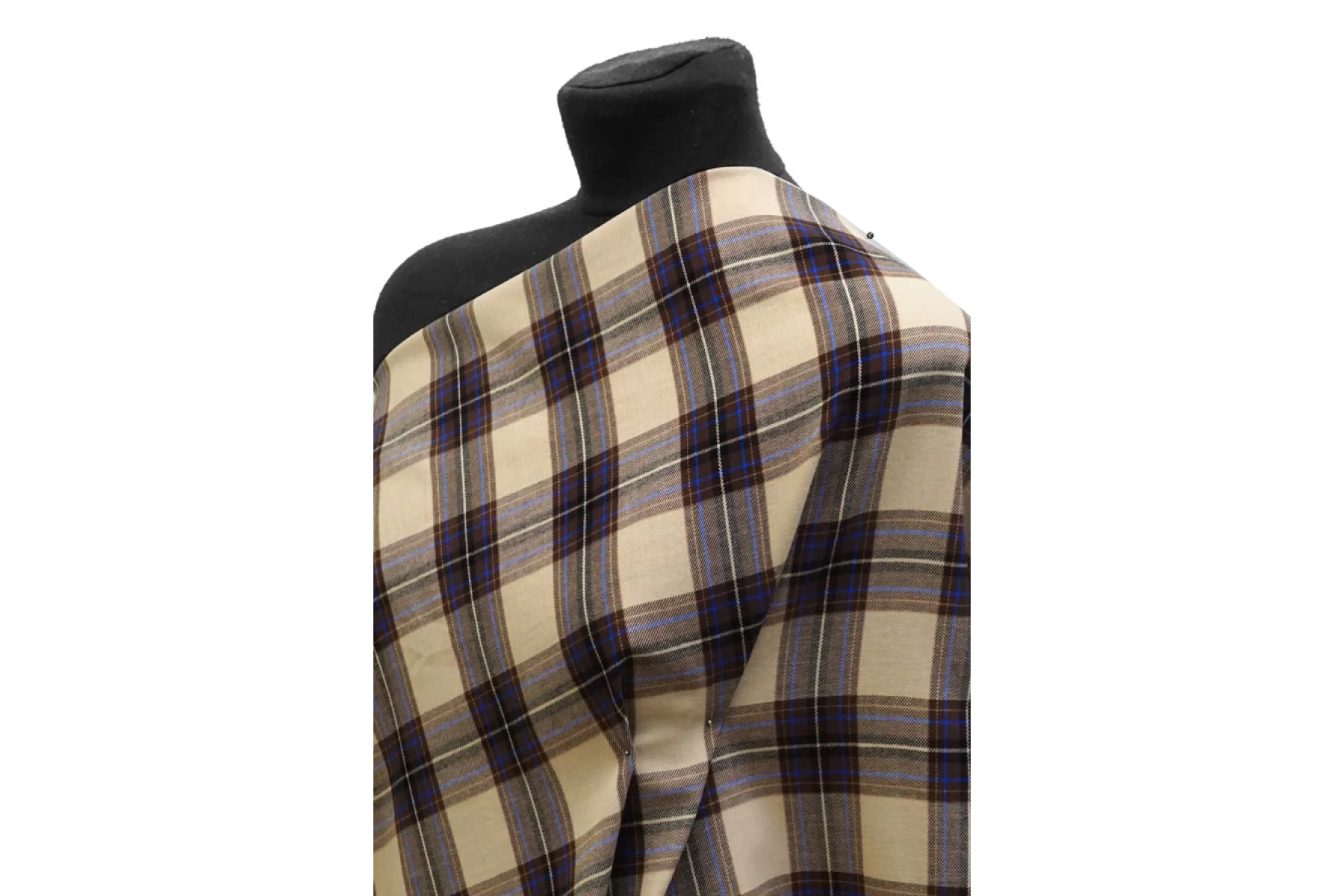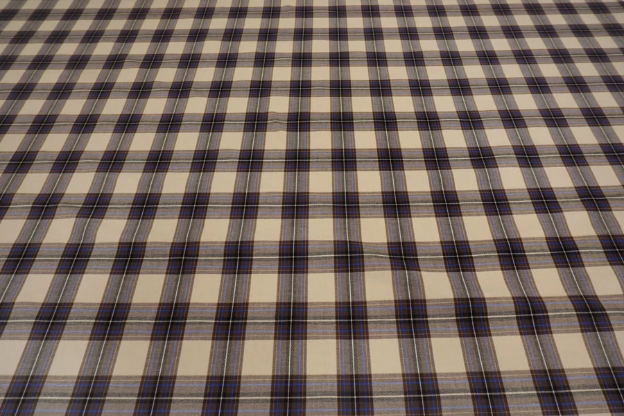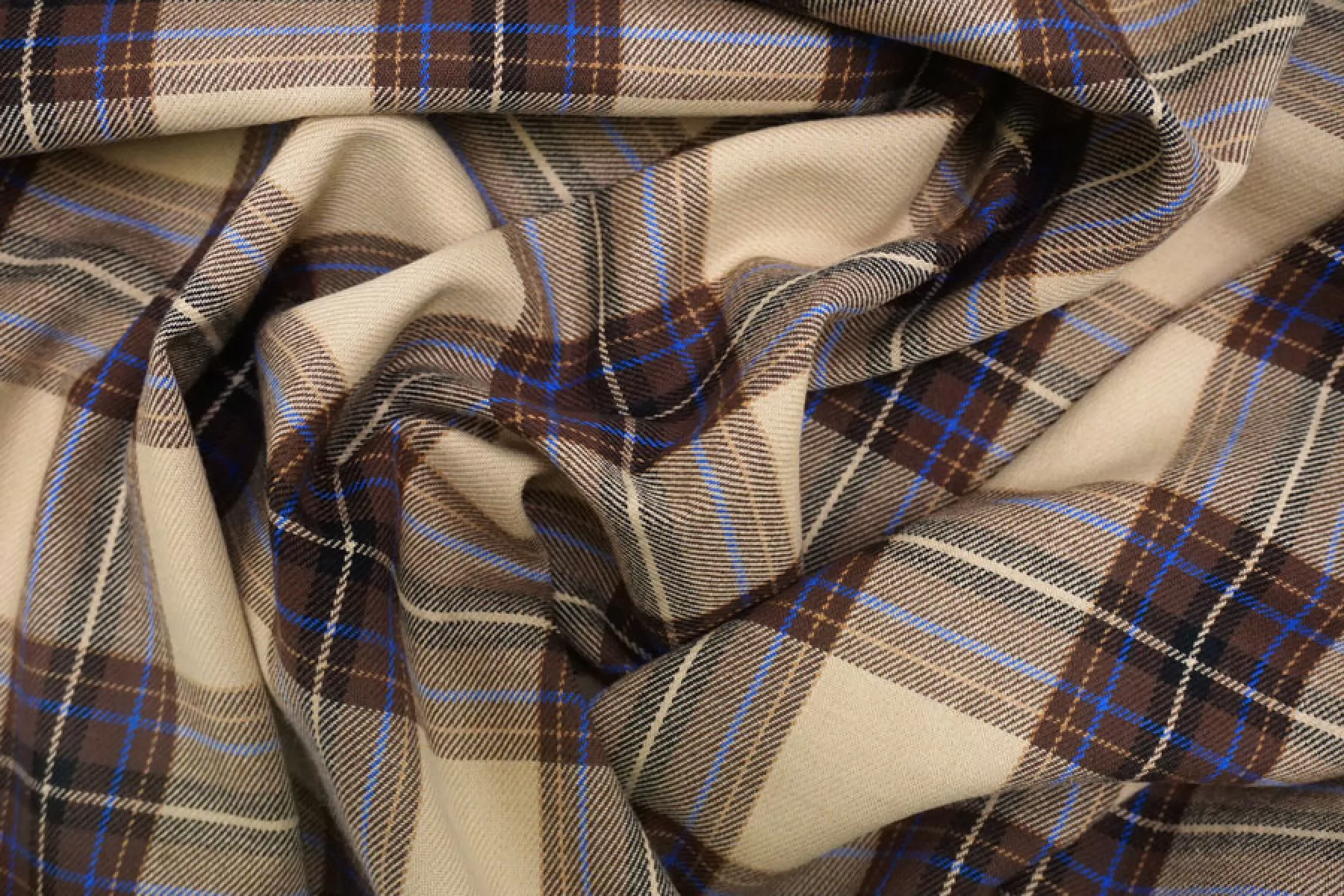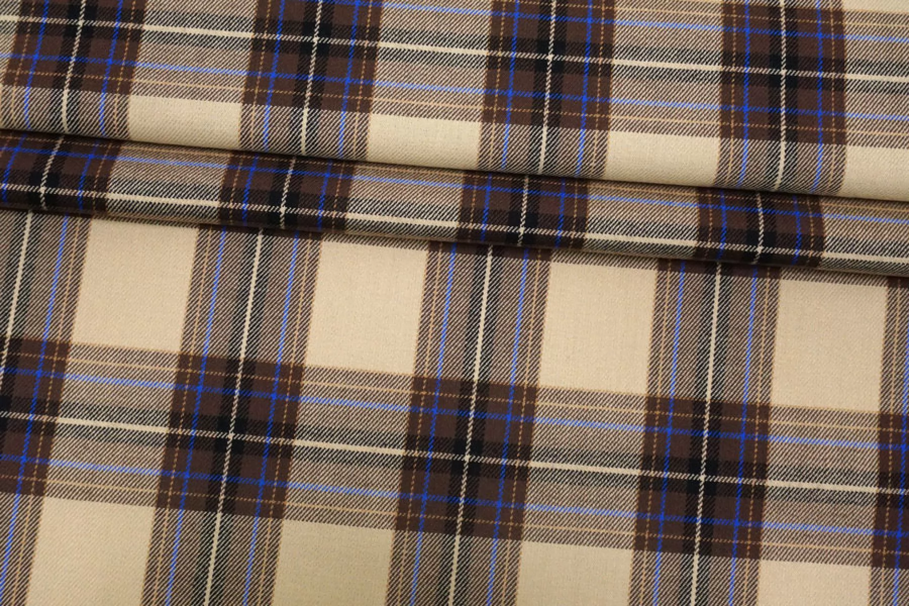 Рубашечный хлопок с узором-клеткой из нитей бежевого, коричневого и сине-голубого цвета. Мягкая, приятная, пластичная, не толстая. Не тянется. Немного мнется, не просвечивает. Шьем уютные и очень комфортные платья, брюки на резинке, теплые рубашки, юбки. Учитывайте усадку.