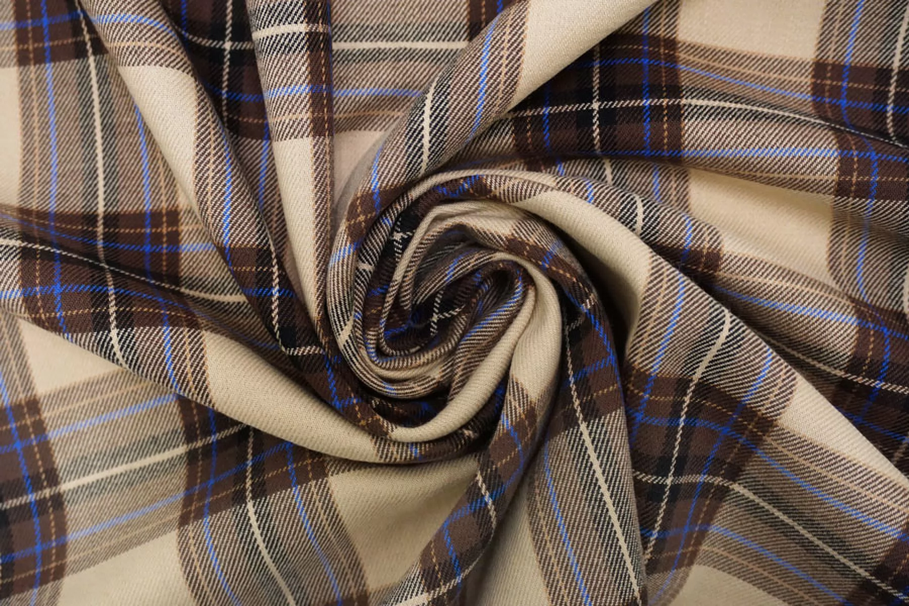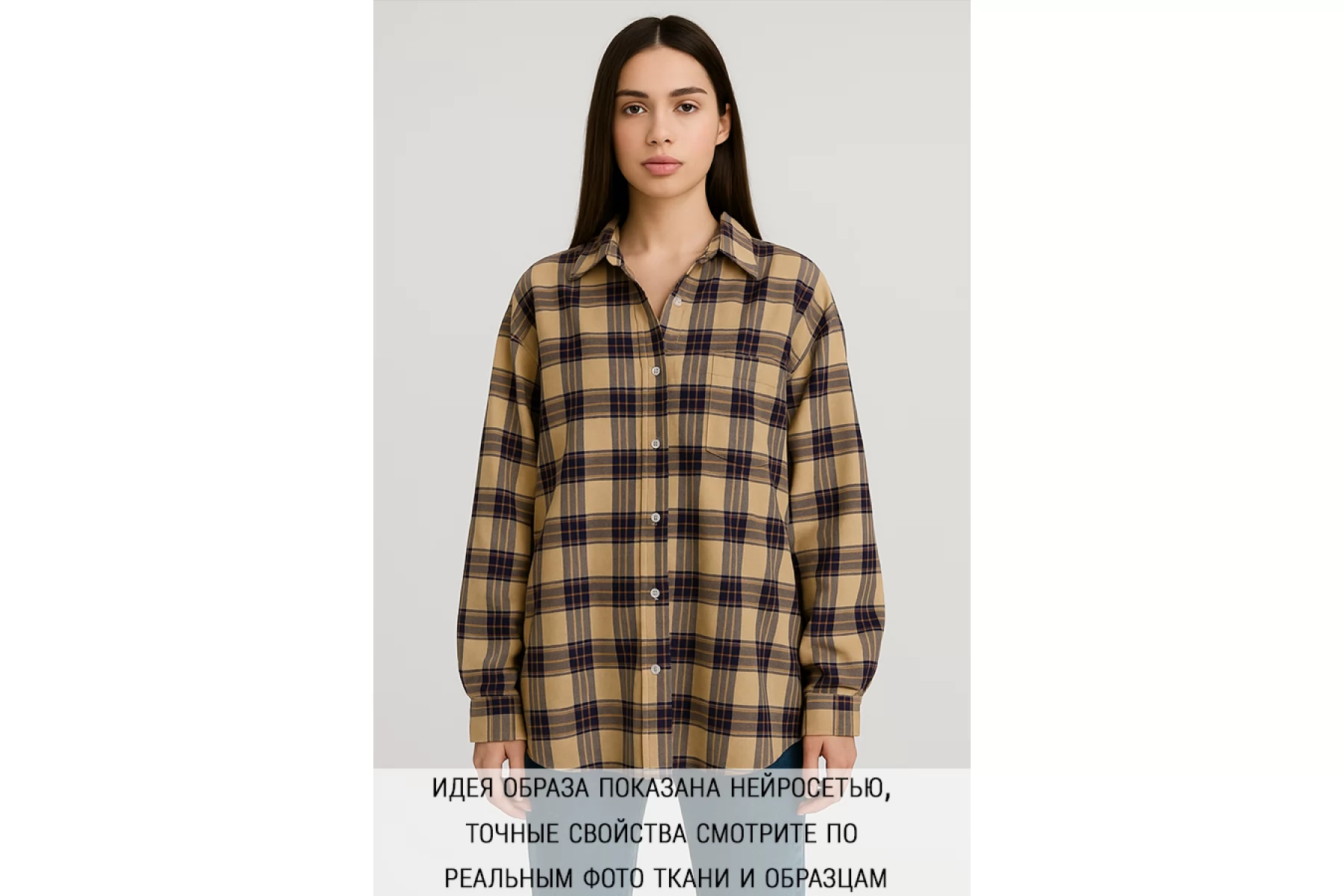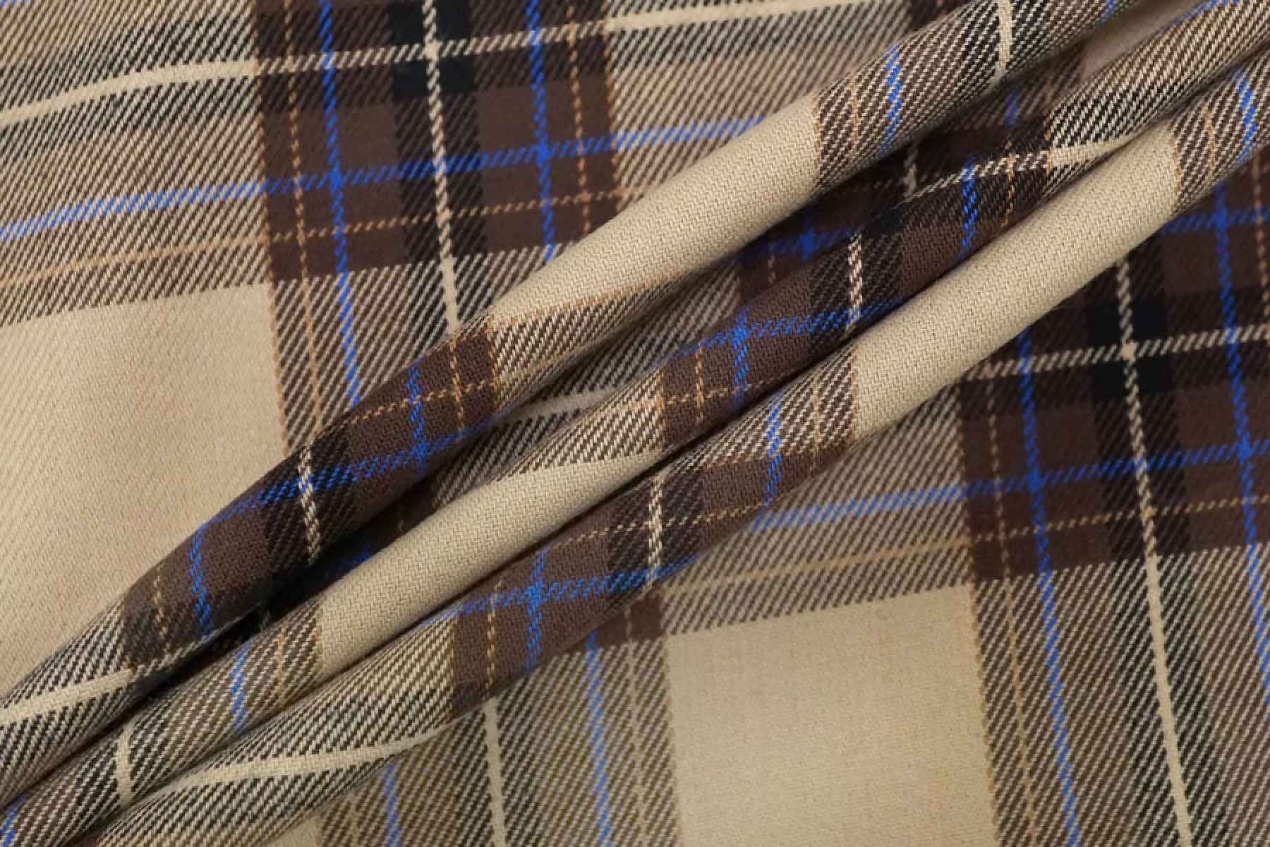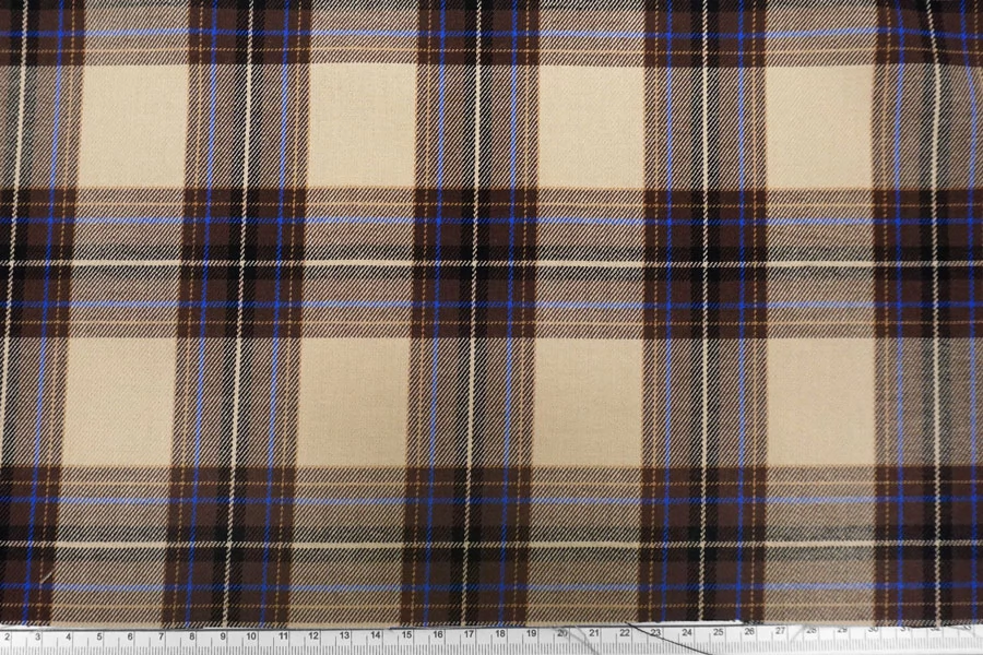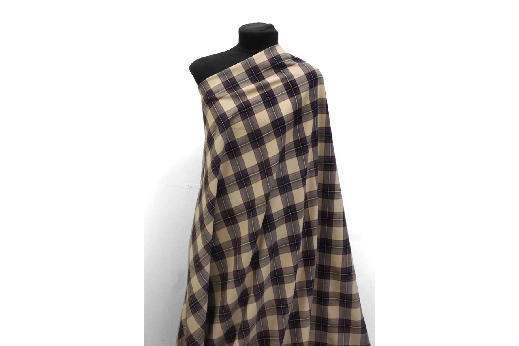 Рубашечный хлопок с узором-клеткой из нитей бежевого, коричневого и сине-голубого цвета. Мягкая, приятная, пластичная, не толстая. Не тянется. Немного мнется, не просвечивает. Шьем уютные и очень комфортные платья, брюки на резинке, теплые рубашки, юбки. Учитывайте усадку.
