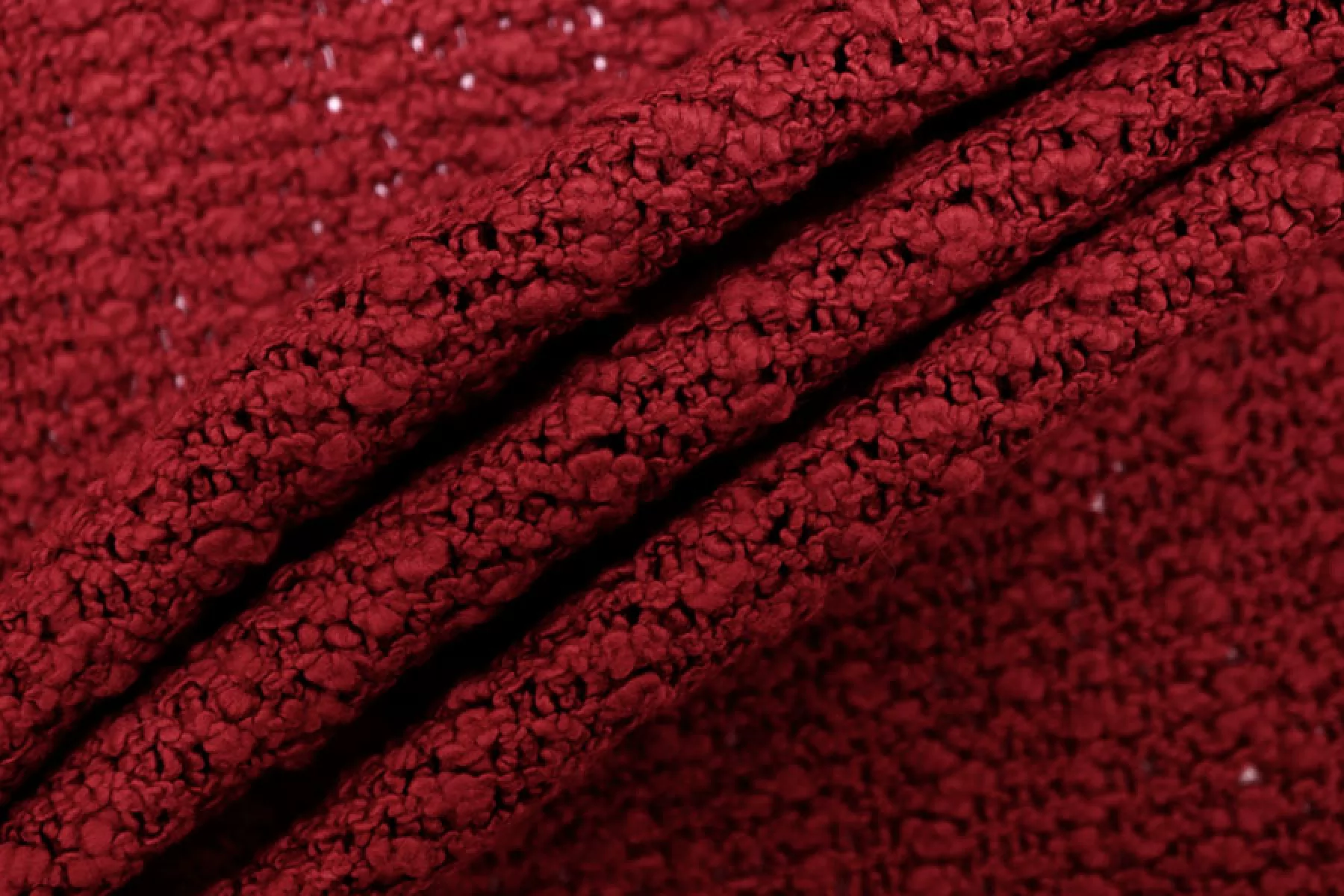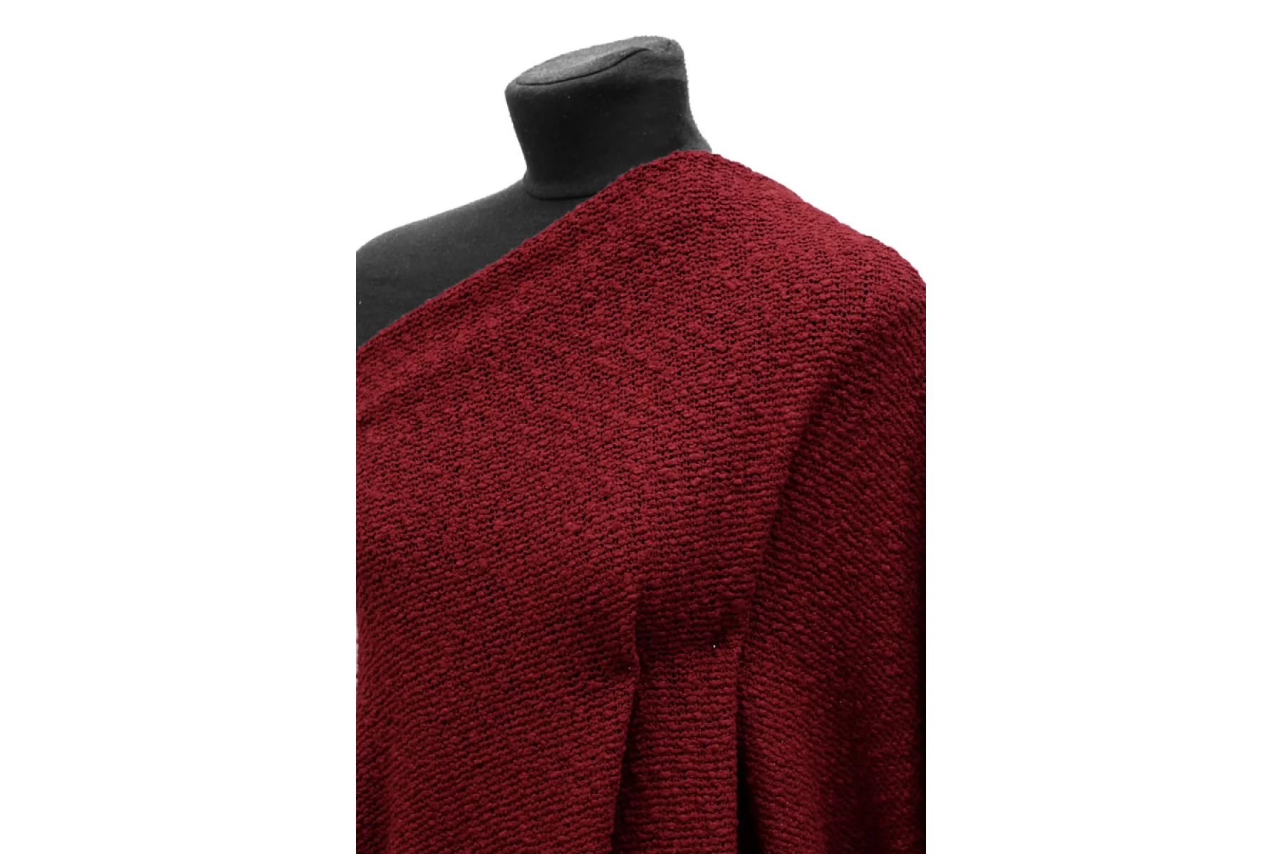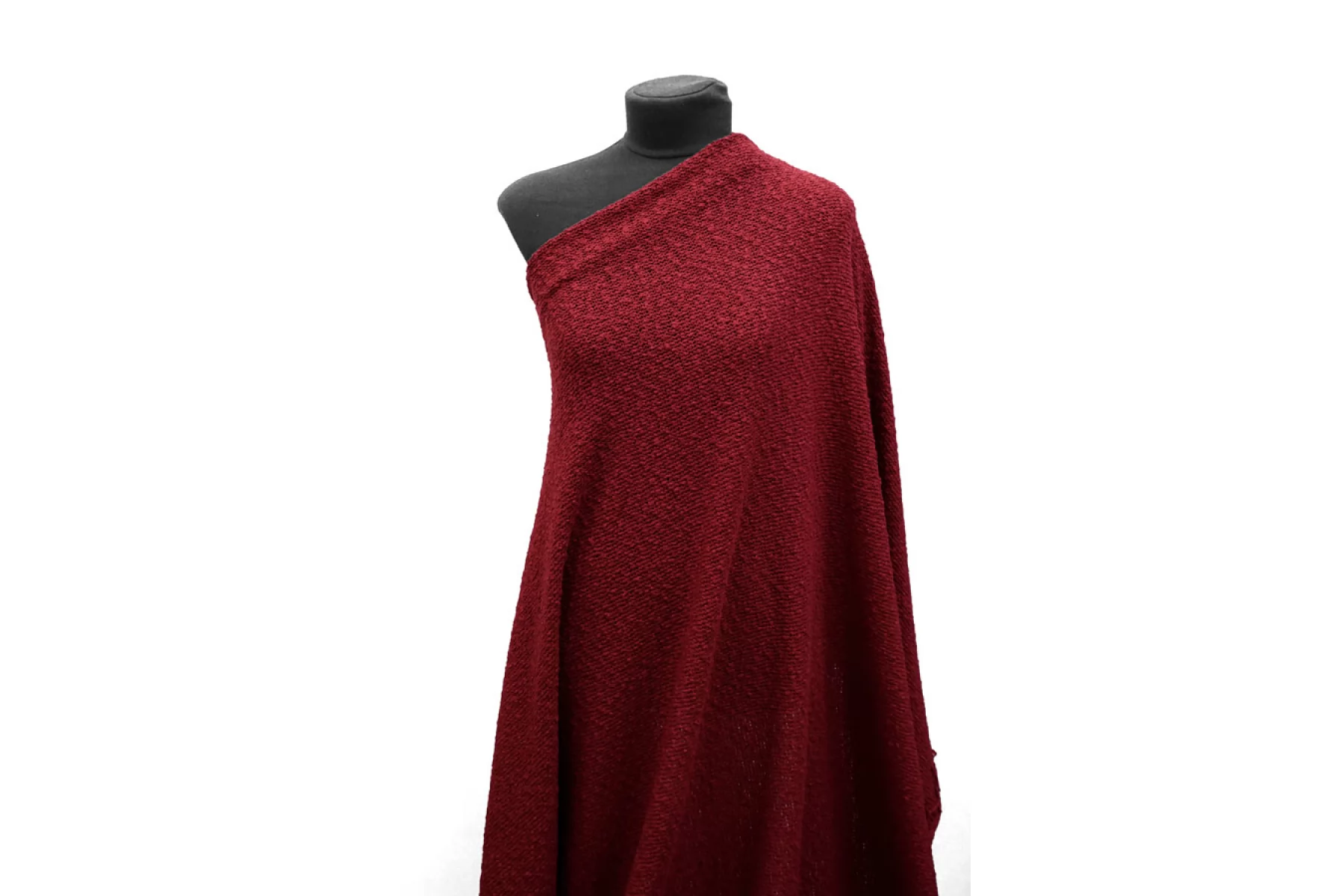 Очень интересный фактурный хлопковый трикотаж, напоминает макраме, в малиновом оттенке. Материал тактильно суховатый, фактурный, мягкий. Плетение не плотное, поэтому просвечивает силуэт. Не тянется. Форм держит, довольно пластичен. Подойдет на мягкие жакеты, платья, юбки, накидки, туники. Учитывайте возможную усадку.