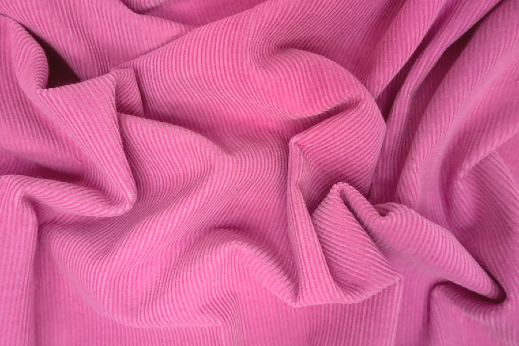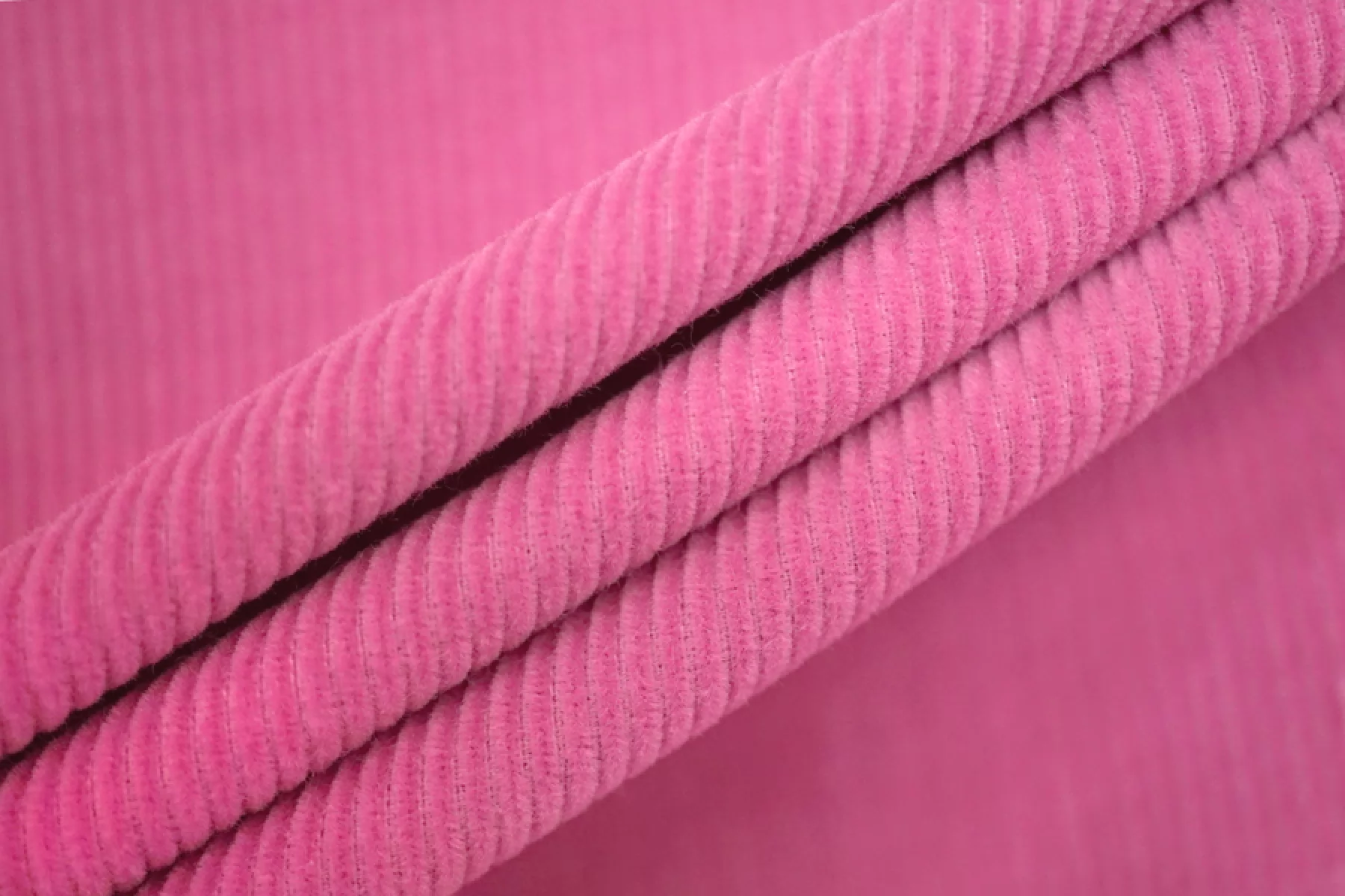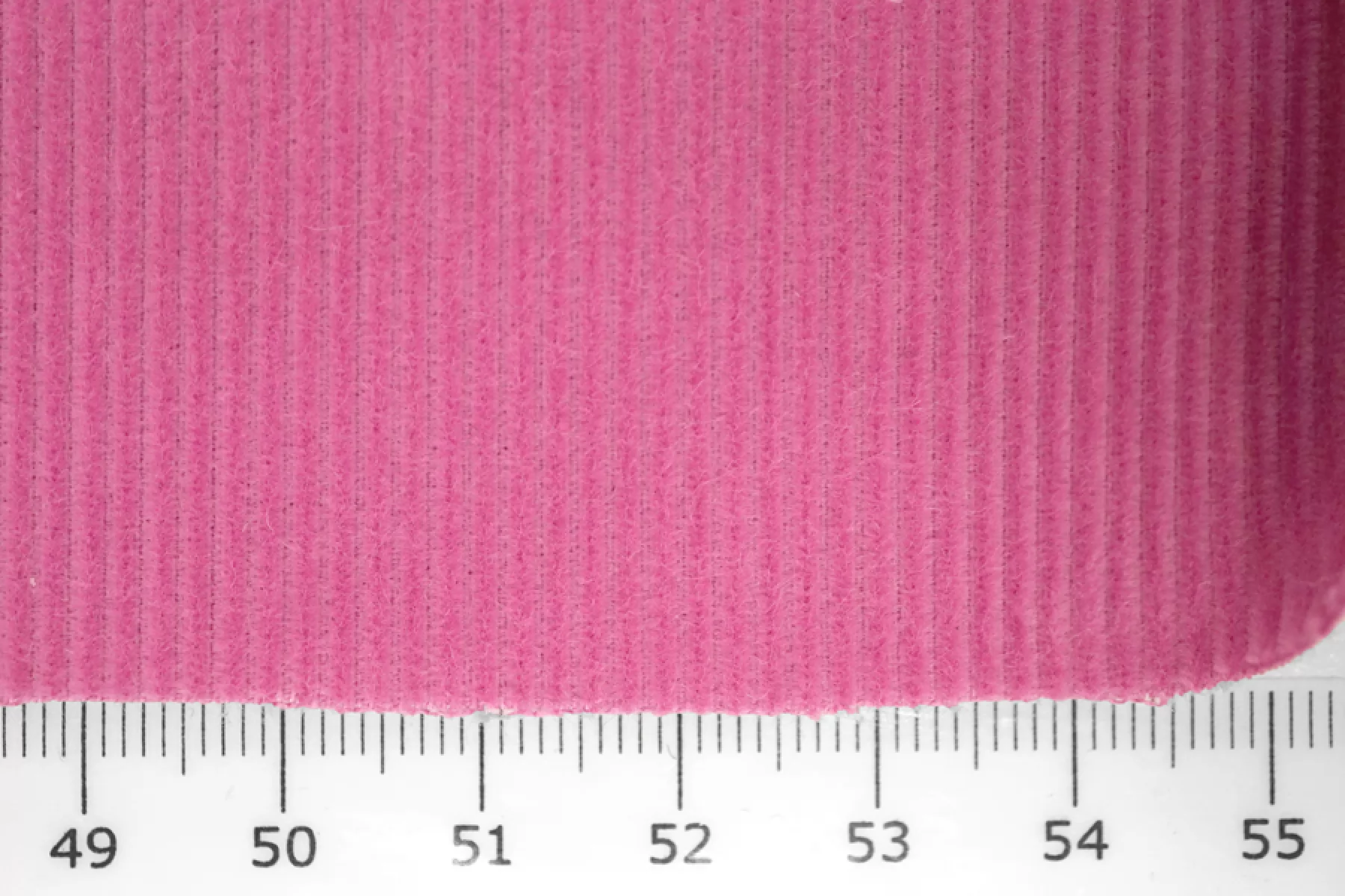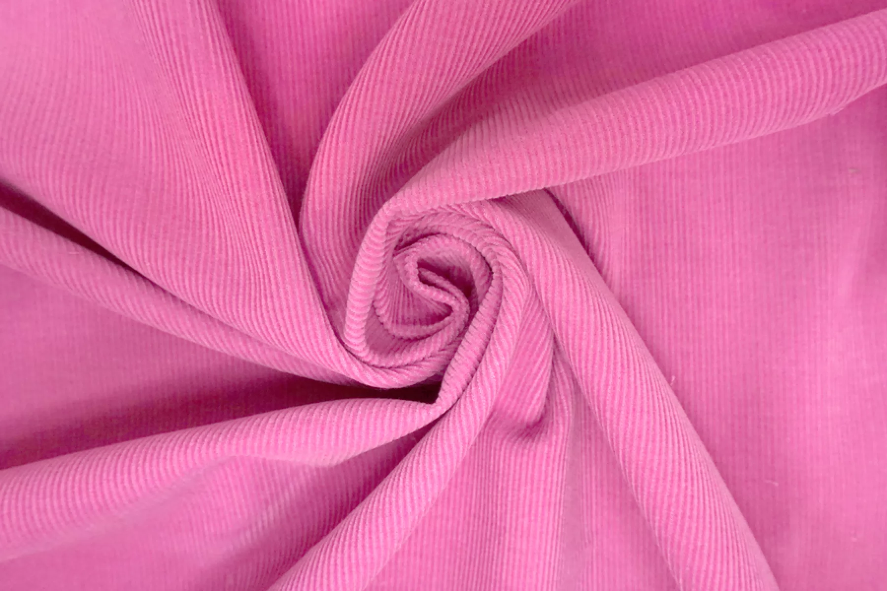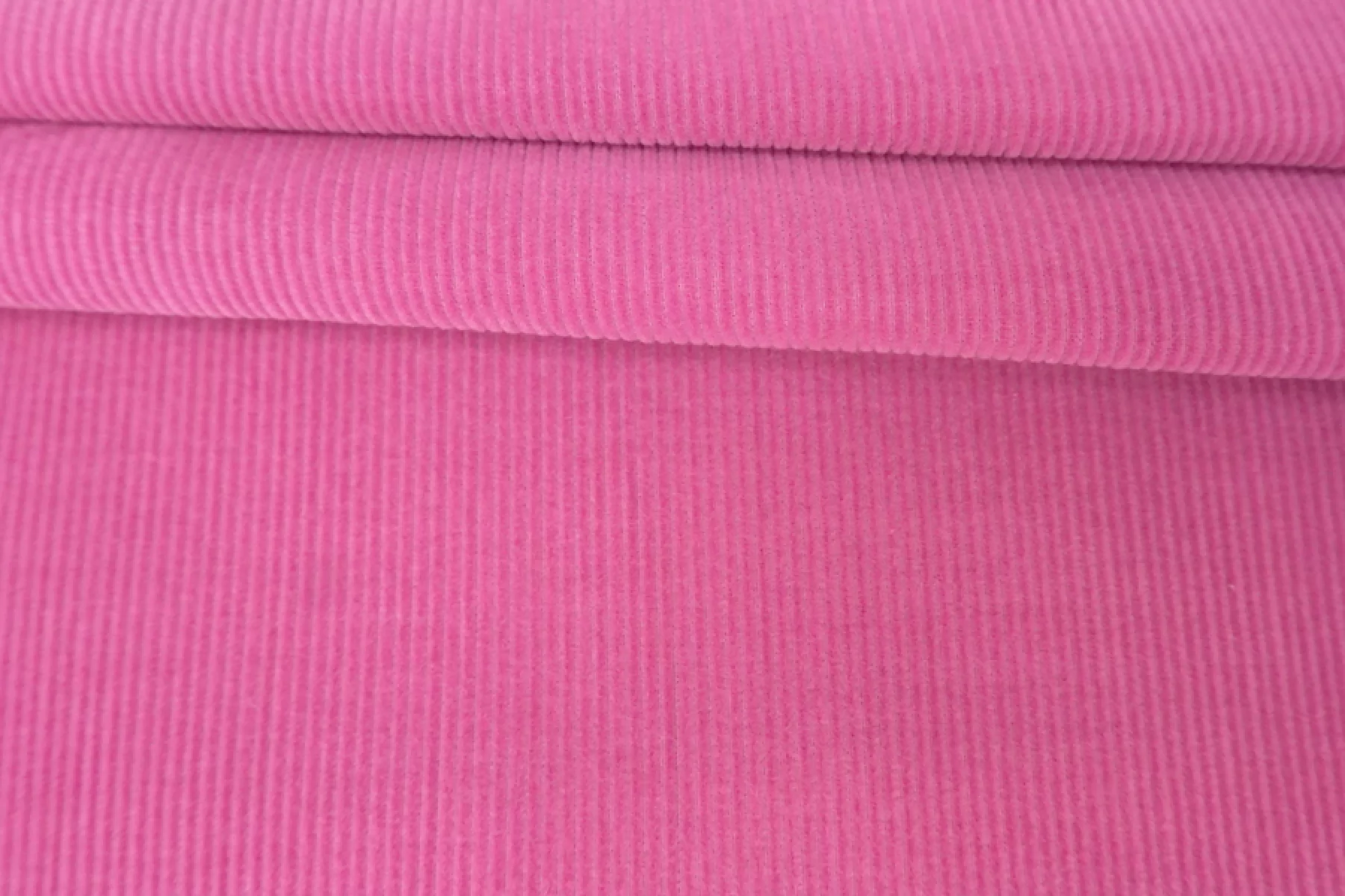 Итальянский микровельвет костюмно-плательной плотности розового цвета. Ширина рубчика ~1,5 мм. Приятный тактильно, мягкий, слегка суховатый. Немного тянется. Тонкий, но плотный. Не просвечивает. Хорошо смотрится в складке. Неплохо держит форму. Сминается. Подойдет для пошива платья, сарафана, жакета-рубашки, юбки, шорт и костюмных вариантов.