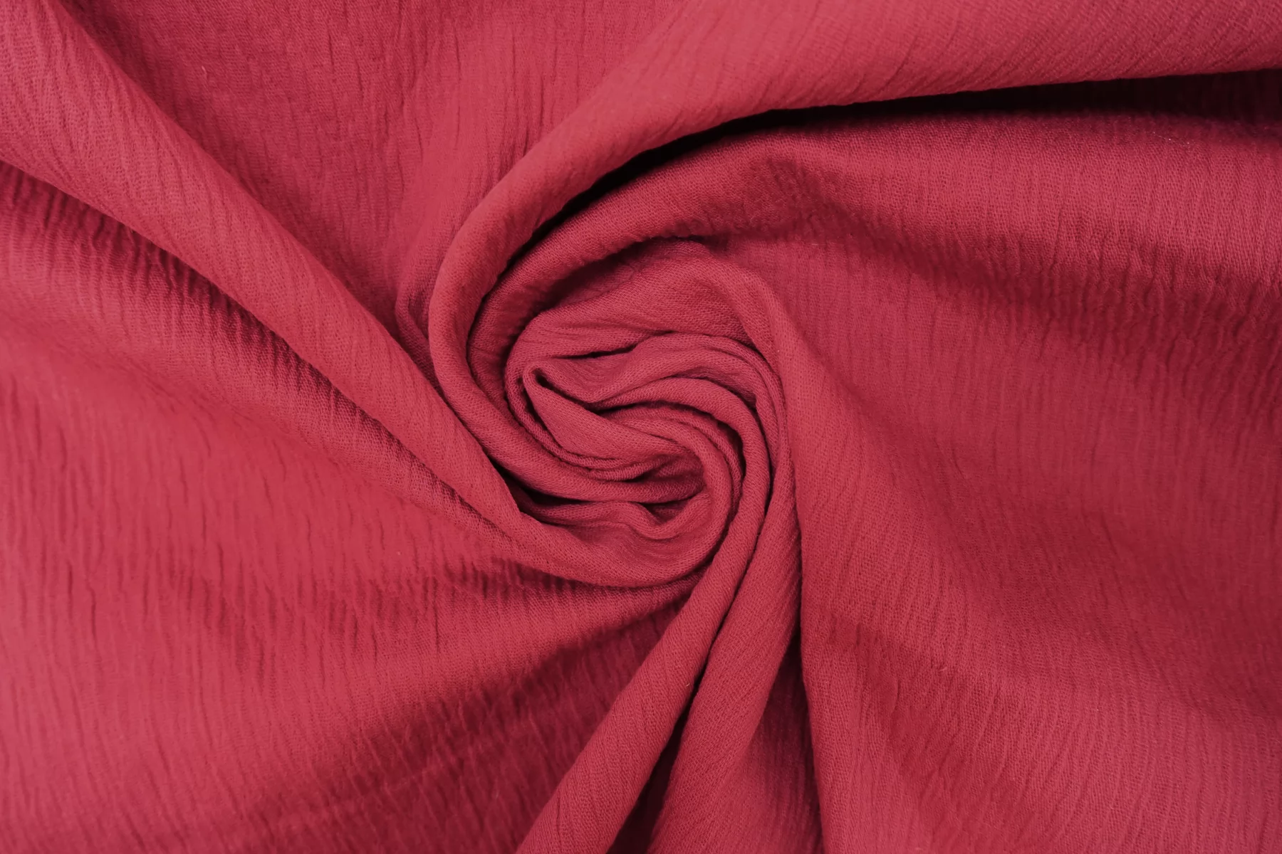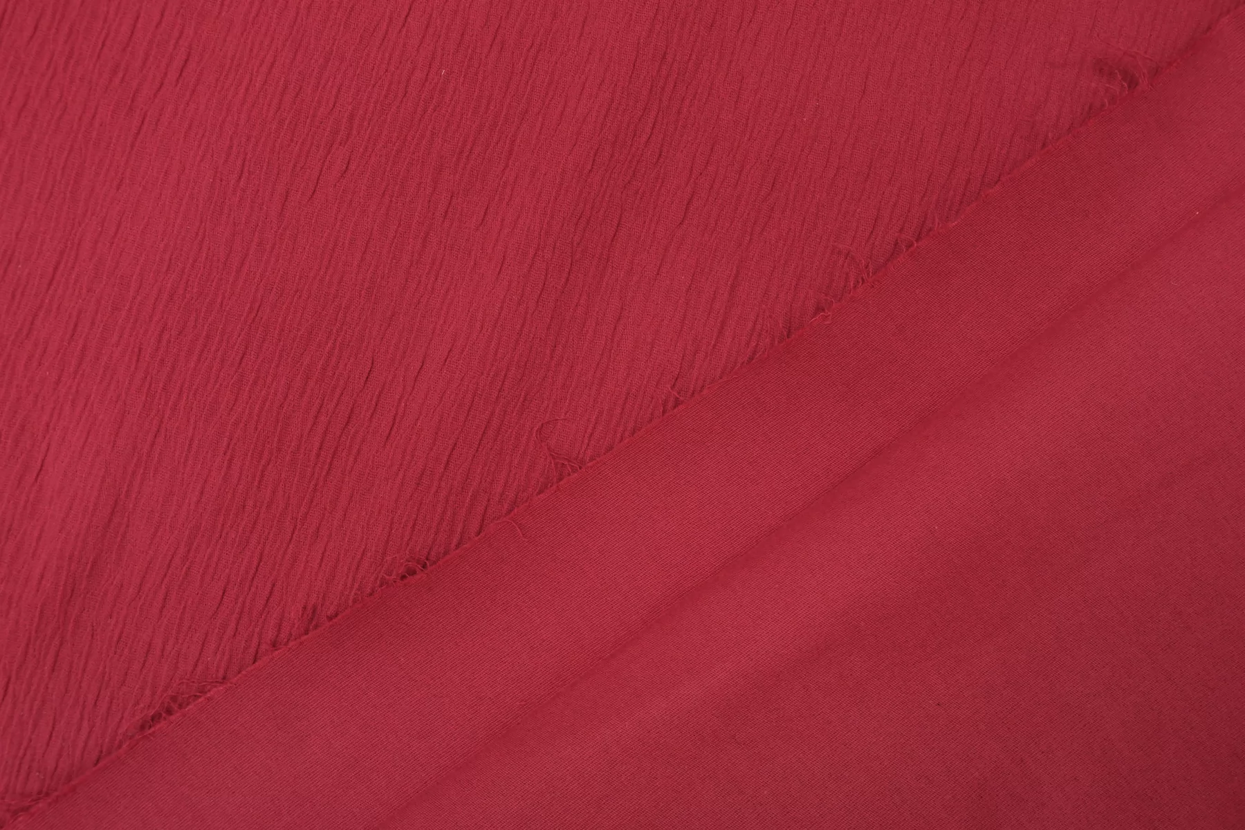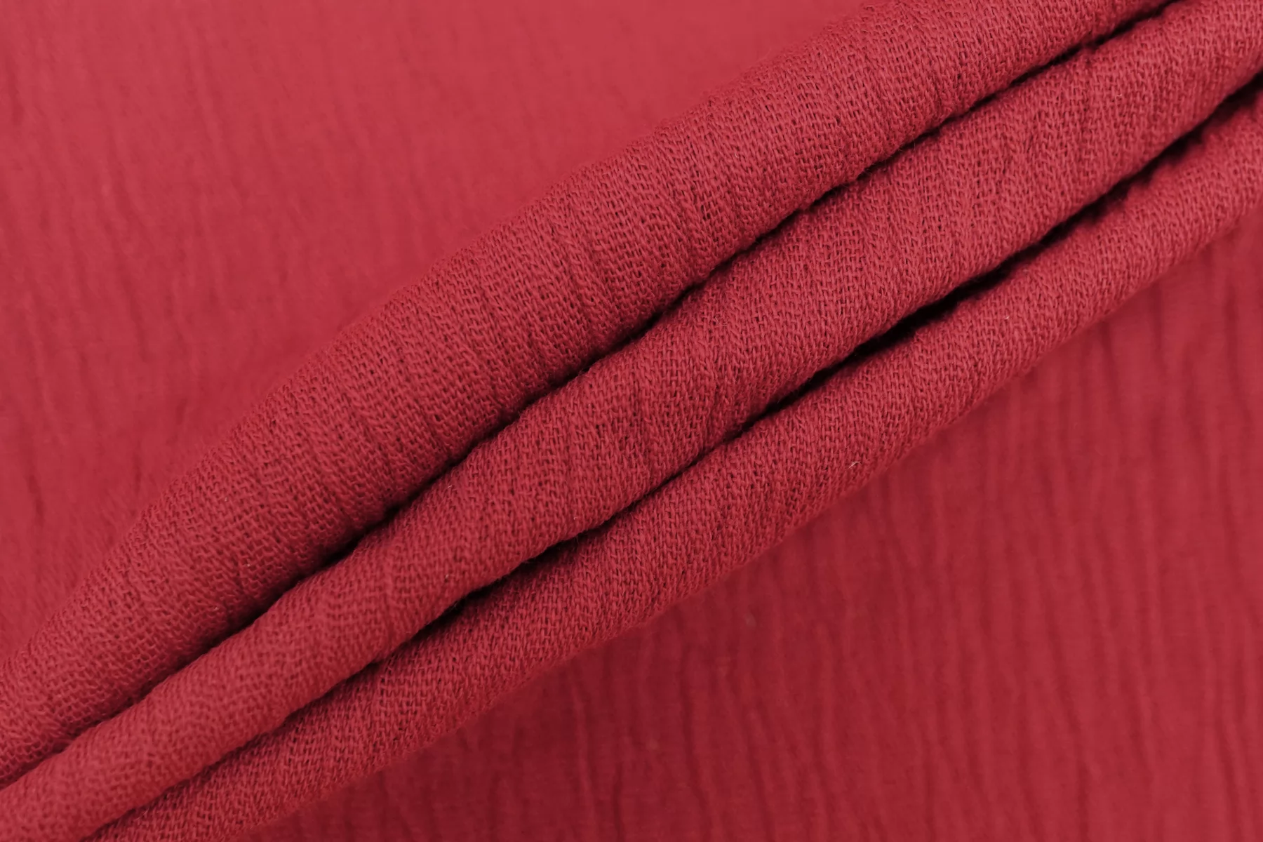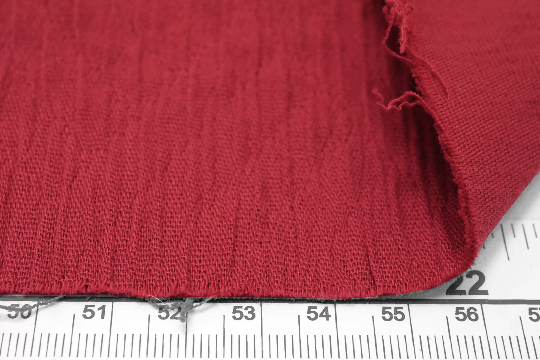 Костюмно-плательный хлопок в красно-ягодном цвете. По сути это марлевка, с одной стороны с крешированным эффектом, двухслойная, слои разделяются. Пластичная, эластичная. Немного держит форму. Не просвечивает. Прекрасно подойдет на платья, юбки, лёгкие летние костюмы расслабленного кроя. Учитывайте усадку материала.