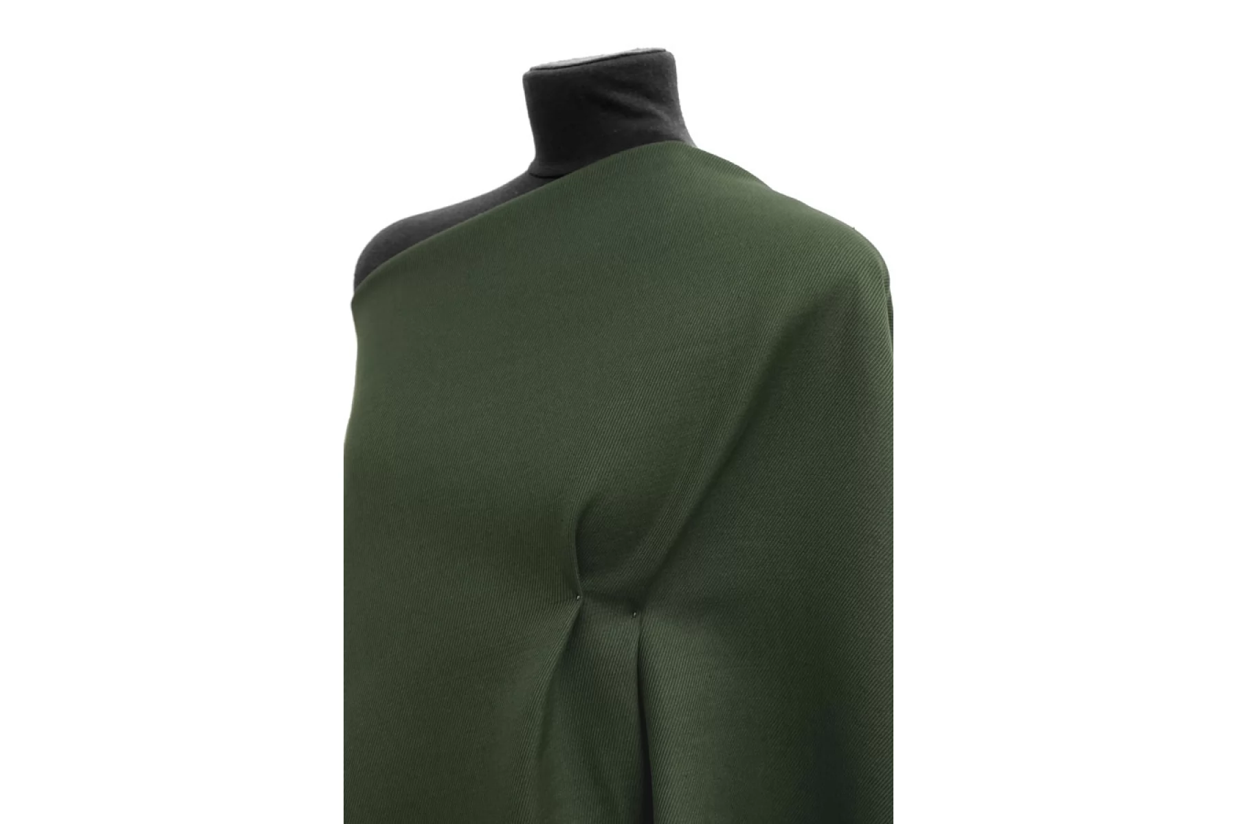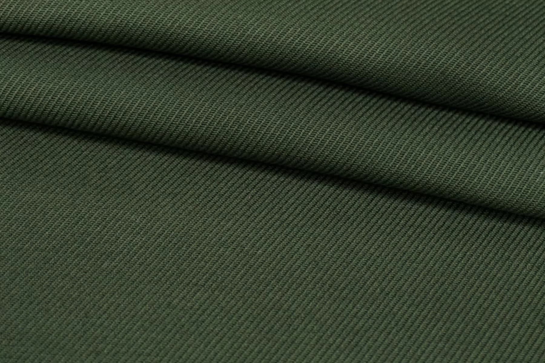 Шикарный двуслойный костюмный хлопок диагонального джинсового плетения в темно-зеленом цвете. Материал двухсторонний, обе стороны можно использовать как рабочие. Слои легко разделяются, но немного деформируются. Приятный наощупь, чувствуется плетение. Форму держит хорошо, при этом довольно пластичный. Не сминается. Не просвечивает. Немного тянется, благодаря плетению. Отличный вариант на демисезонные костюмы, брюки, юбки, жакеты, джинсовки. Учитывайте возможную усадку.