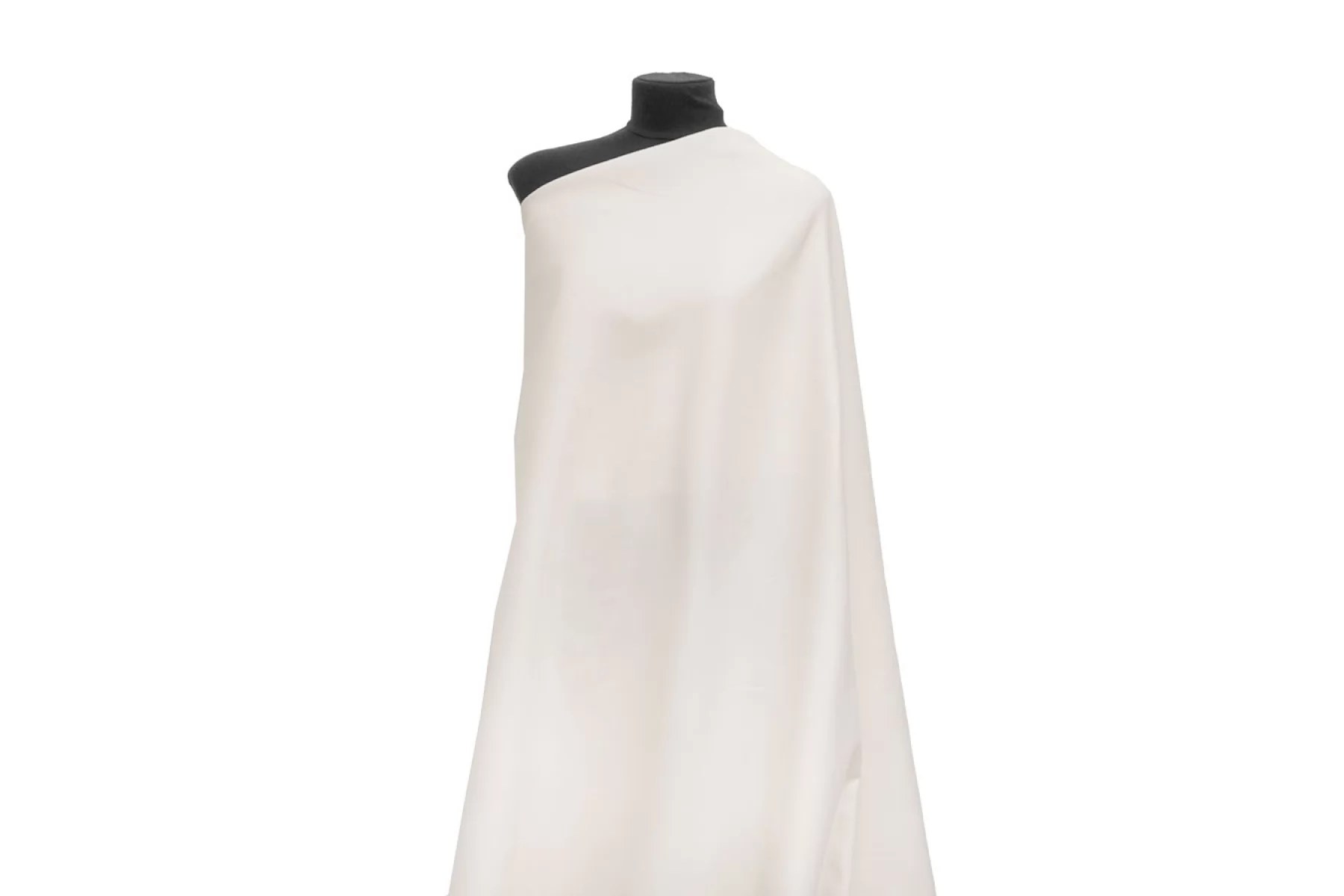 Костюмный хлопок диагонального плетения молочного оттенка. Ткань достаточно мягкая, плотная, с легкой креповой фактурой. Прекрасно держит мягкие складки. Слегка просвечивает силуэт, хорошо тянется, красиво драпируется. Подойдет для пошива жакета, костюма, демисезонной юбки, платья.