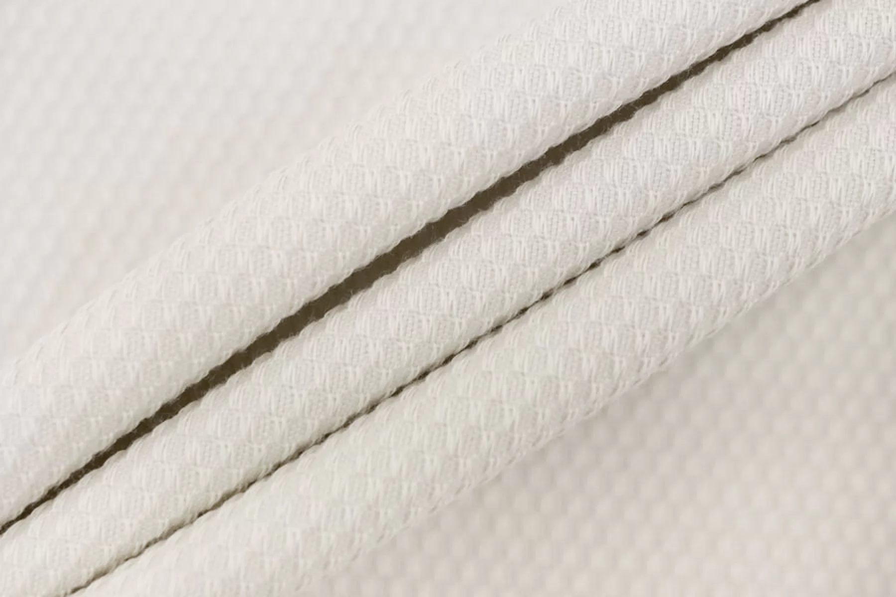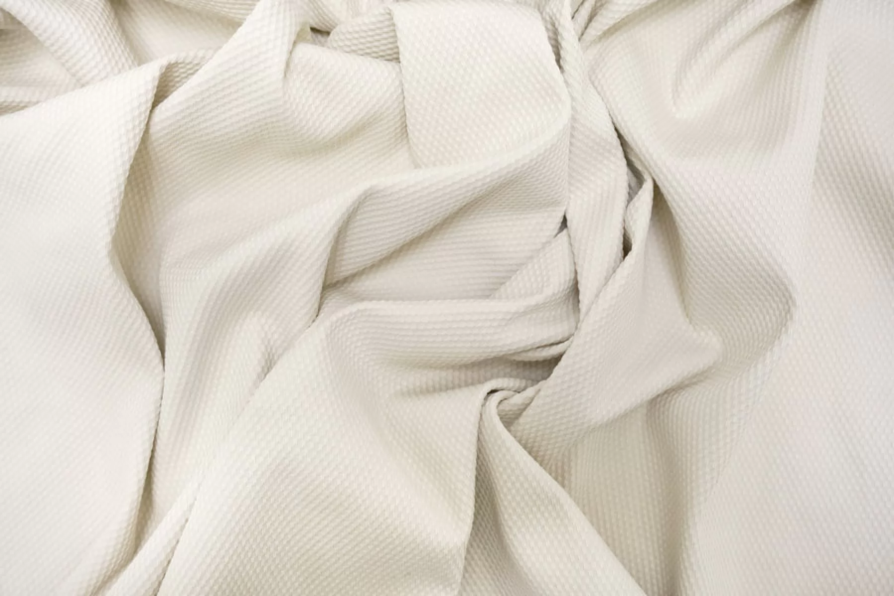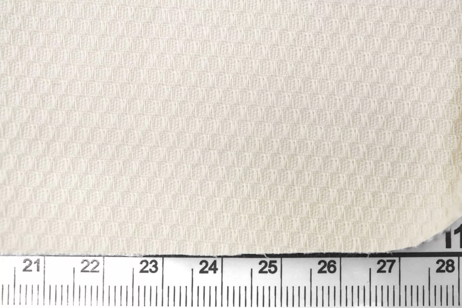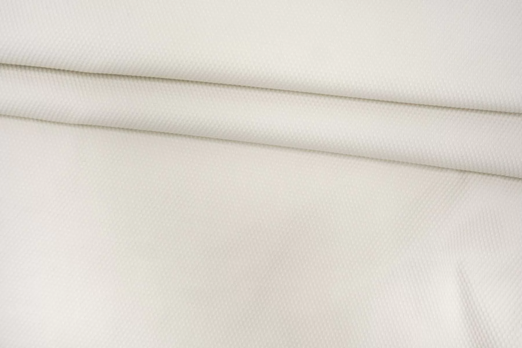 Хлопок костюмной плотности с фактурным плетением, напоминающим вафельное, в оттенке слоновой кости. Тактильно фактура ощущается, слегка суховатый. Пластичный но форму держит. Мнется, тянется, не просвечивает. Отлично подойдет для пошива летних костюмов, брюк, юбок, платьев.