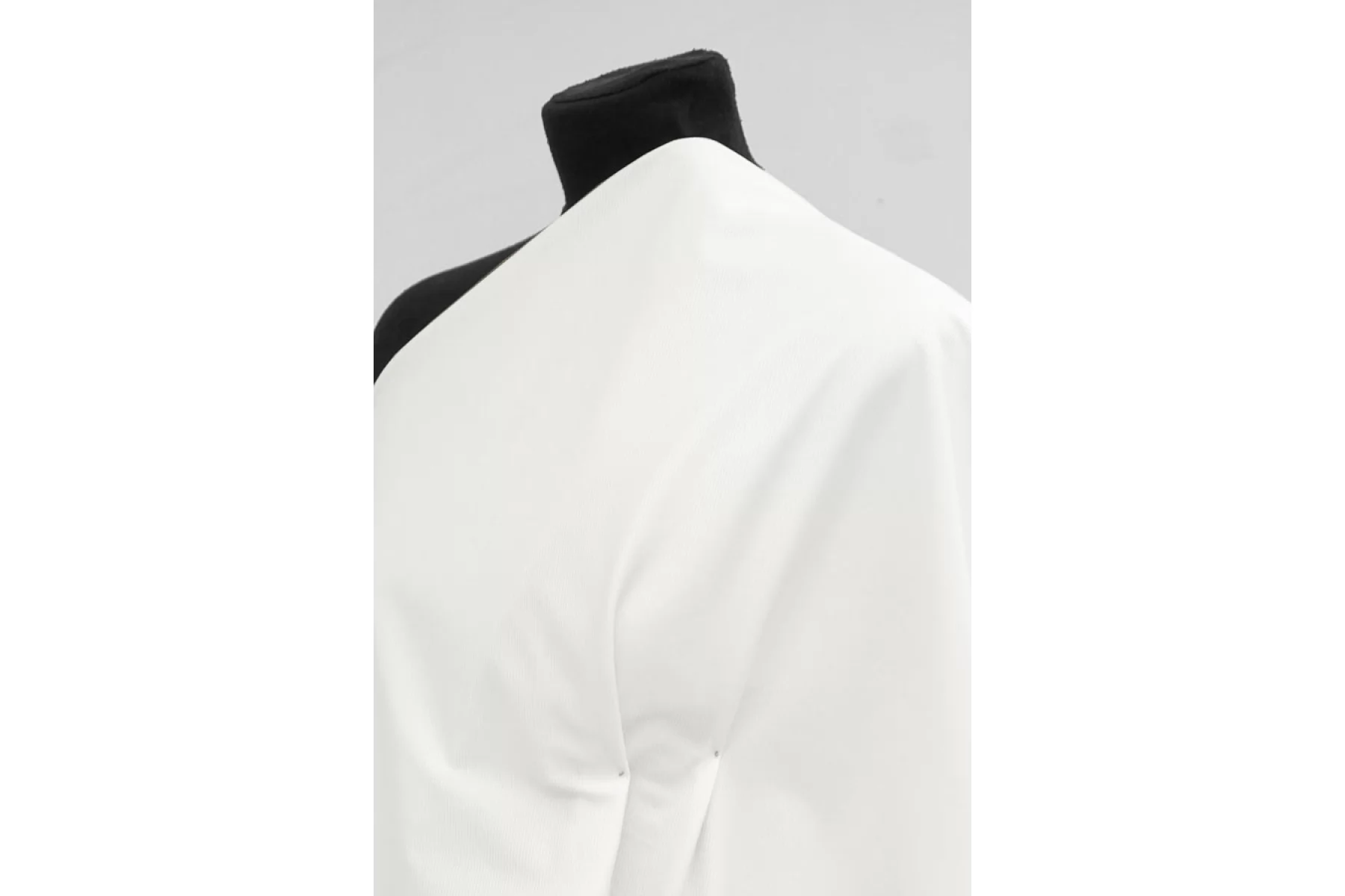 Фактурный хлопок в белом цвете с легким молочным подтоном. Материал плательно-костюмной плотности, пластичный но при этом держит форму. Мнется, тянется, немного просвечивает силуэт в один слой. Отлично подойдет для пошива платьев, летних костюмов, брюк, юбок.